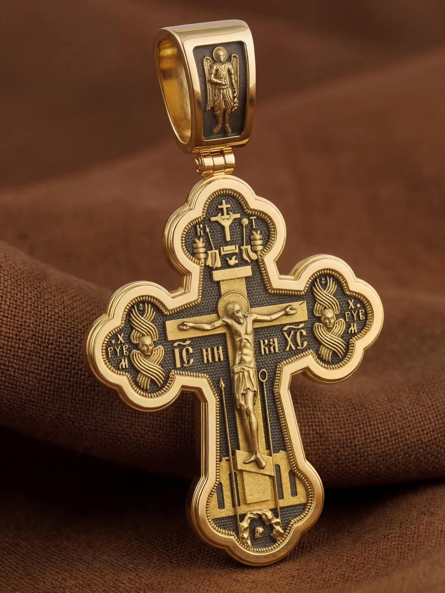 Основой композиции лицевой стороны креста является Распятие Иисуса Христа. Справа и слева от Распятия изображены Ангелы, первыми стоящие у Престола Господа — Херувимы. Под основной перекладиной рядом с титлами Святого имени Христа написано «НИКА», что значит «победитель». Сверху над Распятием помещен Голгофский Крест с цатой, рядом с которым, орудия страданий Господа — трость и копие, обозначенные буквами «Т» и «К».