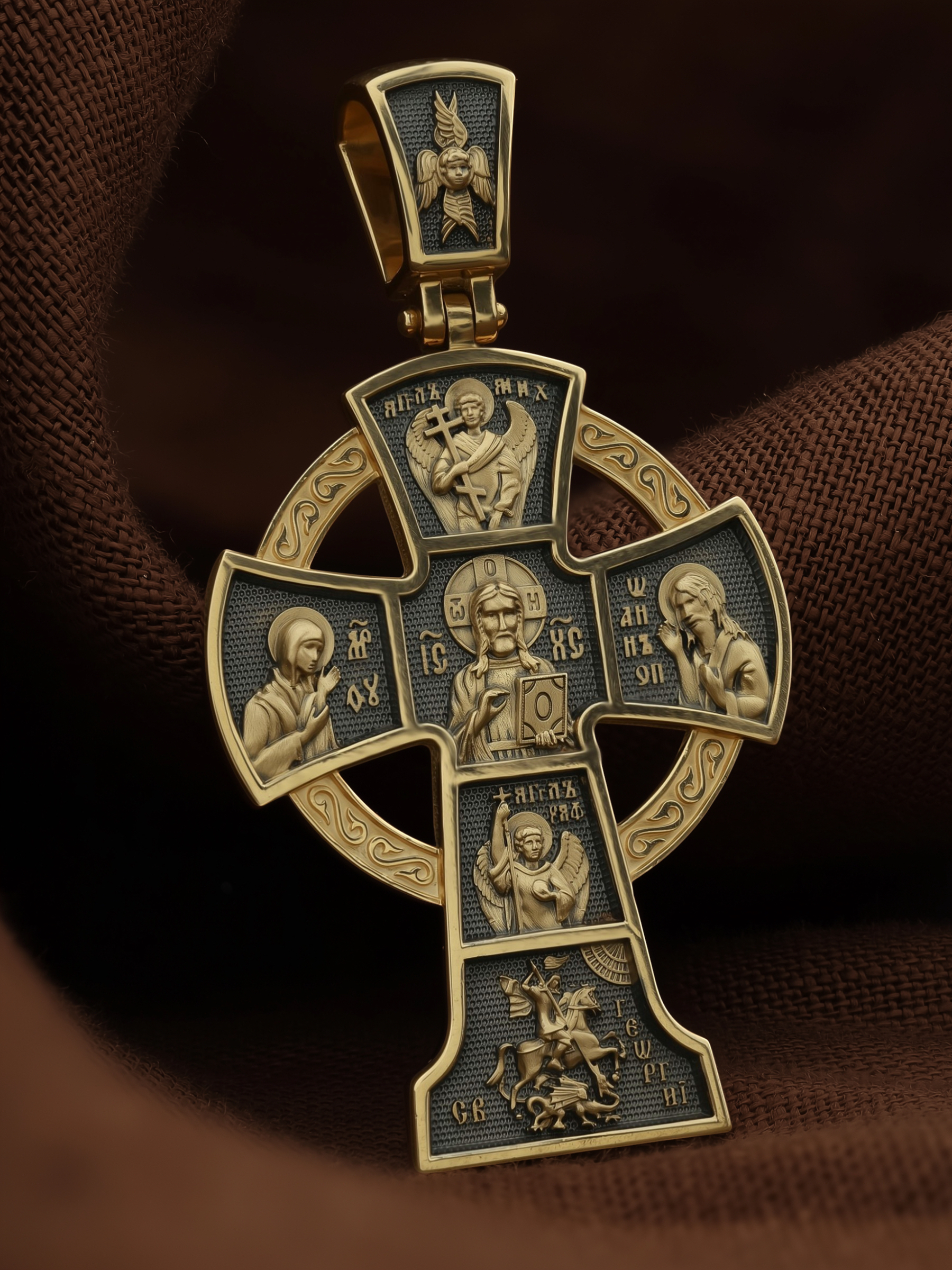 Вверху и внизу от спасителя предстоят два архангела, Михаил (Первый служитель Божественной славы, страж и защитник) и Гавриил (служитель Божественной крепости и изъявитель сокровенных Божьих тайн). Внизу помещен образ свт. Георгия Победоносца. Святой при жизни прославился не только как храбрый воин и твердый исповедник веры, но и как сострадательный, милосердный целитель и чудотворец. Святому молятся о покровительстве воинам и армии, о защите государства, сохранении и спасения России.