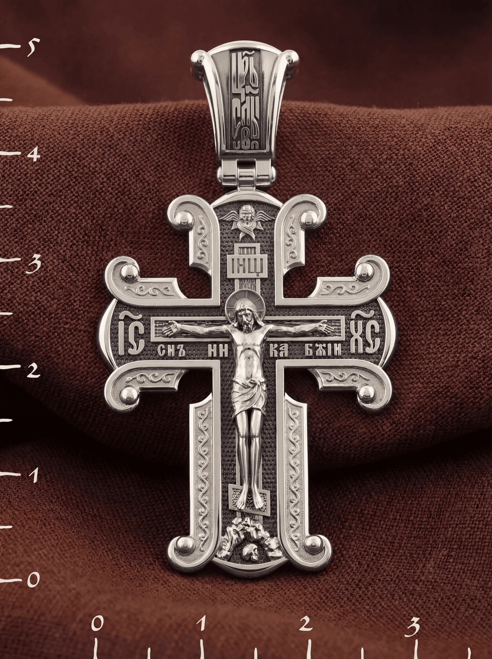 На лицевой стороне необычной формы нательного креста мы видим распятие Господне. Сам крест украшен плетением полурастительной тематики и золотым ободком, заканчивающимся завитками. На кулонном кольце с лицевой стороны надпись — Царь Славы. Под ней — шестикрылый огненный серафим, и буквы «IНЦI», означающие Иисус Назорей Царь Иудейский. С обеих сторон горизонтальной перекладины надписи — монограмма Святого имени Христа — «ИС ХС», а под ней — «НИКА» (Победитель) и «Сын Божий». В подножии мы видим изображенную гору Голгофу в виде скалистой горки с Главой Адамовой в пещере.