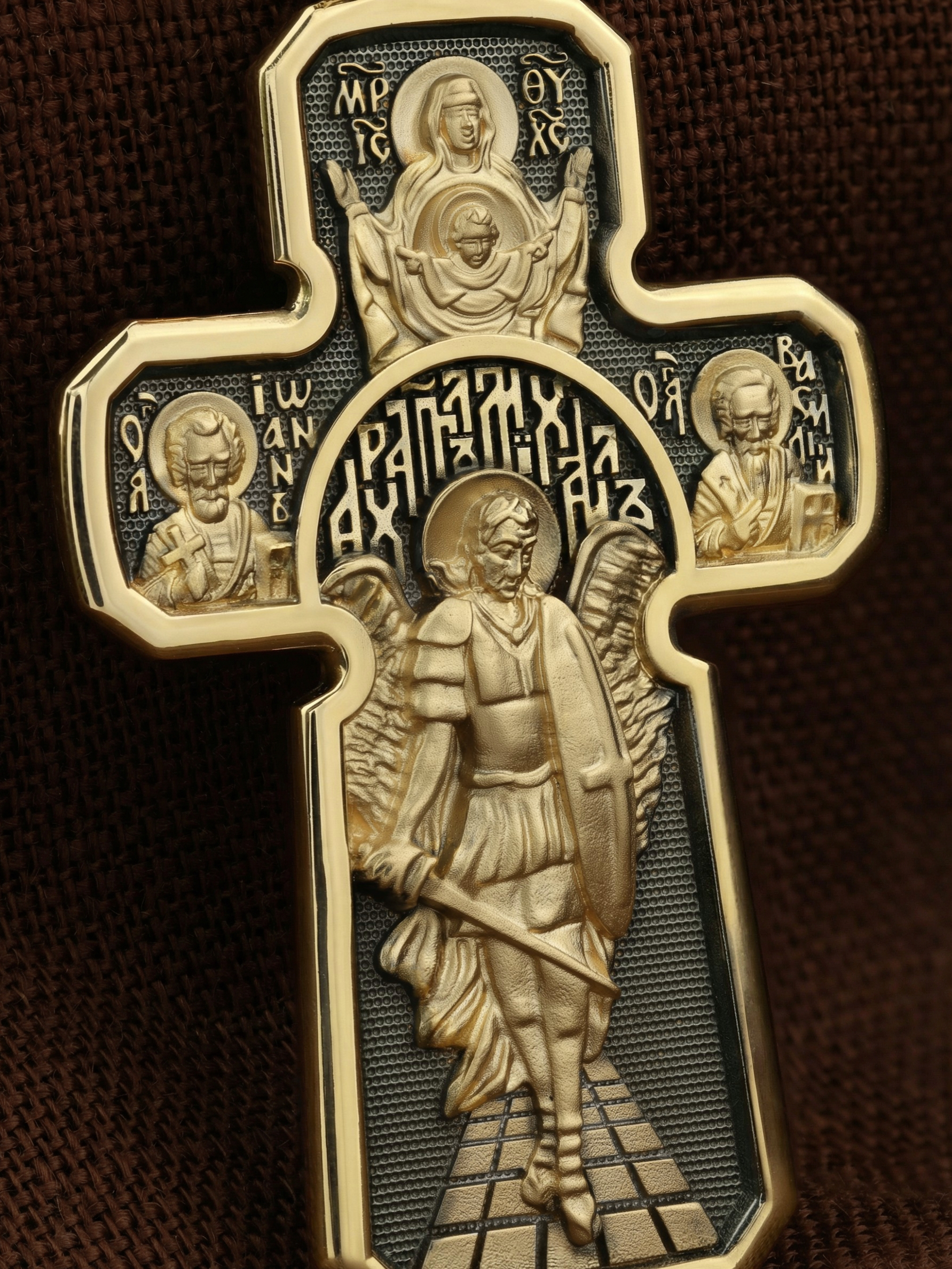 Основное поле лицевой стороны креста занято изображением рельефного Распятия на восьмиконечном Голгофском кресте с копием, тростью по сторонам и Главой Адамовой в пещере на ступенчатой Голгофе. Над крестом написаны слова Канона святому и животворящему Кресту Господню: «Кресте живоносный, ты ми буди крепость, и победа, и щит, и стена нератуема, бесов отгнание, и помыслов погашение, и ума моего сохранение».