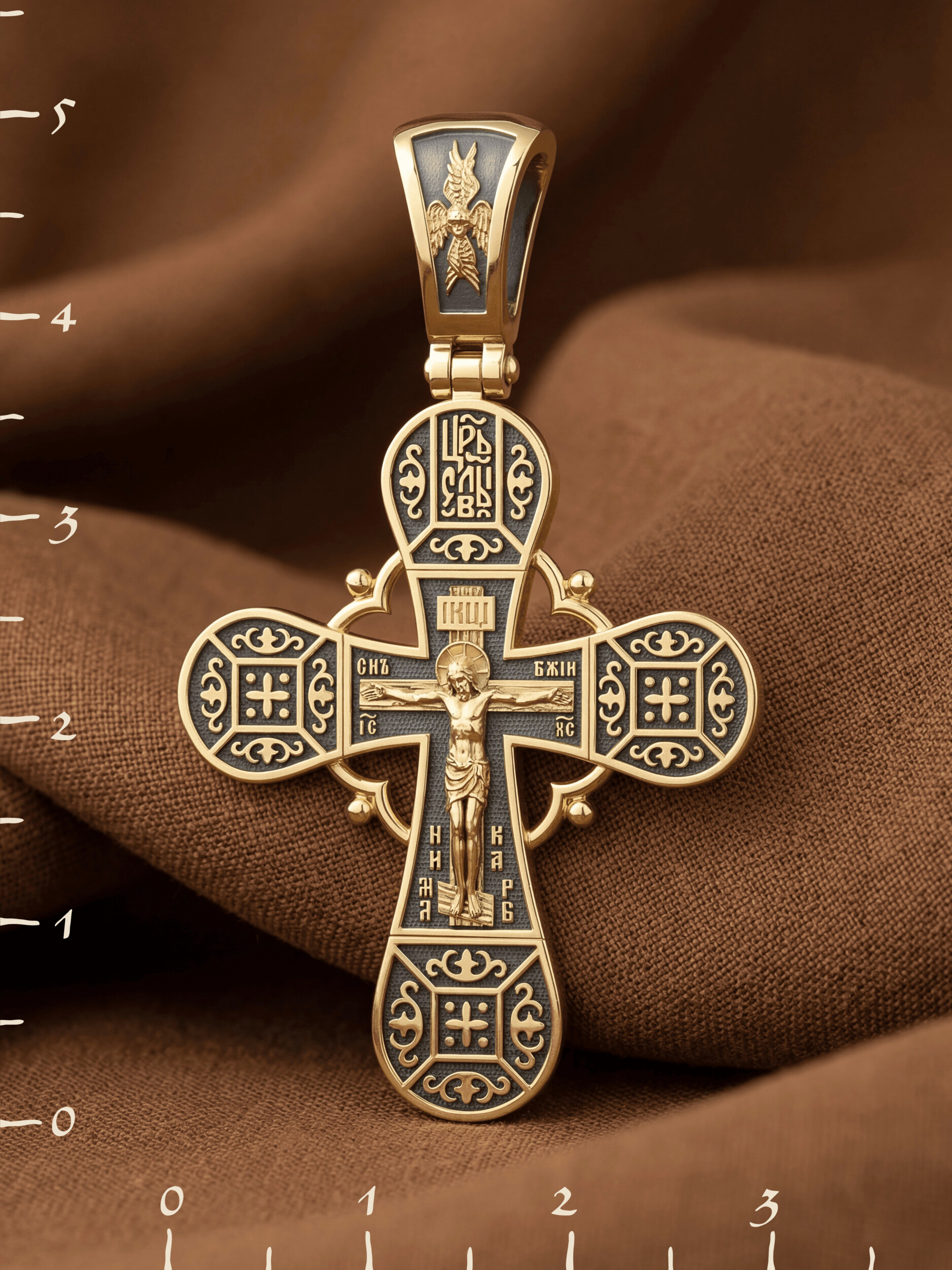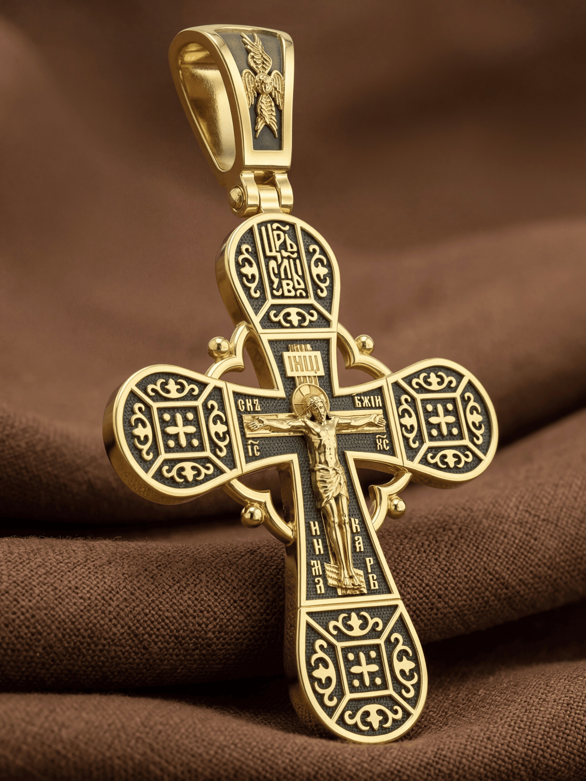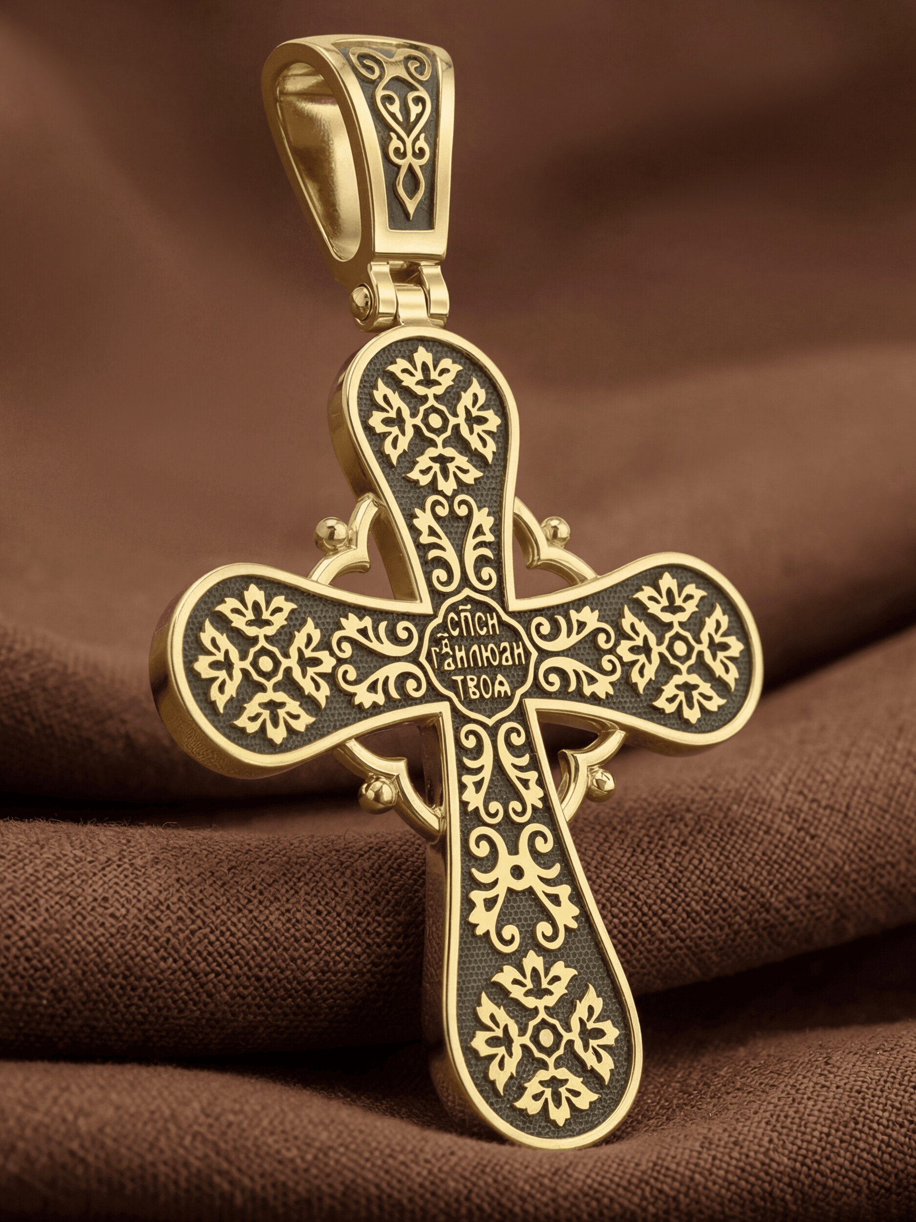 На лицевой стороне креста изображено Распятие Иисуса Христа. Позади Его изображена иерусалимская стена, знак того, что Господь был распят вне стен города. Но вместе с тем стена знаменует и Небесный Иерусалим, путь в который открылся для человечества через Голгофу: «МЛРБ», «Место Лобное Рай Бысть» — написано у ее основания. Рядом с Его образом помещены слова «Царь Славы». Эти слова характеризуют Господа как Великого Архиерея, победителя смерти. Верхняя перекладина символизирует титло — табличку, на которой, согласно Евангелию, было начертано: «Иисус Назорей Царь Иудейский» (IНЦI). Также Распятие сопровождается надписями, олицетворяющими Христа. Это святое имя Христа «IC» (Иисус) «ХС» (Христос), и словосочетание «Сын Божий», а так же написан тропарь Животворящему Кресту: «Кресту Твоему поклоняемся, Владыко, и святое воскресение Твое славим». Распятие стоит на горе камней, символизирующих Голгофу, в основании которой различается череп. Это голова Адама.