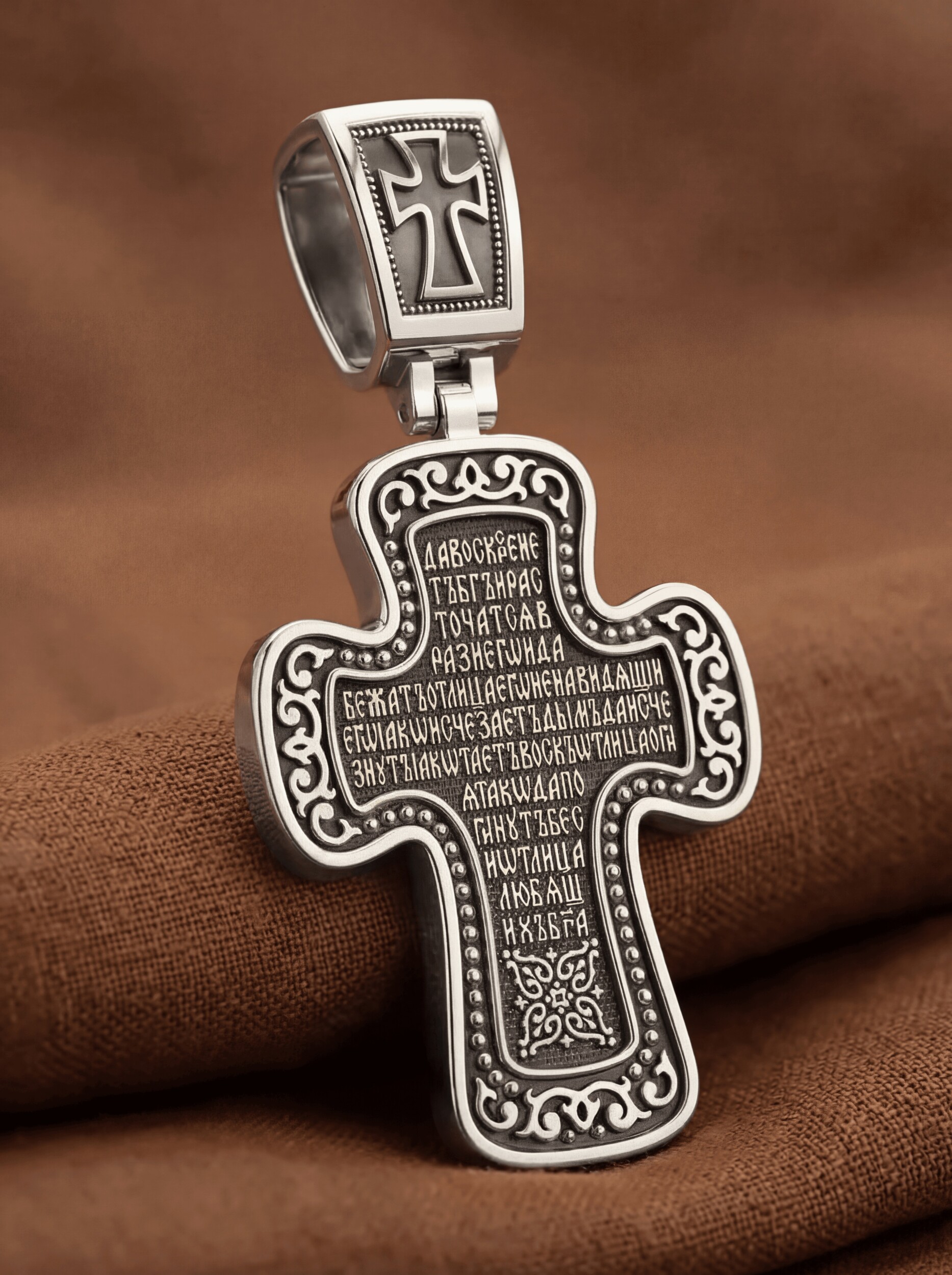 На обороте креста написаны слова молитвы «Да воскреснет Бог» (Псалом 67): «Да воскреснет Бог, и расточатся врази Его, и да бежат от лица Его ненавидящии Его. Яко исчезает дым, да исчезнут; яко тает воск от лица огня, тако да погибнут беси от лица любящих Бога.»