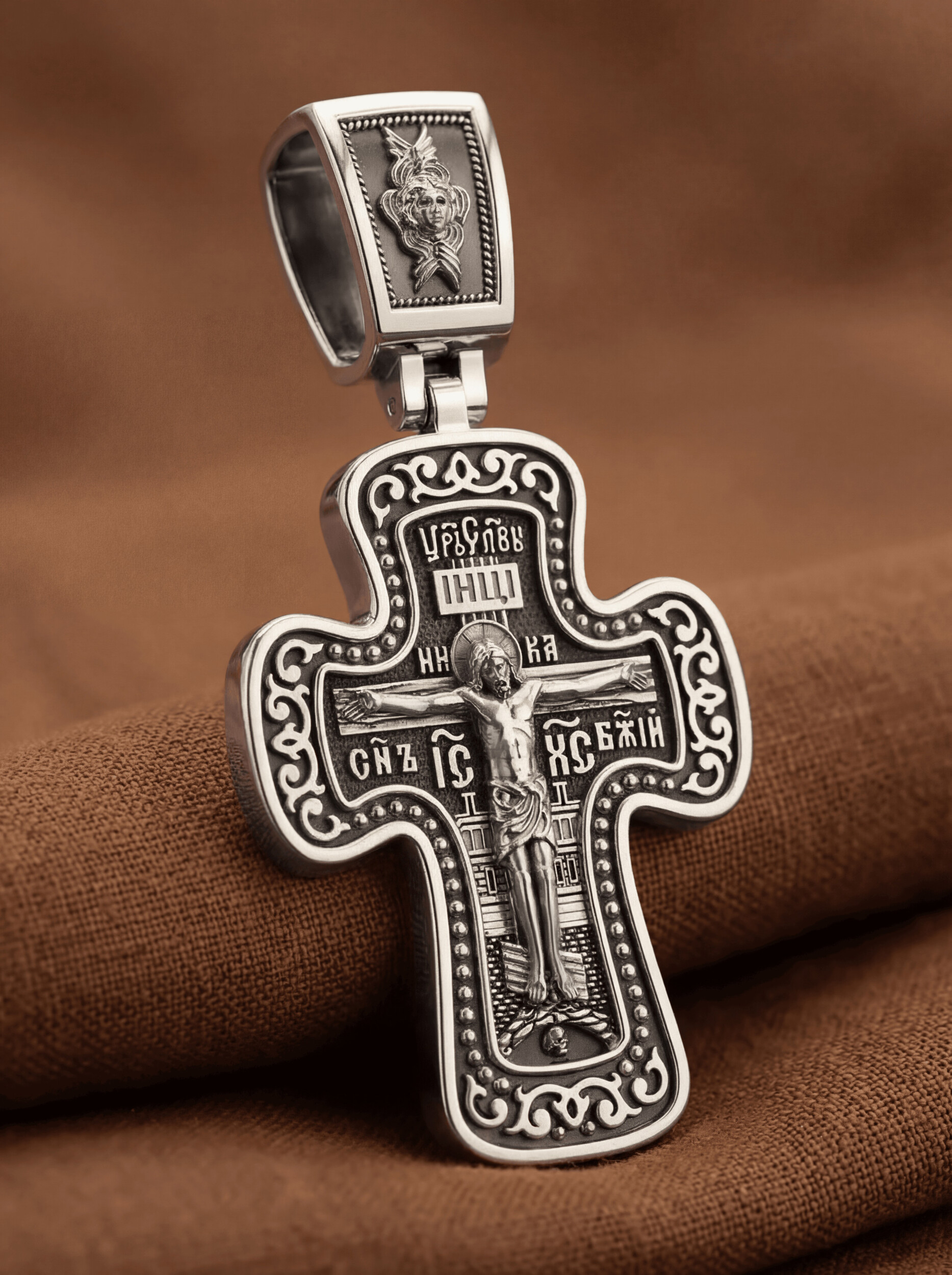 Распятие сопровождается каноническими надписями. Это святое имя Христа, которое принято писать на иконах сокращенно — «ИС ХС», словосочетание «СЫН БОЖИЙ», что означает божественную природу Иисуса Христа. Рядом с Его образом помещены слова «Царь Славы». Над головой Господа на поперечной перекладине аббревиатура «IНЦI», что символизирует табличку, которая была прибита к Кресту, с надписью «Иисус Назорей Царь Иудейский». На кулонном кольце помещено изображение Серафима.