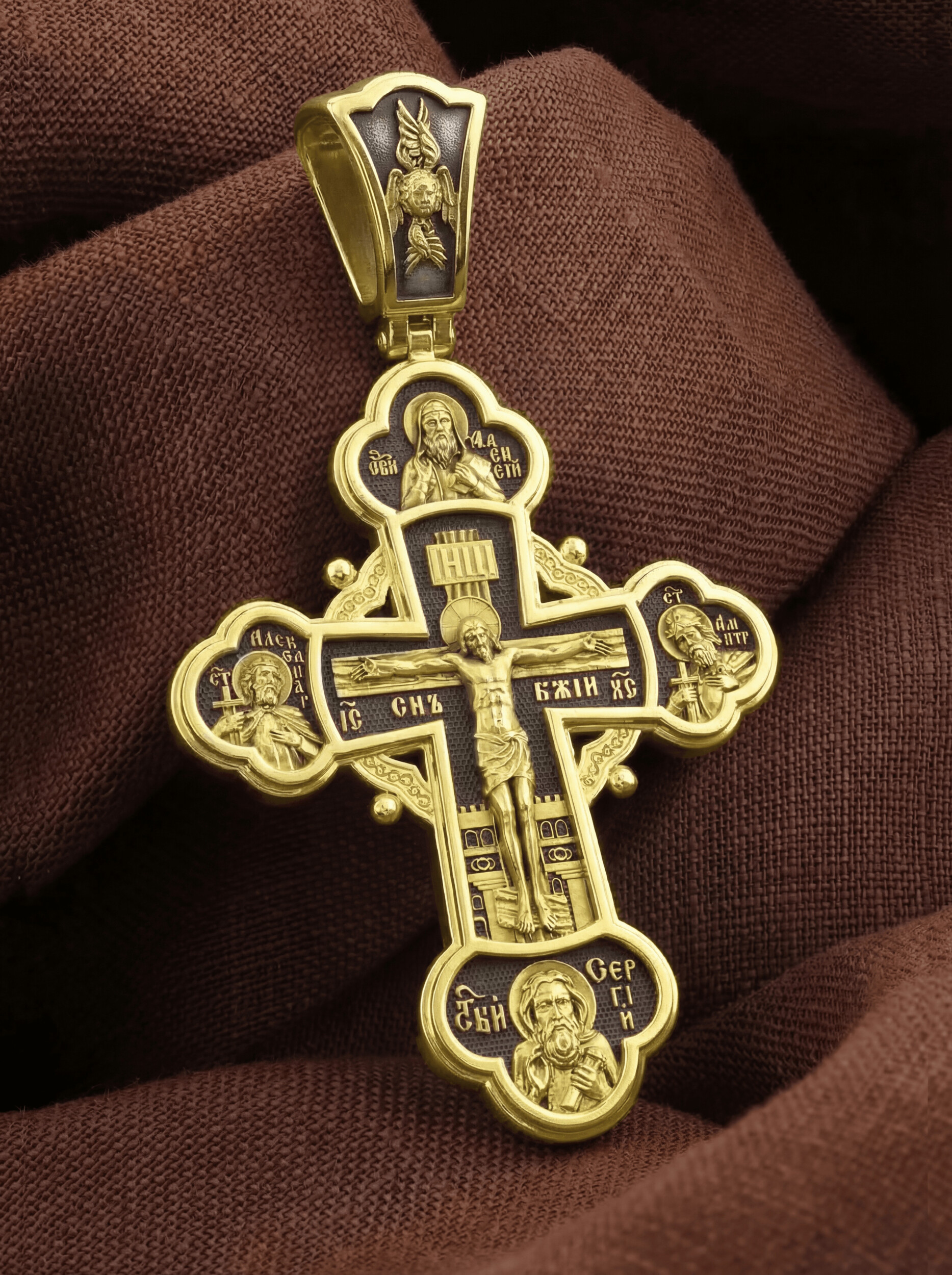 На лицевой стороне креста в центре изображено Распятие Господа Иисуса Христа. Слева от Господа находится святой благоверный князь Александр Невский, справа — святой благоверный князь Димитрий Донской. Святые князья почитаются как покровители воинов и защитники от врагов телесных и душевных. Вверху и над Распятием — образ митрополита московского святителя Алексия. Он почитается как помощник в воспитании детей и целитель, особенно при болезни глаз. Внизу — икона преподобного Сергия Радонежского, великого чудотворца и целителя. К нему обращаются в различных болезнях, тяжелых жизненных ситуациях, а также когда у детей возникают сложности в обучении.