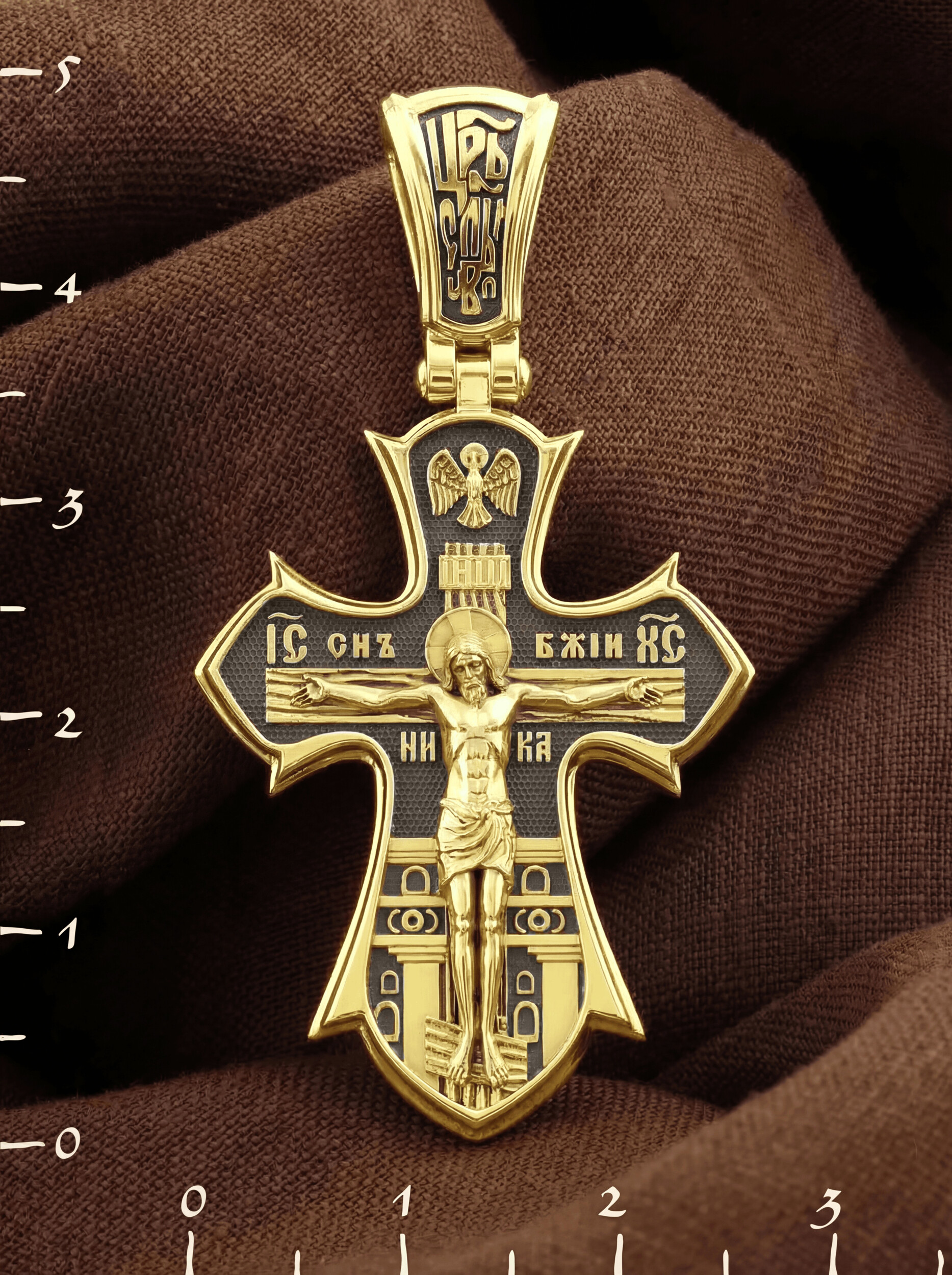 На лицевой стороне креста изображено Распятие Иисуса Христа. Господь представлен свободно покоящимся на кресте с простертыми руками и как бы обнимающим всю Вселенную. Он — Спаситель, искупивший грехи мира, «поправший смертию смерть» и призывающий к Себе «все концы земли». Поэтому рядом с Его образом помещены слова — «НИКА» и «Царь Славы». Эти слова характеризуют Господа как Великого Архиерея, победителя смерти. Верхняя перекладина символизирует титло — табличку, на которой, согласно Евангелию, было начертано: Иисус Назорей Царь Иудейский (IНЦI). Также Распятие сопровождается надписями, олицетворяющими Христа. Это святое имя Христа «IC» (Иисус) «ХС» (Христос), и словосочетание «СЫН БОЖИЙ».