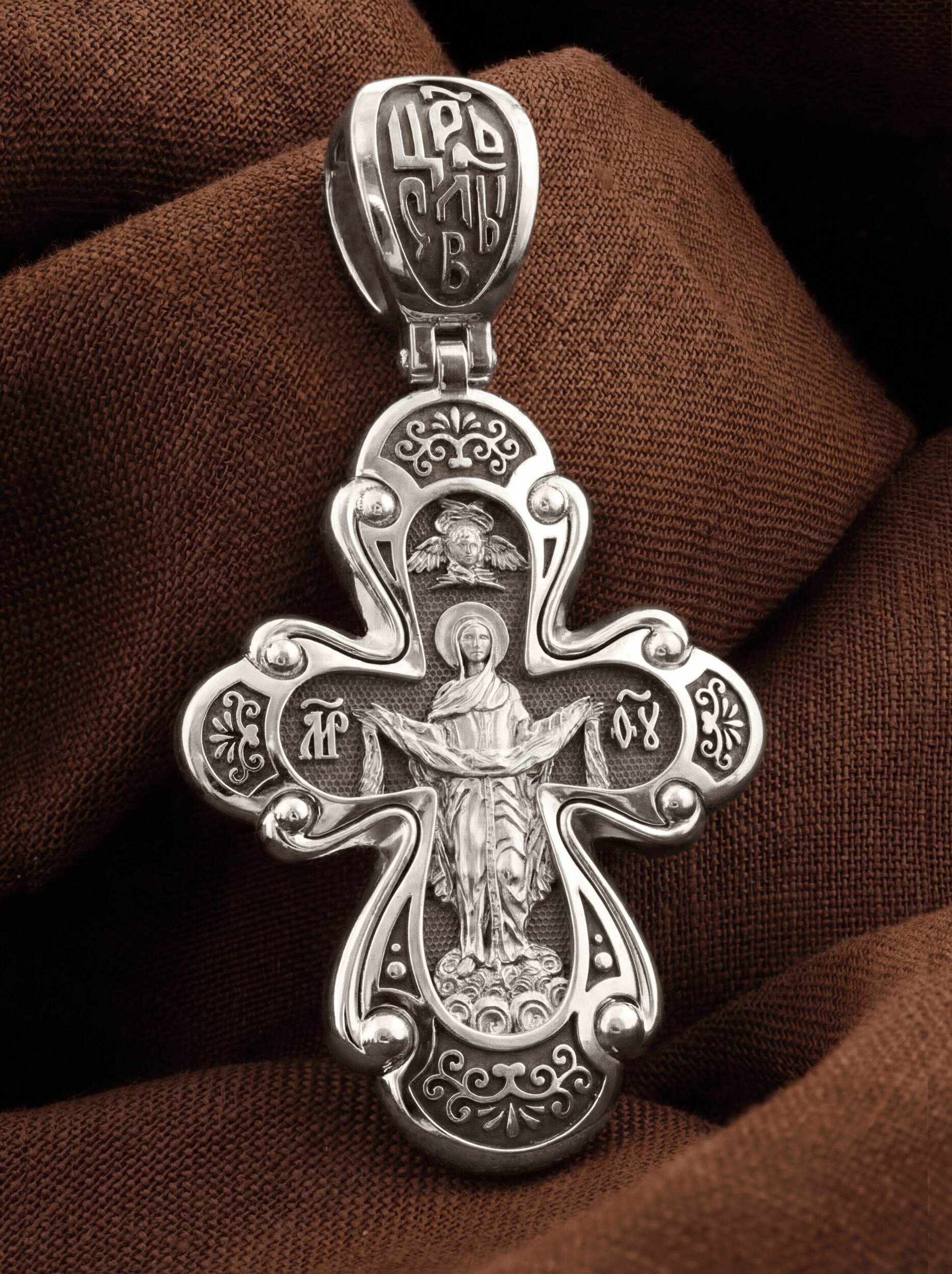 На обороте креста изображена икона Покрова Пресвятой Богородицы. Праздник Покрова Божией Матери является воспоминанием чуда, которое произошло во Влахнернской церкви 1 (14) октября 910 года: Пресвятая Богородица явилась верующим над алтарем храма и распростерла над ними Свое покрывало. В этот день Божья Матерь открыла людям, что Она является Ходатаицей за них перед Богом. Богородица простирает Свой молитвенный покров над всеми православными христианами и умоляет Сына Своего о даровании вечного спасения каждому человеку. Над образом изображен крылатый Серафим.