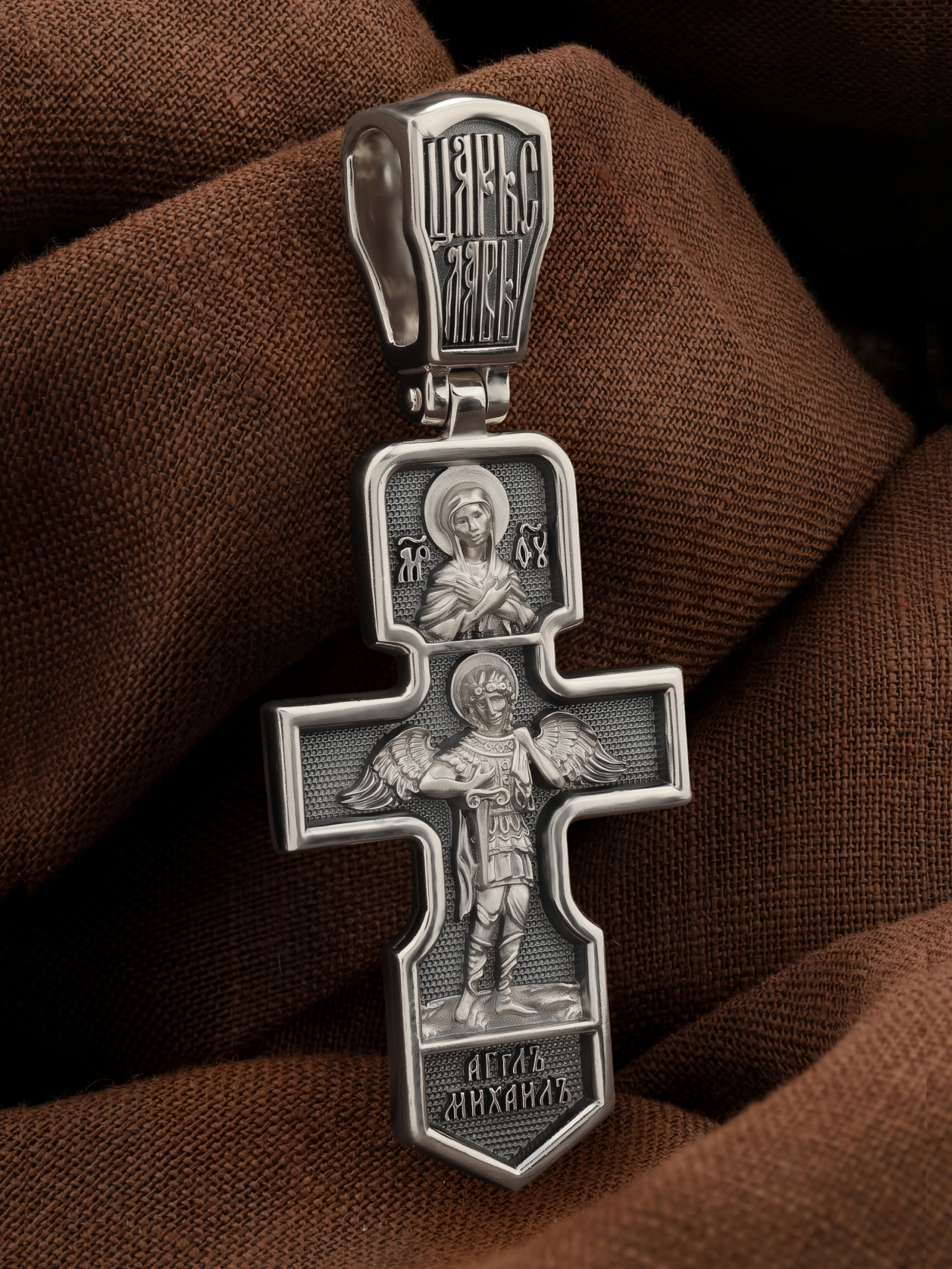 В центре оборота креста изображен Архистратиг Михаил. Могучий Архангел почитается как покровитель воинов и всех верных Богу и ведущих борьбу против сил зла, а также защитник душ умерших, страж райских врат. Над ним изображена икона Божией Матери «Радость всех радостей» или «Серафимово Умиление». Почитание иконы связано с именем преп. Серафима Саровского (1759−1833, канонизирован в 1903 г.). Вся его жизнь проходила под покровительством Богоматери. Богоматерь неоднократно являлась ему в видениях, исцеляла от смертельных болезней. У преп. Серафима было несколько икон Богоматери. Среди них особое место занимала келейная икона, называемая Умиление, которую старец именовал также «Радость всех радостей». Перед нею, стоя на коленях в молитве, он скончался. После смерти преп. Серафима игумен Нифонт передал образ в близлежащий Дивеевский женский монастырь, находившийся под покровительством старца Серафима.