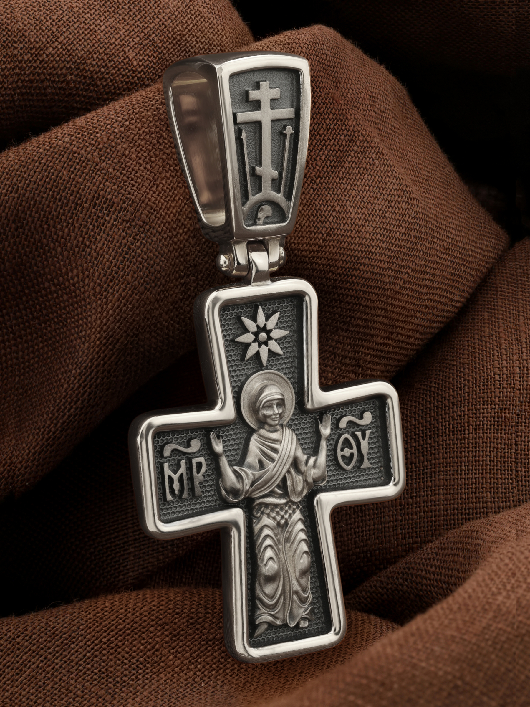На лицевой стороне креста изображена икона Господа и Спасителя нашего Иисуса Христа  — Господь Вседержитель или Пантократор. Он представлен как Царь Небесный и будущий Судия мира. Именование Иисуса «Вседержителем» указывает, с одной стороны, на Его Божественную природу: «Аз есмь Альфа и Омега, начало и конец, говорит Господь, Который есть и был и грядет, Вседержитель» (Откр. 1: 8). С другой стороны, такое именование связано и с человеческой природой Христа, искупившего крестной жертвой людские грехи и обновившего тем самым человеческую природу. Правой рукой Он благословляет, а левой держит Книгу. Она символизирует Евангелие — благую весть, принесенную Христом всему миру. Указывая на раскрытое Евангелие и одновременно благословляя, Иисус недвусмысленно указывает нам путь к спасению души.