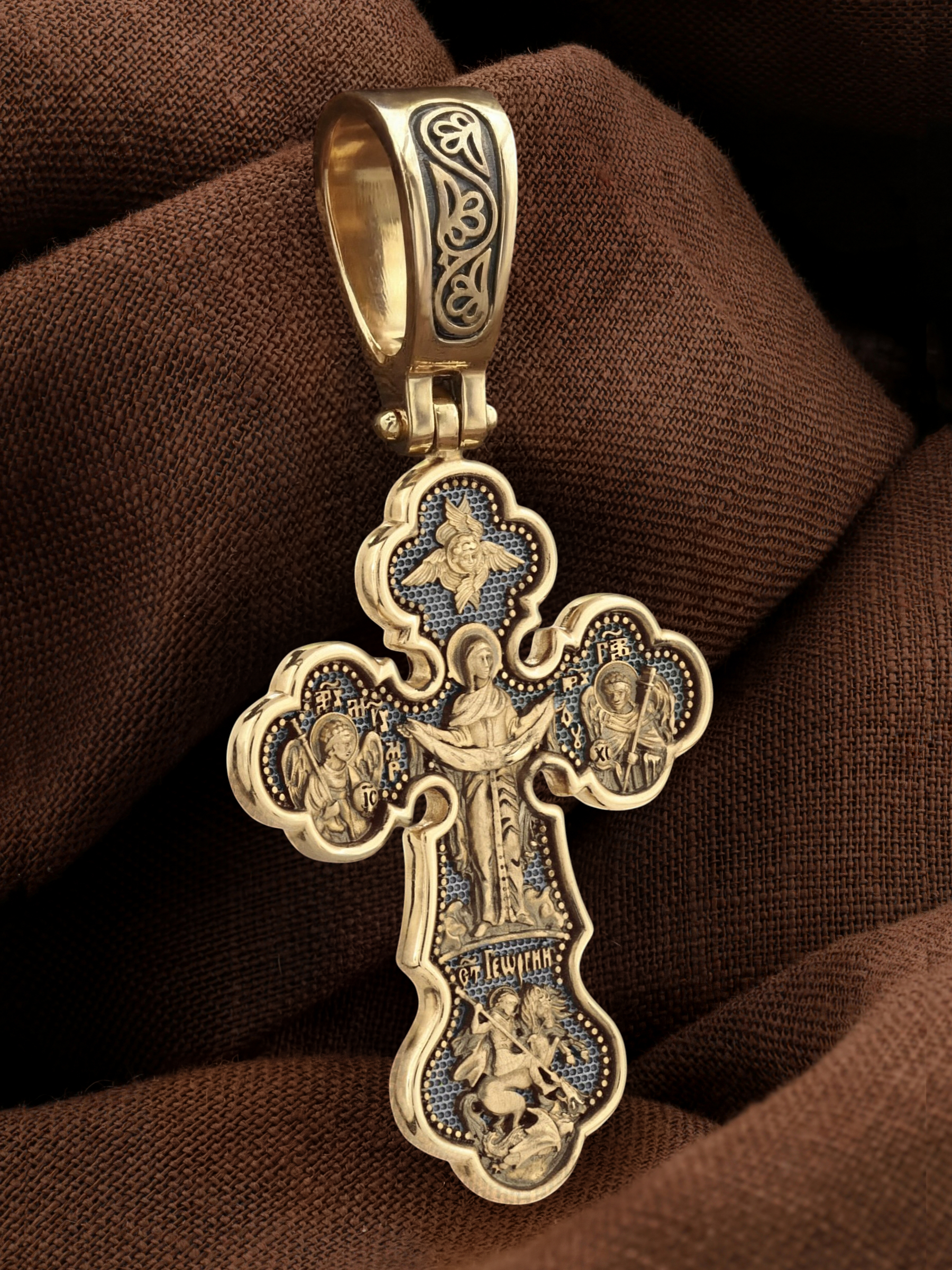 Центральную часть оборотной стороны креста украшает икона Божией Матери «Покров Пресвятой Богородицы». Праздник Покрова Пресвятой Богородицы пришел на Русь в XII веке из Византии и стал одним из самых почитаемых. Пресвятая Богородица простирает Свой молитвенный покров над всеми православными христианами и умоляет Сына своего о даровании вечного спасения каждому человеку. Над образом помещен шестикрылый Серафим. Справа помещено изображение Архангела Гавриила, слева- Архангела Михаила. На кресте внизу помещено изображение Святого Великомученика Георгия Победоносца — одного из самых почитаемых и удивительных святых. Он изображен как воитель, сидящий на вздыбленном коне и поражающий копьем огнедышащего змея. Змей символизирует собою сатанинские силы.