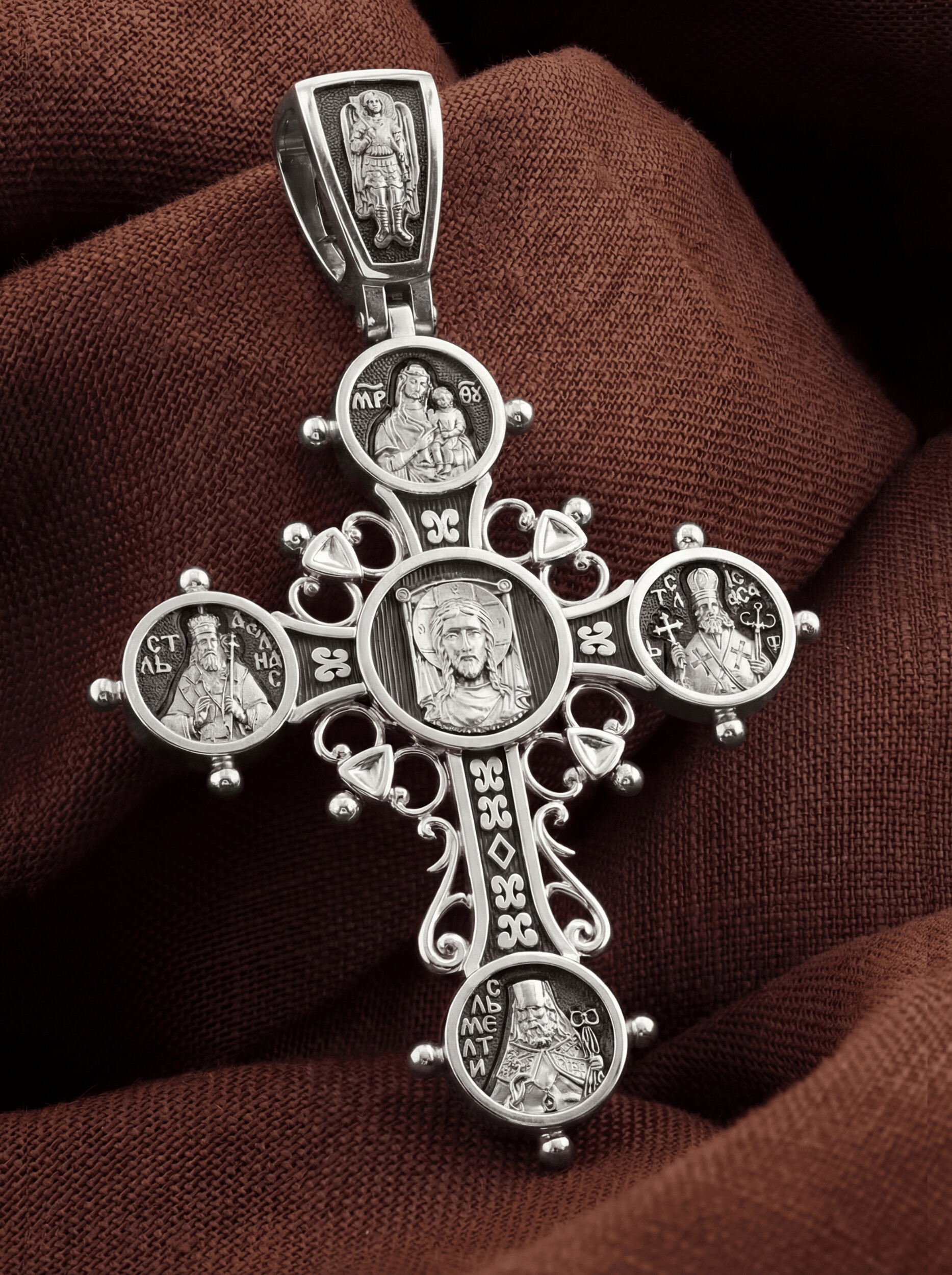 Соединенные вместе крест и круг созидают всеобъемлющий образ мирозданья. Оно объединяется во Христе, образ которого мы видим по центру. Иисус Христос, могущественный и милосердный Царь и Бог.