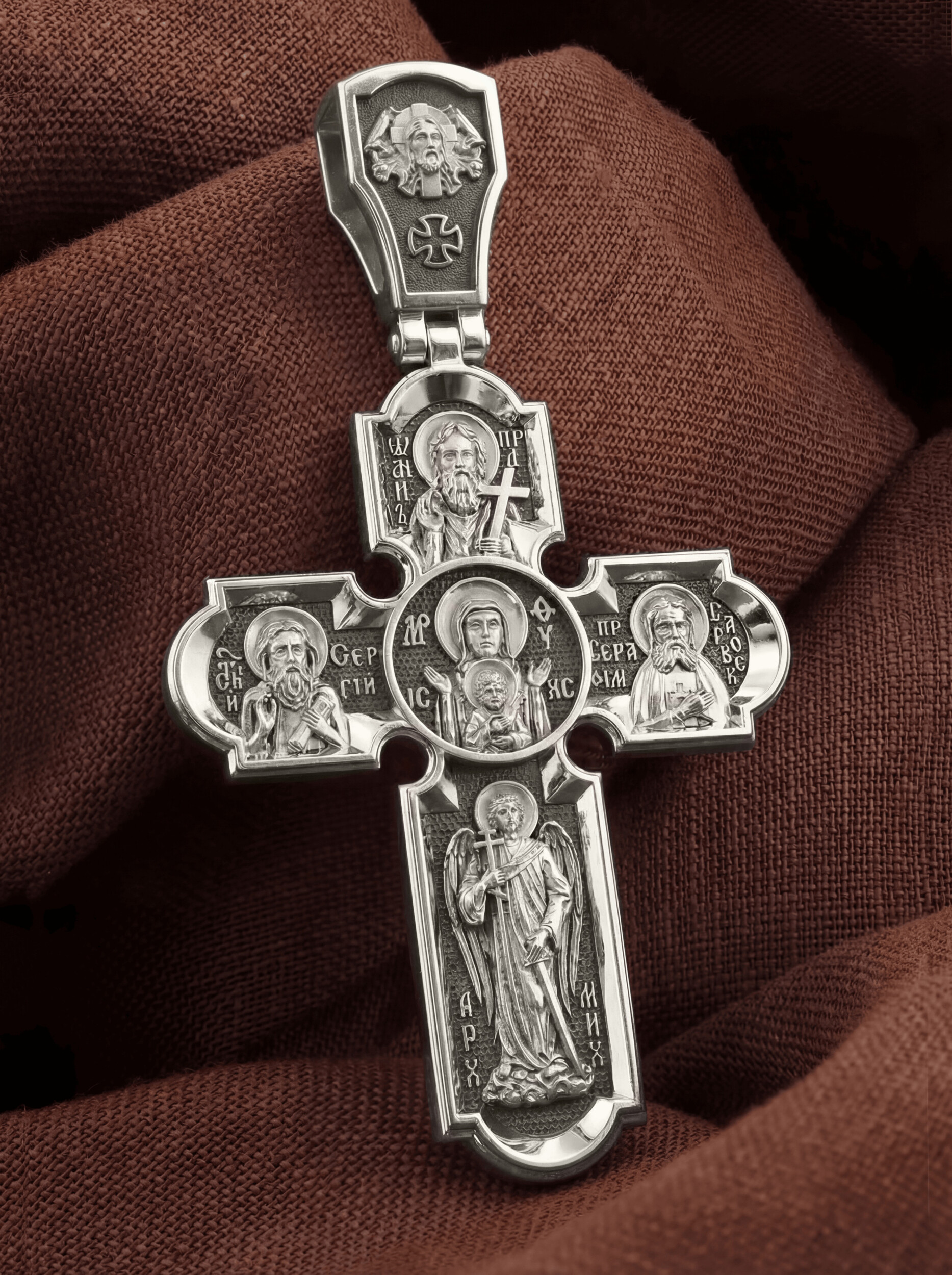 Центральную часть оборота креста украшает икона Божией Матери «Знамение». Икона «Знамение» написана по пророчеству пророка Исайи, предрекшего, что Господь Иисус Христос родится от Девы. На кресте внизу изображен Архангел Михаил, слева — прп. Сергий Радонежский, справа — образ Преподобного Серафима Саровского, вверху — последний пророк, почитающийся в христианстве, Предтеча Господень Иоанн Креститель. На кулонном кольце помещено изображение Спаса Нерукотворного — образ Спасителя, который Он запечатлел на плате и передал для исцеления больному проказой царю Эдессы. Ему придается победное и защитное значение.