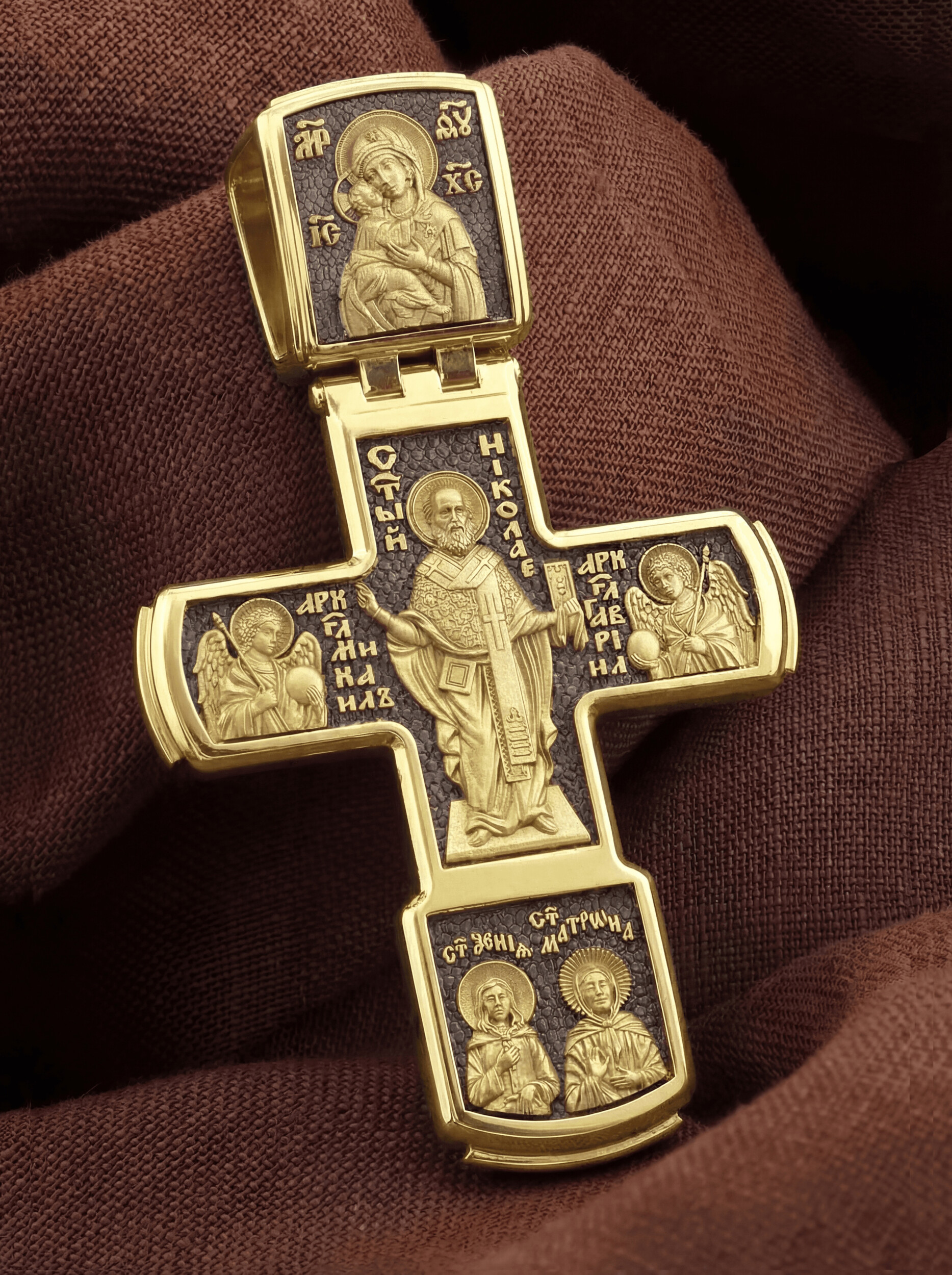 В центре на обороте — самый почитаемый в Православной Церкви святой, Николай Чудотворец, которого еще называют Николай Угодник за то, что он угодил своей жизнью Богу. Ему молятся, отправляясь в путешествие, особенно по морю, просят исцеления в различных недугах, помощи в торговых делах, учебе и поисках достойного супруга. С двух сторон от Николая Чудотворца помещены образы архангелов Михаила и Гавриила. Вверху — Владимирская икона Божией Матери — самая великая русская святыня, многие века бывшая олицетворением нашей земли. Перед ней венчались на царство государи, избирались патриархи. Пречистой Богородице Владимирской клялись в верности Отечеству солдаты и за нее умирали на поле брани. Именно на ее защиту более всего уповала Россия в самые страшные периоды своей истории. В нижнем клейме — иконы двух святых помощниц от всех недугов, блаженных Ксении Петербургской и Матроны Московской.