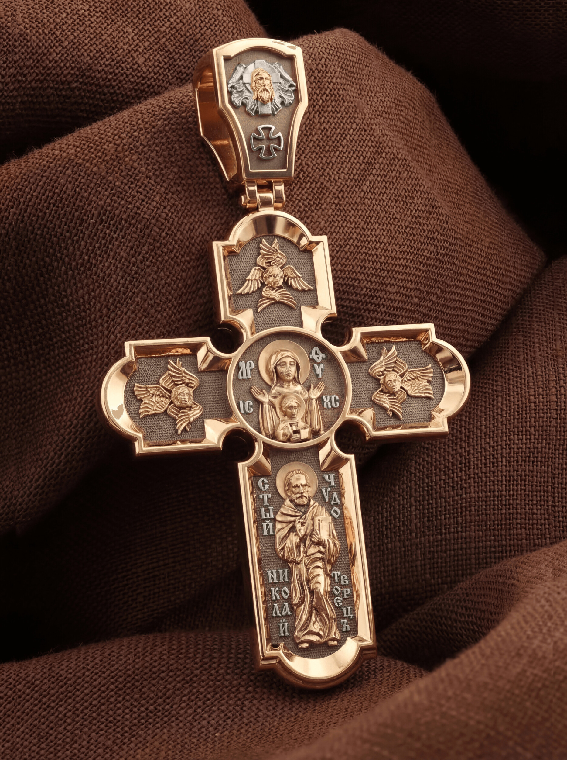 У основания креста в полный рост изображен самый любимый святой Православной Церкви — Николай Чудотворец. Святой почитается как целитель болезней, покровитель путешествующих, особенно по морю, помощник в торговле, учебе, а также в поисках достойного супруга.