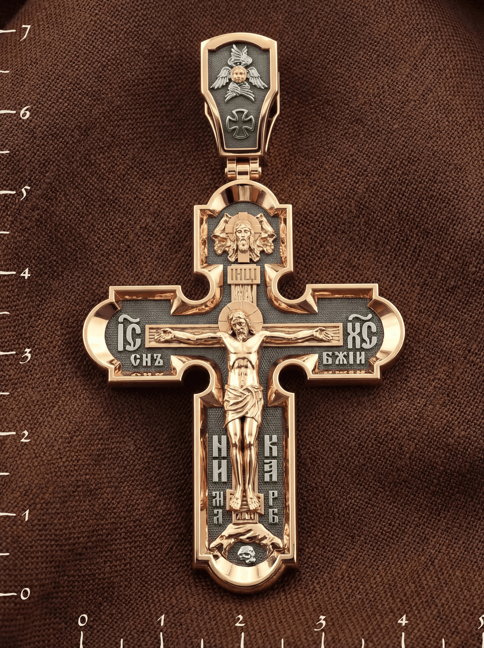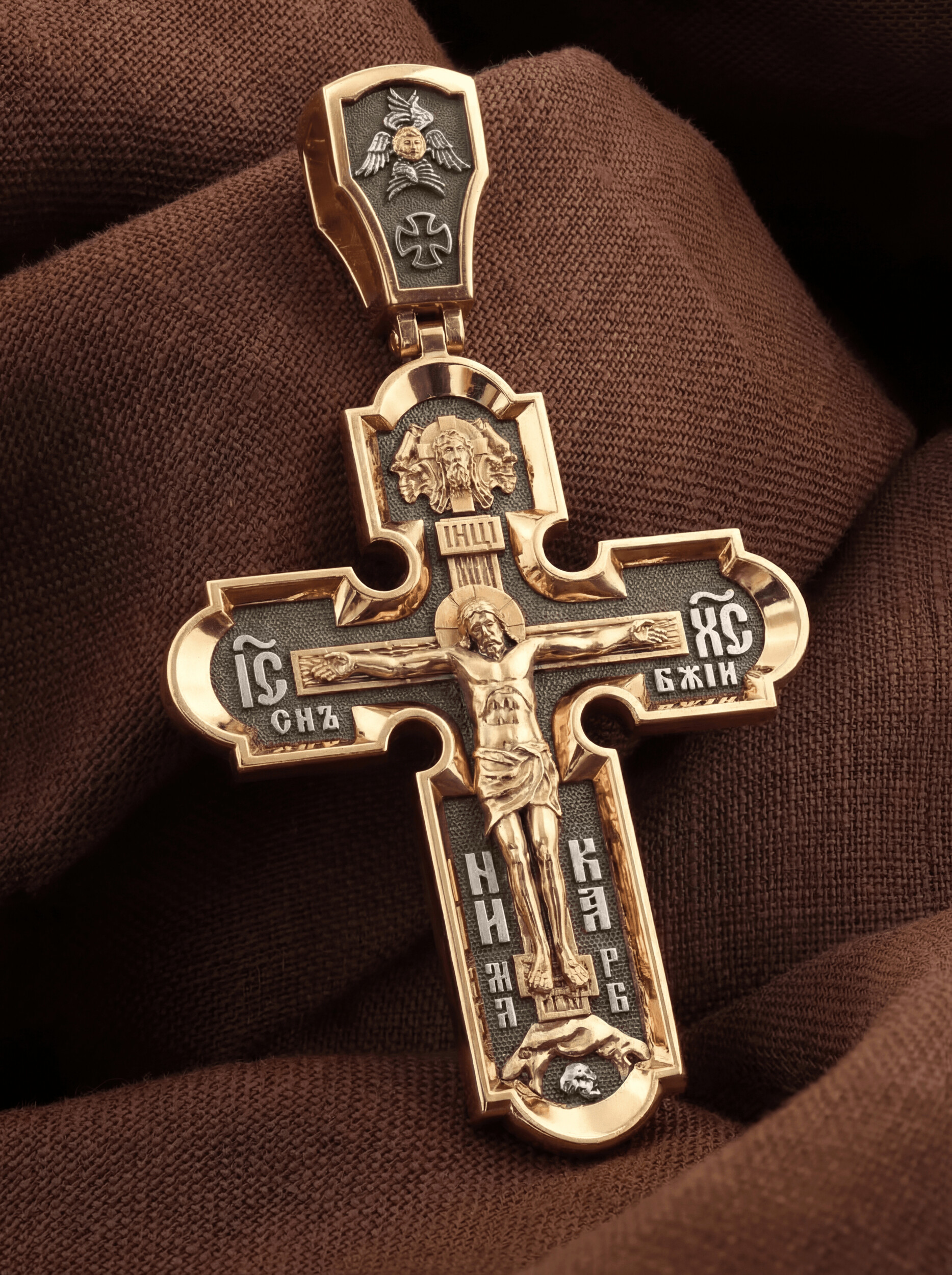 На лицевой стороне нательного креста по традиции изображено Распятие Господа нашего Иисуса Христа. Крест Господень стоит на небольшом каменистом возвышении, символизирующем гору Голгофу, которая обозначена буквами МЛРБ (Место Лобное Рай Бысть). Над головой Господа на поперечной перекладине написано «ИНЦИ», что символизирует табличку, которая была прибита к Кресту, с надписью «Иисус Назорей Царь Иудейский». Этим иудеи хотели посмеяться над Христом, не зная, что распинают истинного Царя всех царей. По сторонам основной перекладины расположены позолоченные рельефные инициалы Христа «ИС ХС». Под перекладиной, по сторонам древа, находится надпись «СЫН БОЖИЙ», а в основании креста — надпись «НИКА» (Победитель).