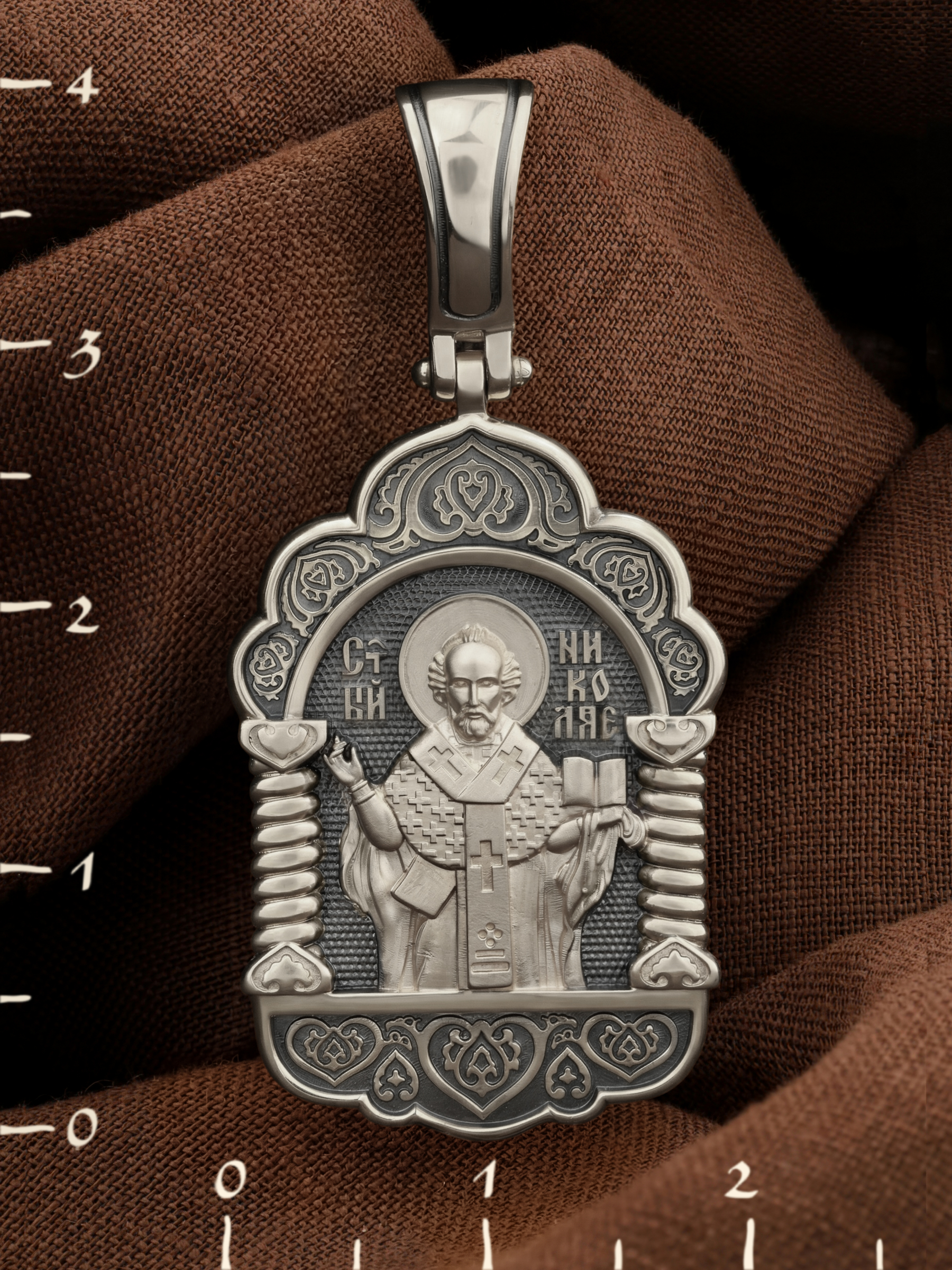 На лицевой стороне образка изображен Святитель Николай архиепископ Мир Ликийских, Чудотворец. Он является одним из самых почитаемых святых в православном мире. Святитель Николай родился во второй половине III века в Малой Азии в Ликийском городе Патары. С рождения Божий Угодник проявлял необыкновенные дарования. Сохранилось Предание, что во время крещения он, никем не поддерживаемый, простоял в купели три часа. Приняв сан священника, святитель Николай стал проводить еще более строгую подвижническую жизнь. Из­бран­ник Бо­жий Ни­ко­лай стал вершиной всех доб­ро­де­те­лей, подня­той до рай­ской вы­со­ты. С кем из ве­ли­чай­ших пра­вед­ни­ков не срав­нял­ся он об­ра­зом ду­хов­ной кра­со­ты, ко­му из них не по­сле­до­вал в сво­их де­я­ни­ях и чудотворениях? Вся жизнь святого Николая — это служение Богу. Много великих и преславных чудес сотворил великий Святитель Николай Угодник. Он помогал сущим в бедах, укрощал штормы, спасал от потопления и выносил на сушу из глубины морской, освобождал из плена и приносил освобожденных домой, избавлял от уз и темницы, защищал от посечения мечом, освобождал от смерти и подавал многим различные исцеления, слепым прозрение, хромым хождение, глухим слух, немым дар слова.