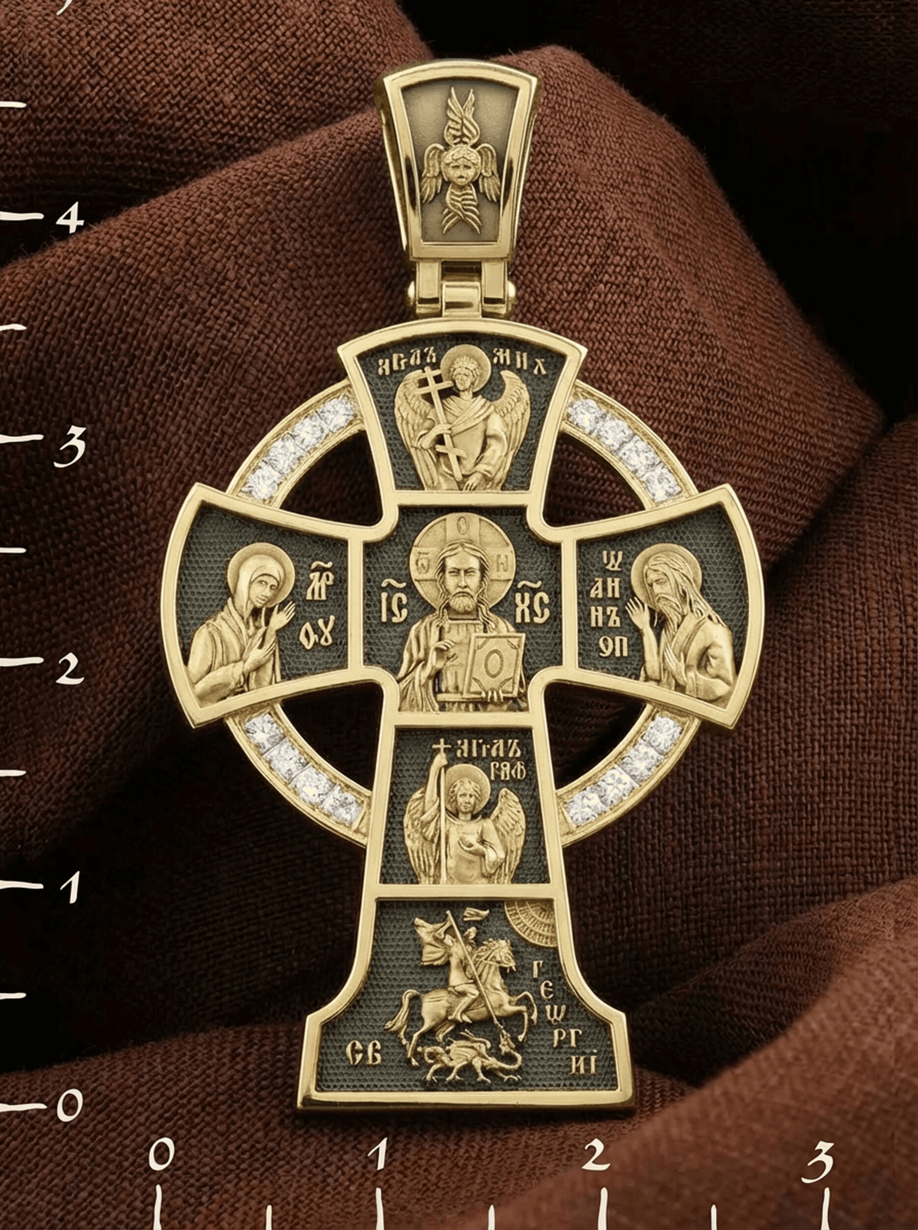 Вверху и внизу от спасителя предстоят два архангела, Михаил (Первый служитель Божественной славы, страж и защитник) и Гавриил (служитель Божественной крепости и изъявитель сокровенных Божьих тайн). Внизу помещен образ свт. Георгия Победоносца. Святой при жизни прославился не только как храбрый воин и твердый исповедник веры, но и как сострадательный, милосердный целитель и чудотворец. Святому молятся о покровительстве воинам и армии, о защите государства, сохранении и спасения России.