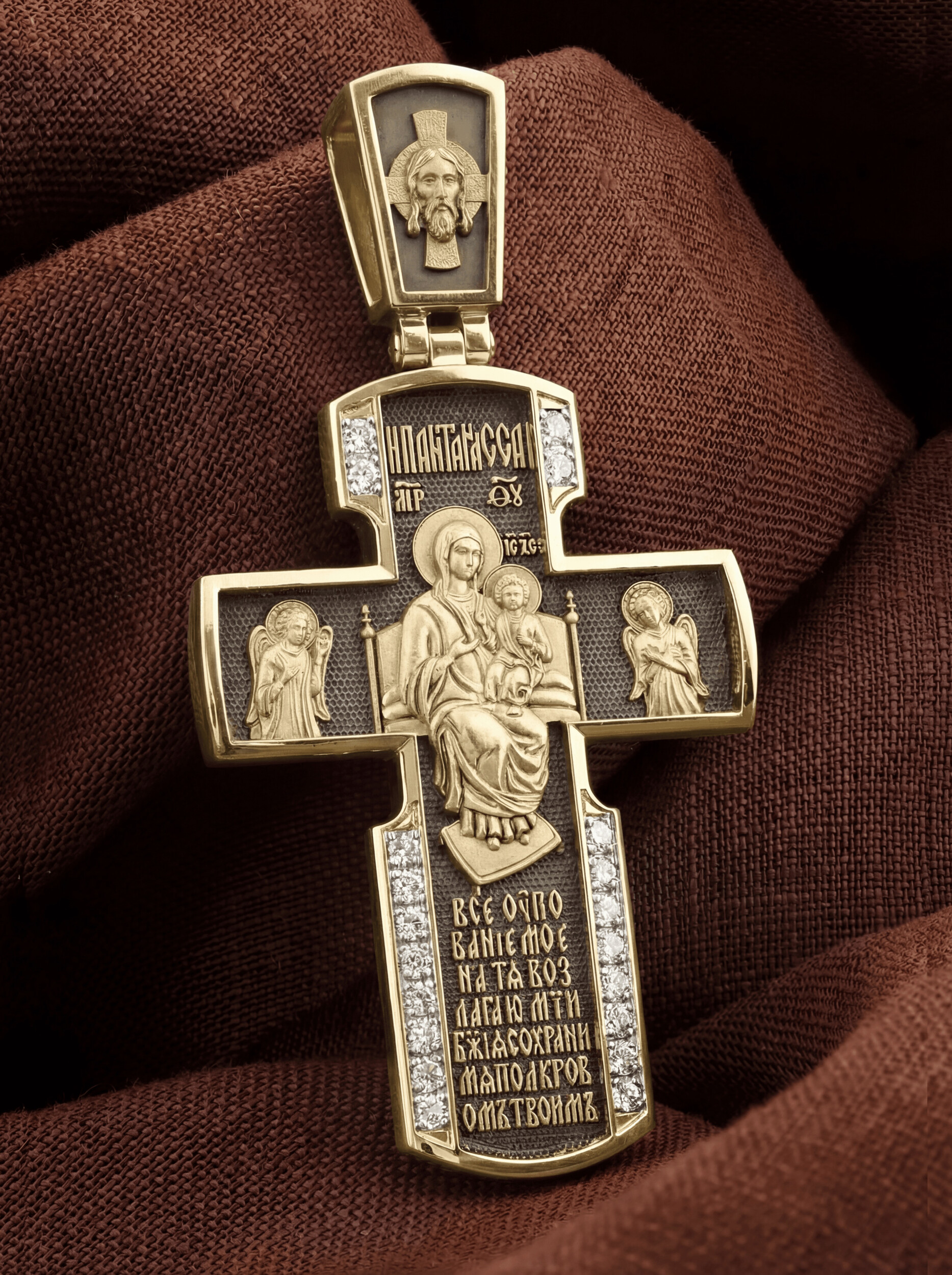 Внизу креста написана молитва обращенная к Божией Матери «Все упование мое на Тя возлагаю, Мати Божия, сохрани мя под кровом Твоим».