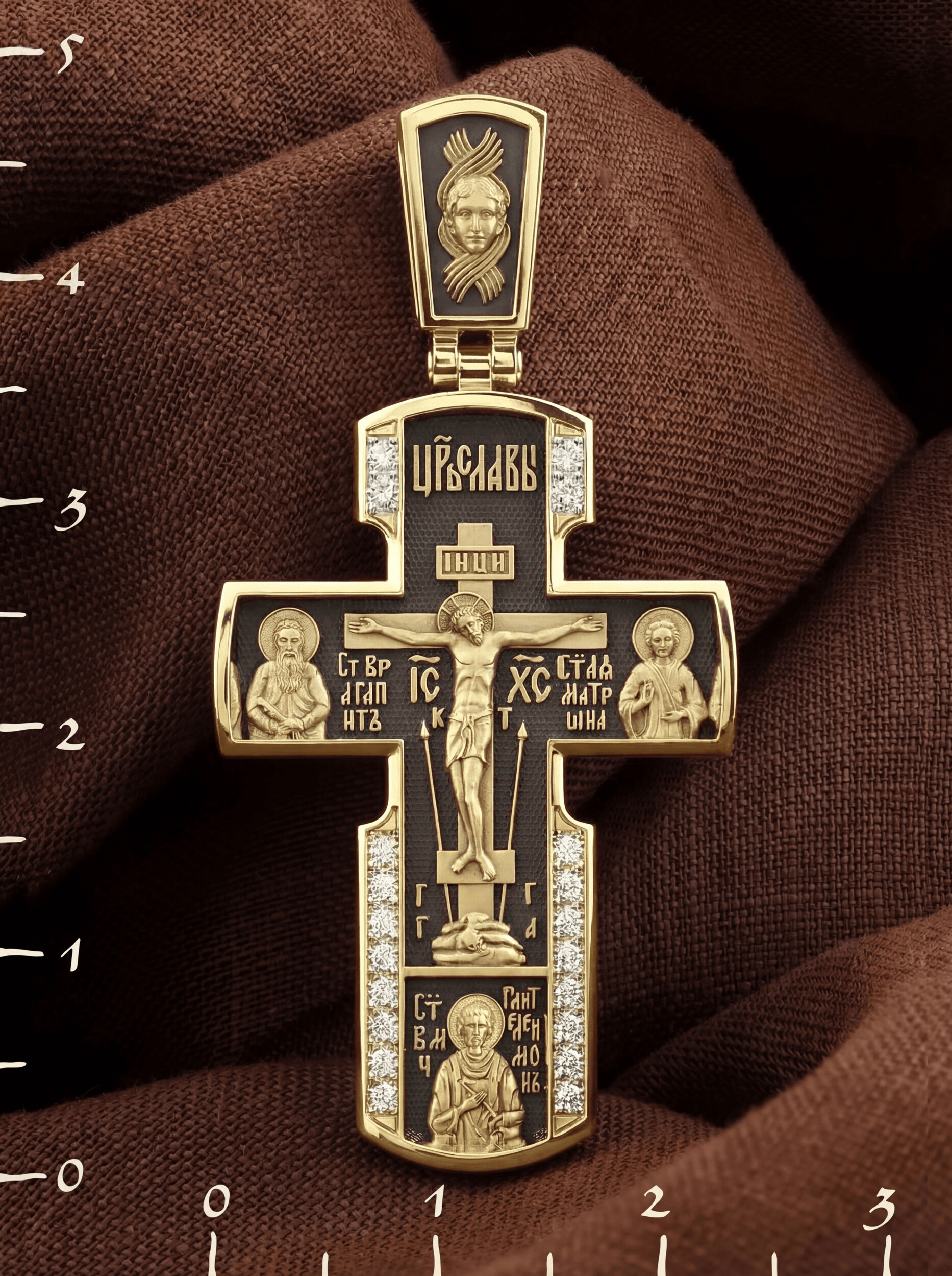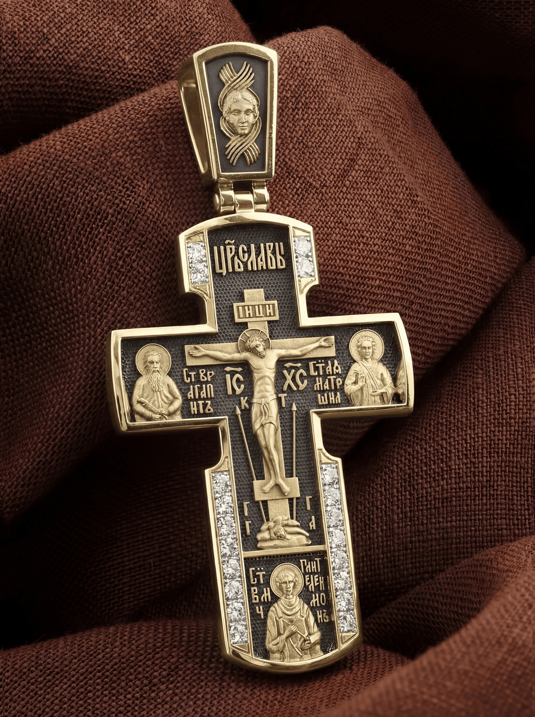 На лицевой стороне креста изображено Распятие Иисуса Христа на Голгофском Кресте, над вершиной которого помещена надпись «Царь Славы». Справа от Распятия помещен образ прославленной святой блаженной Матроны. «Матронушка», — ласково называют эту святую православные за удивительную любовь и помощь, которую она подает всем нуждающимся в ее поддержке. Слева — икона прп. Агапита. Этот святой жил в пещерах Киево-Печерского монастыря в XI веке и бескорыстно врачевал мирян и монахов.