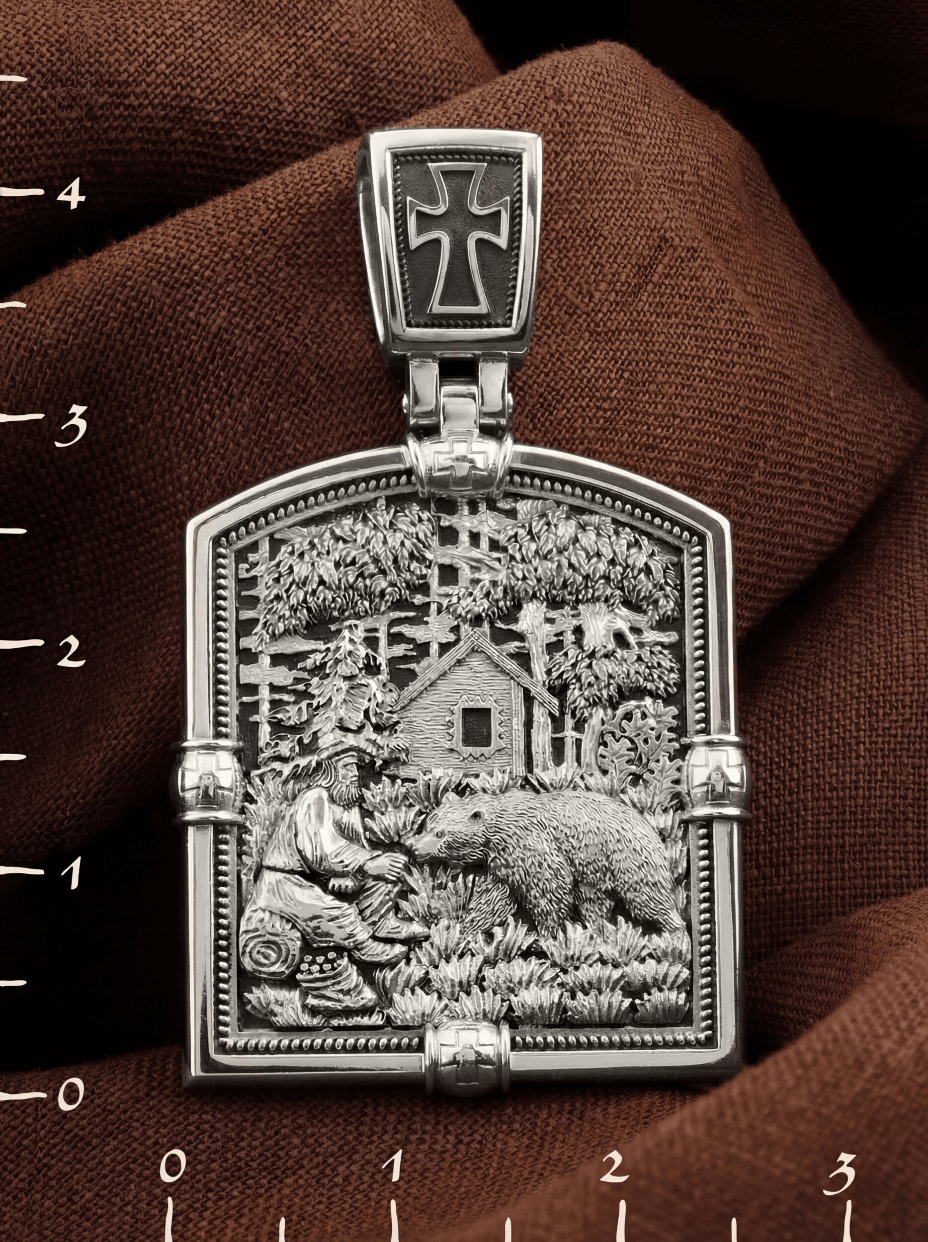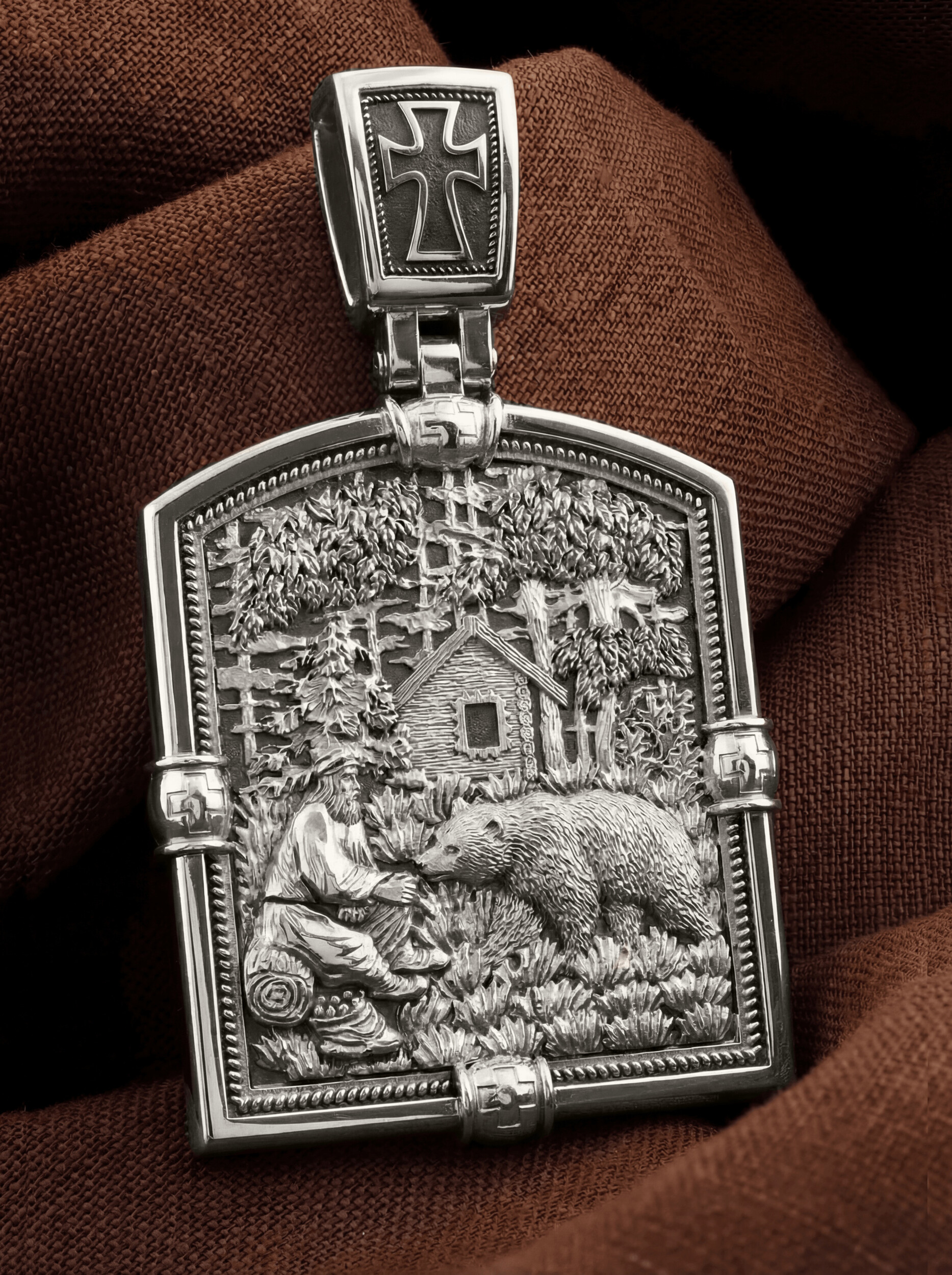 На образке изображен один из самых узнаваемых моментов жития преподобного: Тысячу дней и тысячу ночей Серафим провел в подвиге столпничества на каменном валуне. Узнав о строгой жизни преподобного отца Серафима, многие приходили к нему за советом и наставлениями. Умея узнавать и различать людей, старец от некоторых уклонялся, сохраняя молчание. Но тех, кто имел до него действительную духовную нужду, он охотно принимал и с любовью руководил их своими советами, наставлениями и духовными беседами. Даже диким зверям преподобный Серафим внушал благоговение: многие, посещавшие его в дальней пустыне, видели около него громадного медведя, которого он кормил из рук.