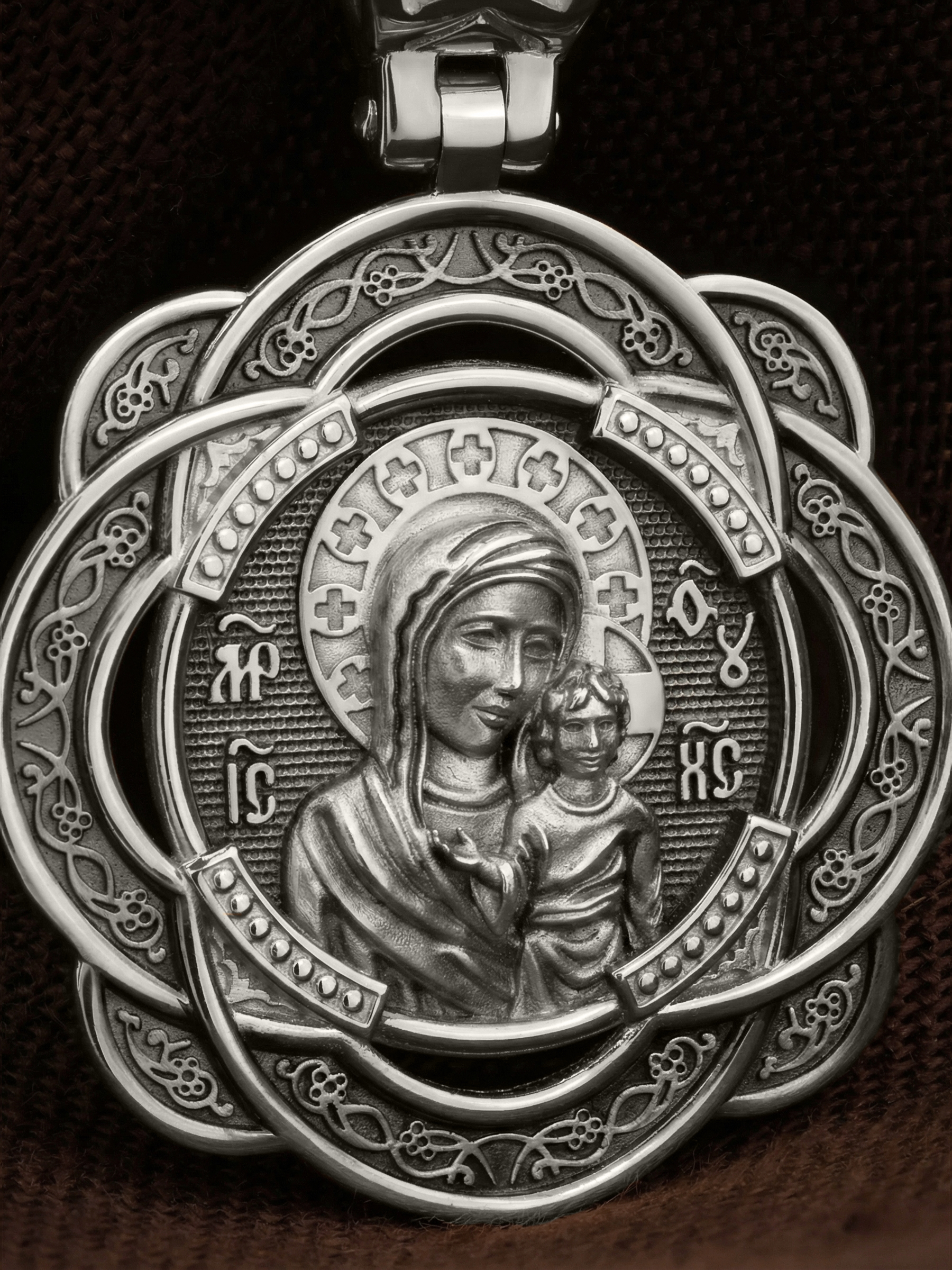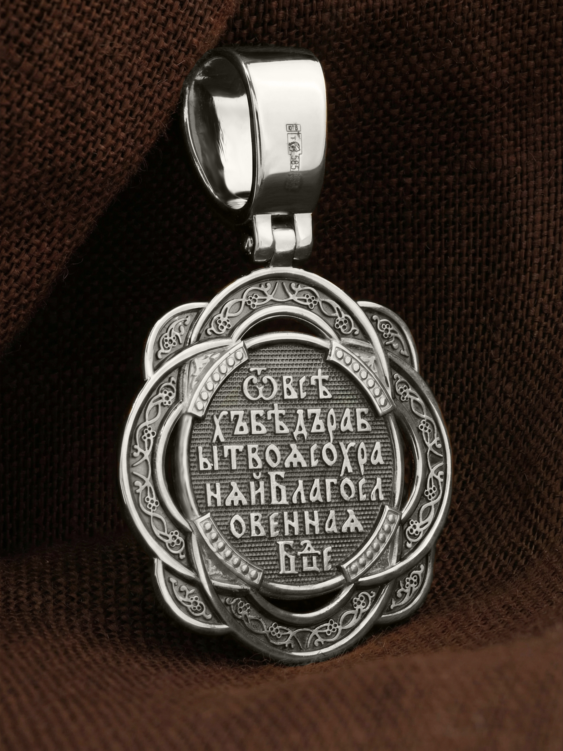 На лицевой части образка изображена Казанская икона Пресвятой Богородицы — одна из самых почитаемых в России. Икона была явлена на пожарище в Казани в 1579 году. В 1904 году святыня была похищена и уничтожена, но чудотворную силу иконы Богородица явила во многих ее списках. Молитва перед Казанской иконой Божьей Матери помогает во всех сложных случаях жизни, во всех печалях, невзгодах, скорбях.