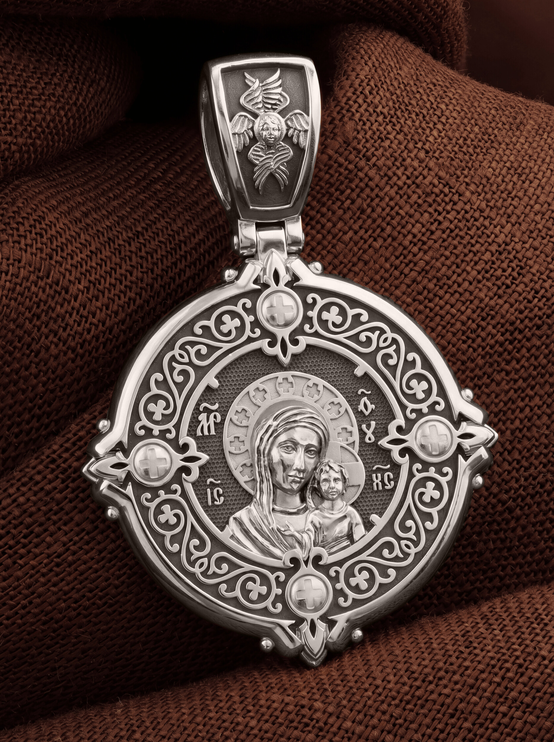 На обороте написана молитва к Богородице: «От всех бед рабы Твоя сохраняй, Благословенная Богородица!». На кулонном кольце изображен Спас Нерукотворный — Символ вочеловечившегося Божества и шестикрылый Серафим — самый приближенный к Господу Ангел.