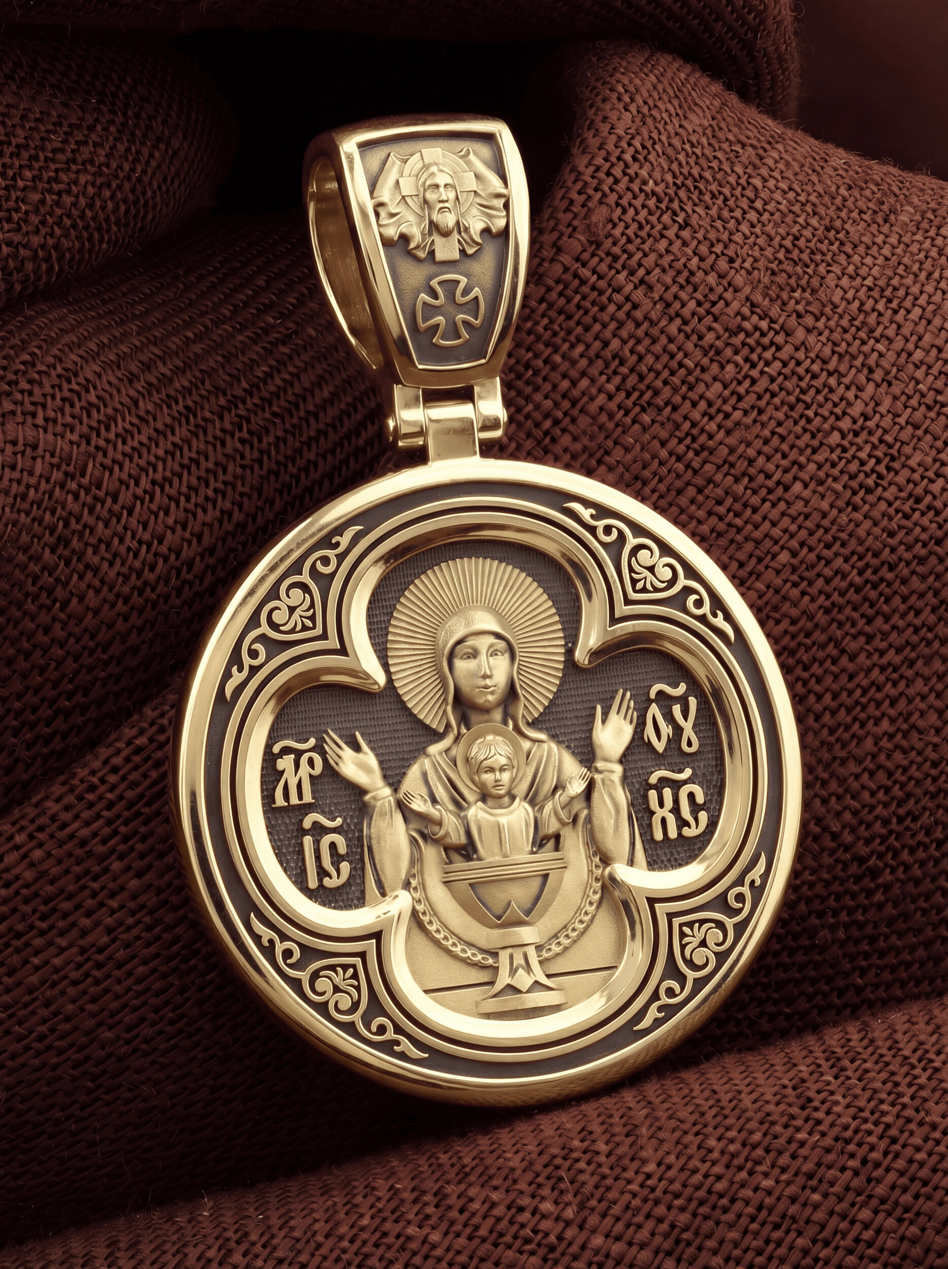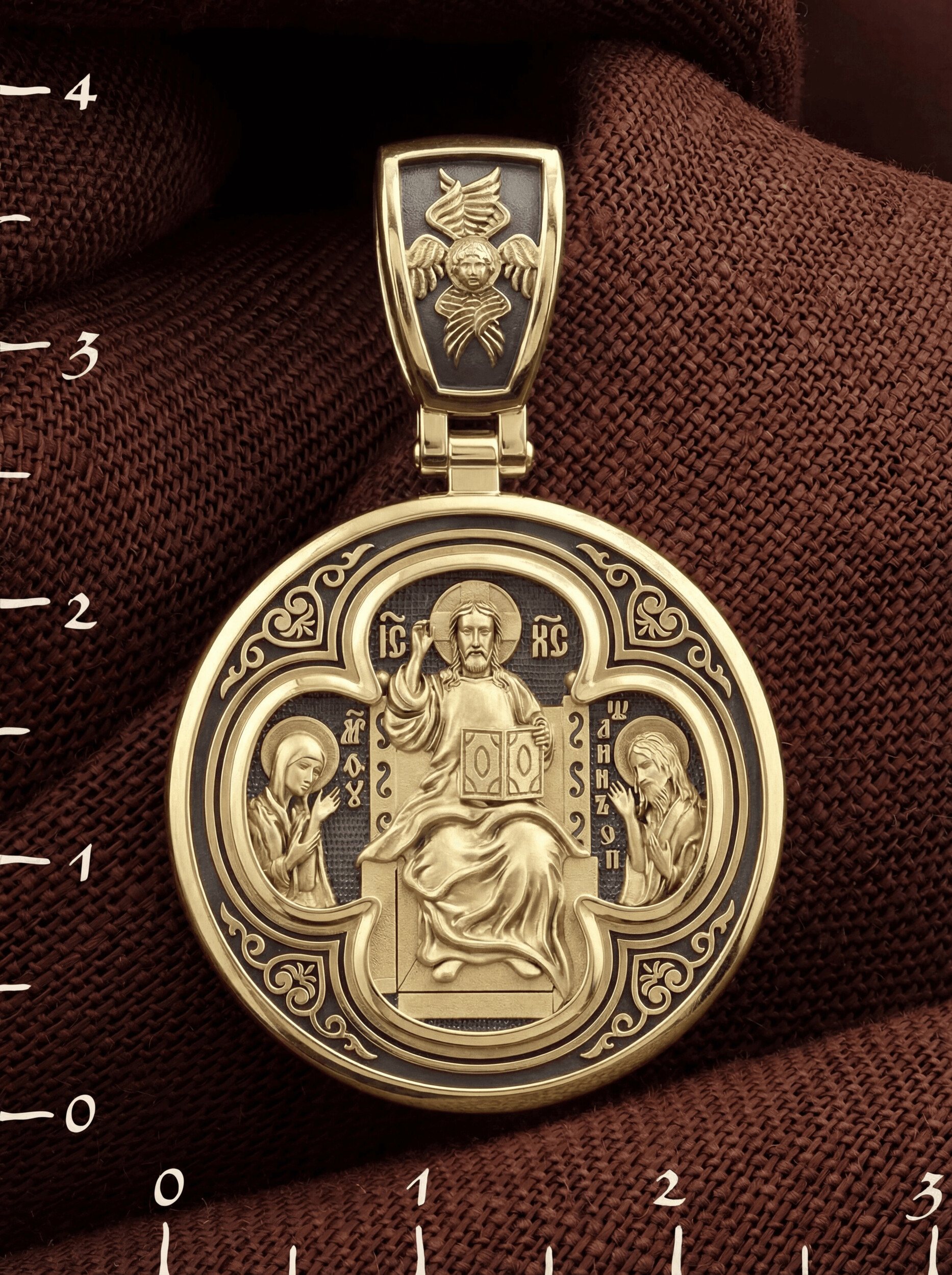 На лицевой стороне образка изображена икона Иисуса Христа Деисус. Он представлен в образе Господа Вседержителя, восседающего на престоле. В его руках — Книга Судеб всего человечества. С двух сторон ему предстоят Пресвятая Богородица и пророк Иоанн Предтеча, Креститель Господень.