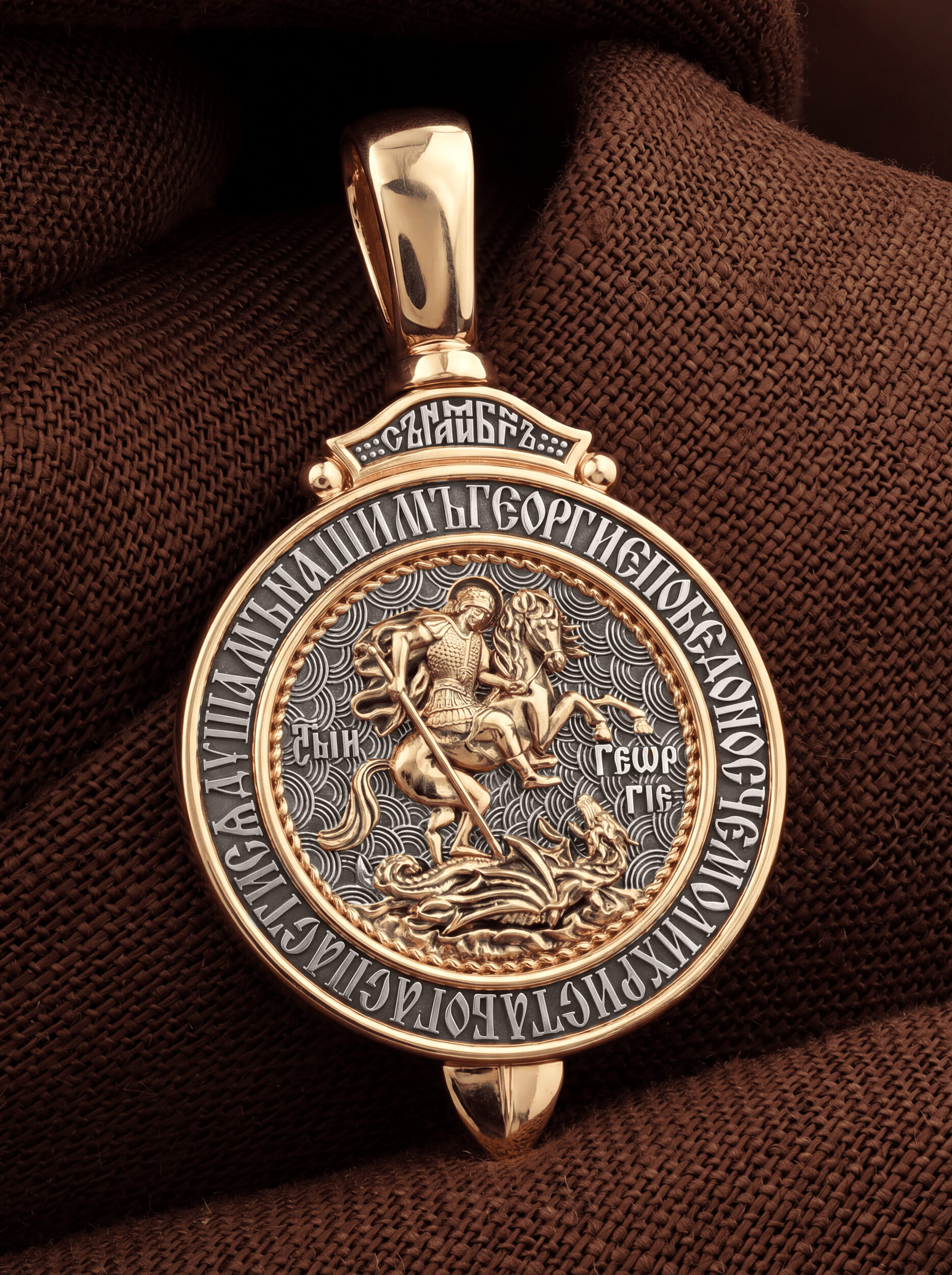 Основой композиции лицевой стороны является изображение Святого Великомученика Георгия Победоносца — одного из самых почитаемых и удивительных святых. На Руси он известен как Юрий или Егорий, покровитель воинов, помощник в крестьянском труде. На образке он изображен как воитель, сидящий на вздыбленном коне и поражающий копьем огнедышащего змея. Змей символизирует собою сатанинские силы. Молитвами вознесенными к Всевышнему и своей непреклонной верой он смог одолеть чудовище. Святой убил змея, спас царскую дочь, принесенную в жертву, и жителей города, их души от влияния дьявола, породив в них надежду и веру в Господа, призывая людей принять христианскую веру. Изображение святого великомученика Георгия Победоносца обрамлено словами молитвы: «Геогрие Победоносче, моли Христа Бога спастися душам нашим».