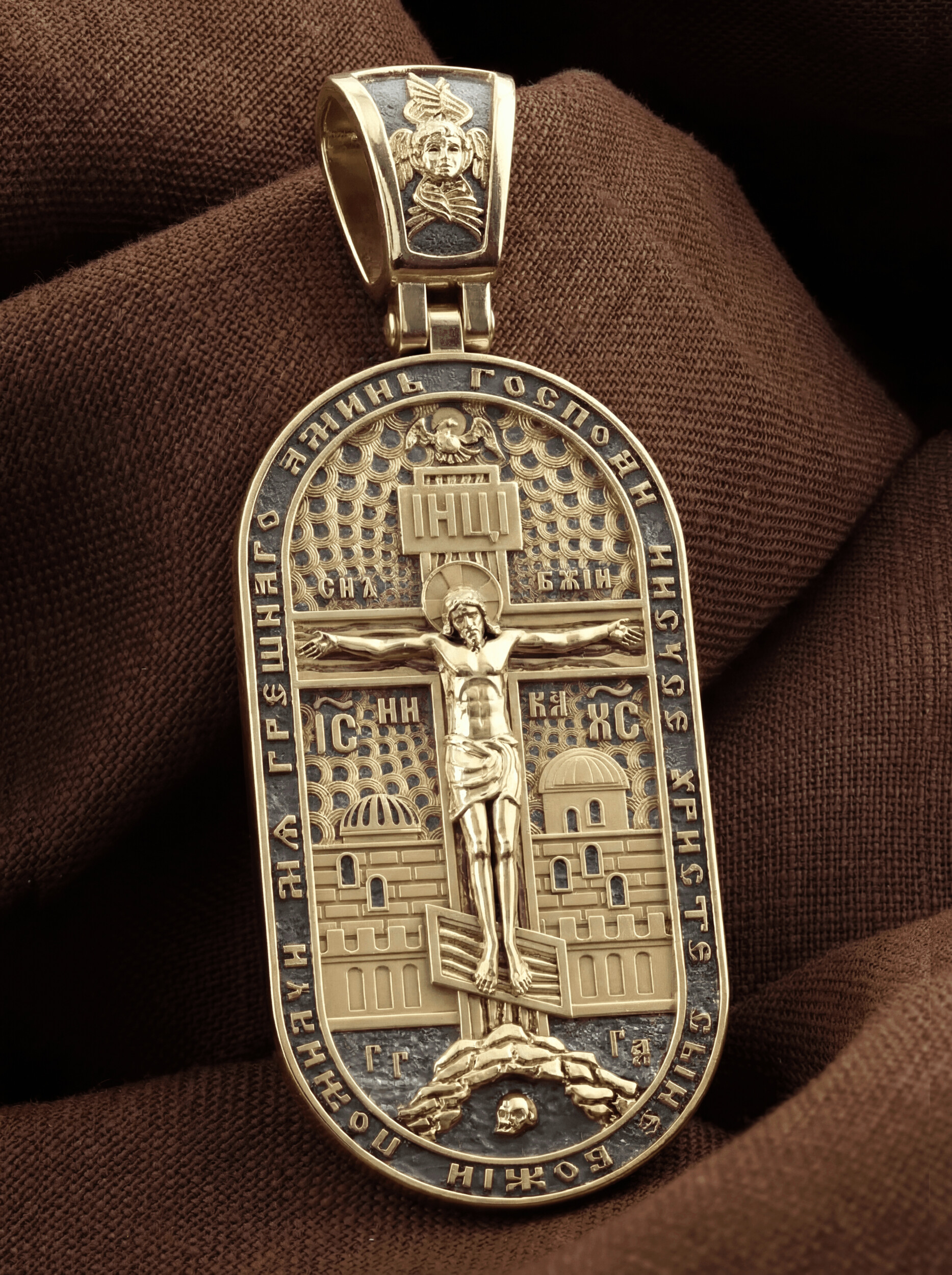 Центральную часть лицевой стороны занимает Распятие Христа — образ жертвы, принесенной Господом за грехи людей. Именно ко Христу, сошедшему на землю ради нашего спасения, возносятся все молитвы. Рядом с Его образом помещены слова — «НИКА» (греч. — Победитель) и «СЫН БОЖИЙ». Эти слова характеризуют Господа как Великого Архиерея, победителя смерти. Также Распятие сопровождается надписями, олицетворяющими Христа — это святое имя Христа «IC» (Иисус) «ХС» (Христос). Верхняя перекладина символизирует собой табличку с надписью «IHЦI» — Иисус Назарянин Царь Иудейский. Возвышение, на котором стоит Крест, символизирует гору Голгофу, на которой произошло Распятие. У подножия Креста изображают прах Адама, обозначенный черепом. На кулонном кольце изображен шестикрылый Серафим — самый приближенный к Господу Ангел. По контуру образка написана молитва: «Господи Иисусе Христе, Сыне Божий, помилуй мя грешного. Аминь»