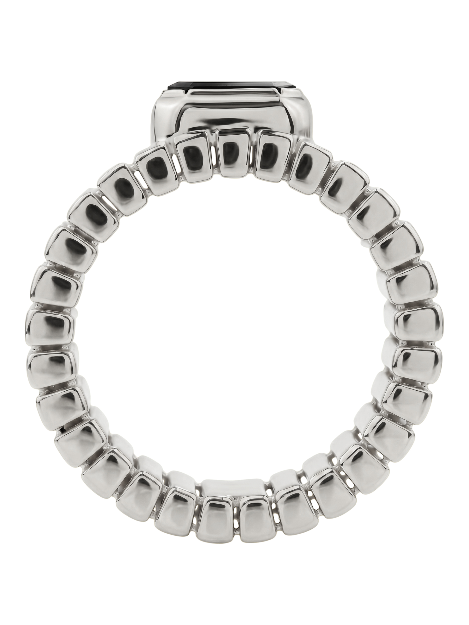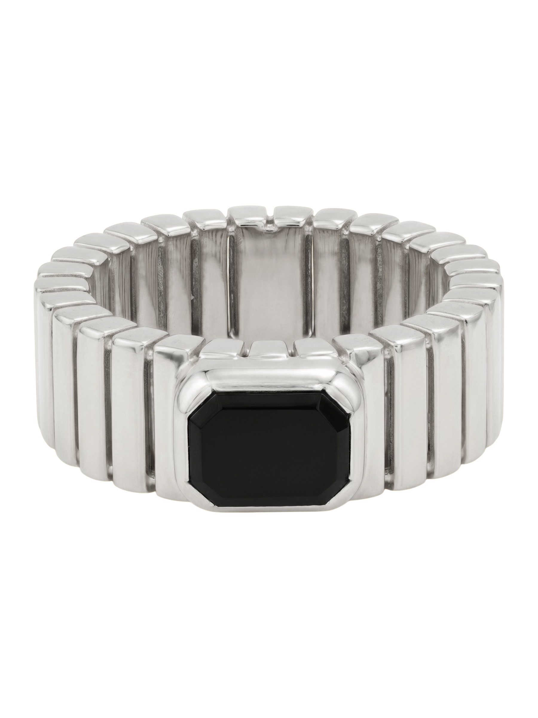 В центре композиции расположен оникс правильной формы октагон. Одна крупная вставка черного цвета придает изделию солидности и выразительности. Массивный рельефный шинка подчеркивает геометрию кольца, делая его самодостаточным аксессуаром, который не требует дополнений, но при этом отлично вписывается в составные комплекты украшений.