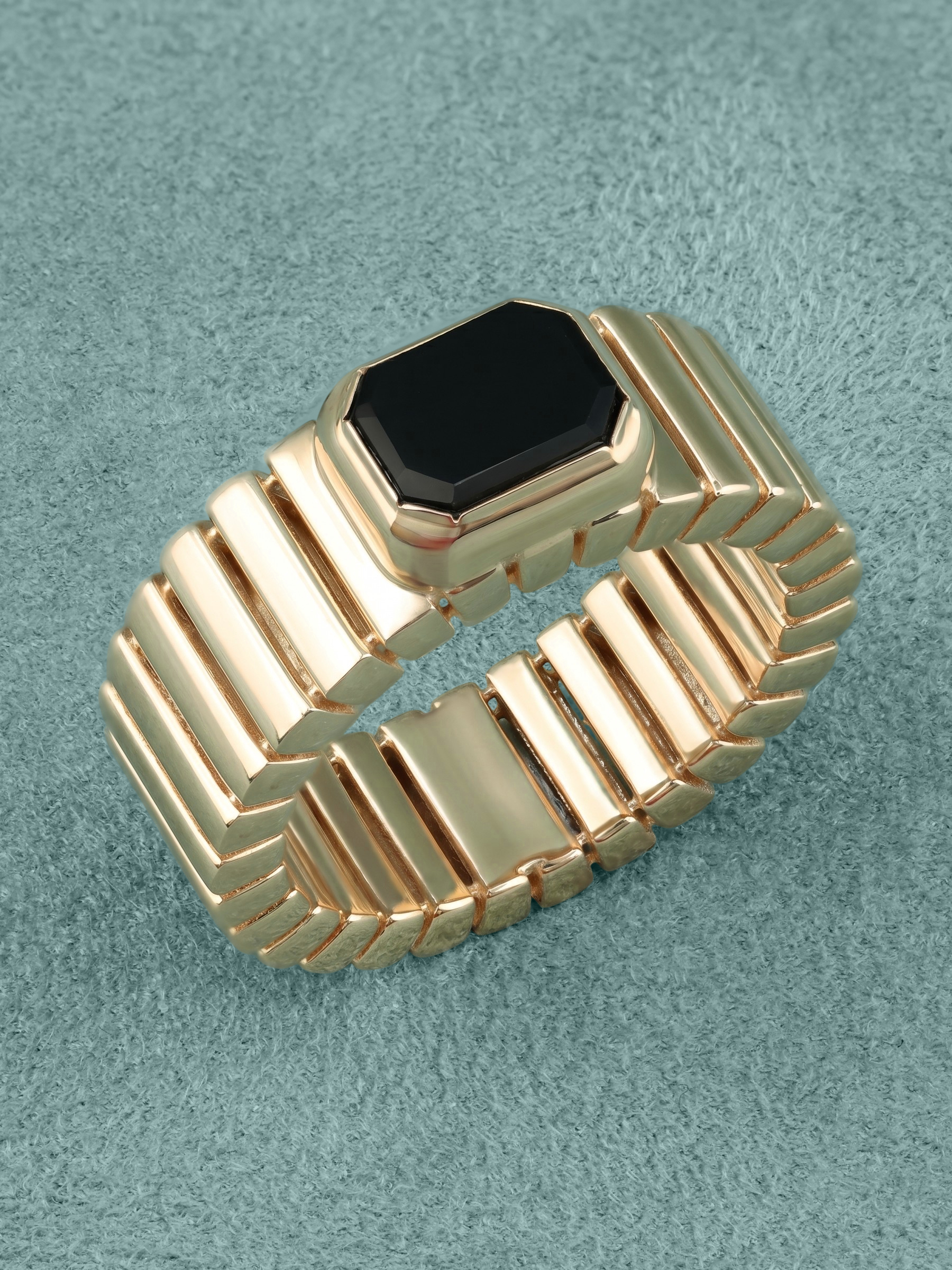 Центральным элементом композиции является одна вставка из натурального оникса глубокого черного цвета. Форма вставки — октагон — выбрана не случайно: ее сдержанная геометрия подчеркивает благородный блеск красного золота и придает кольцу особый шарм. Лаконичность линий делает это украшение универсальным аксессуаром, который легко вписывается как в деловой дресс-код, так и в вечерний стиль.