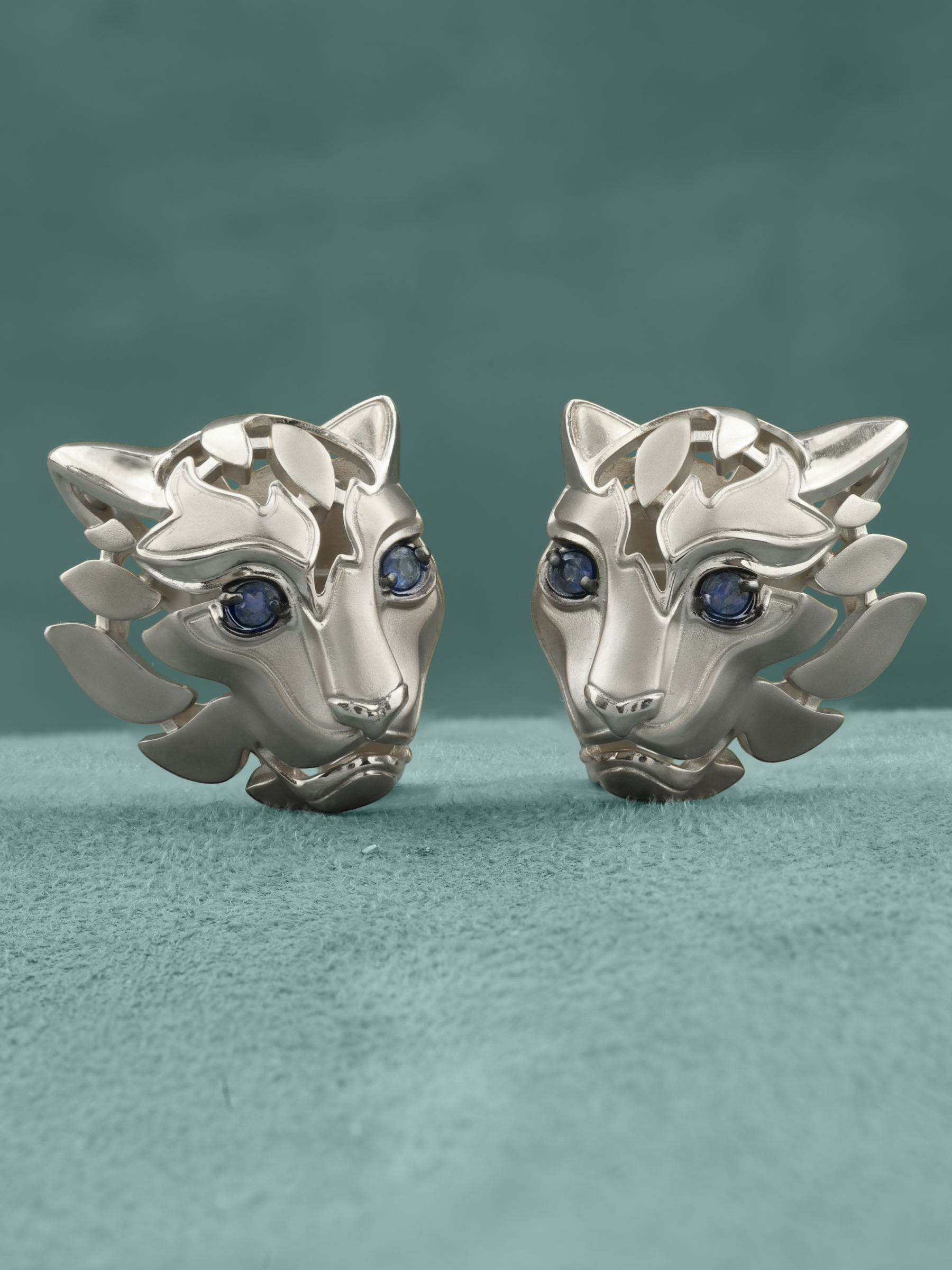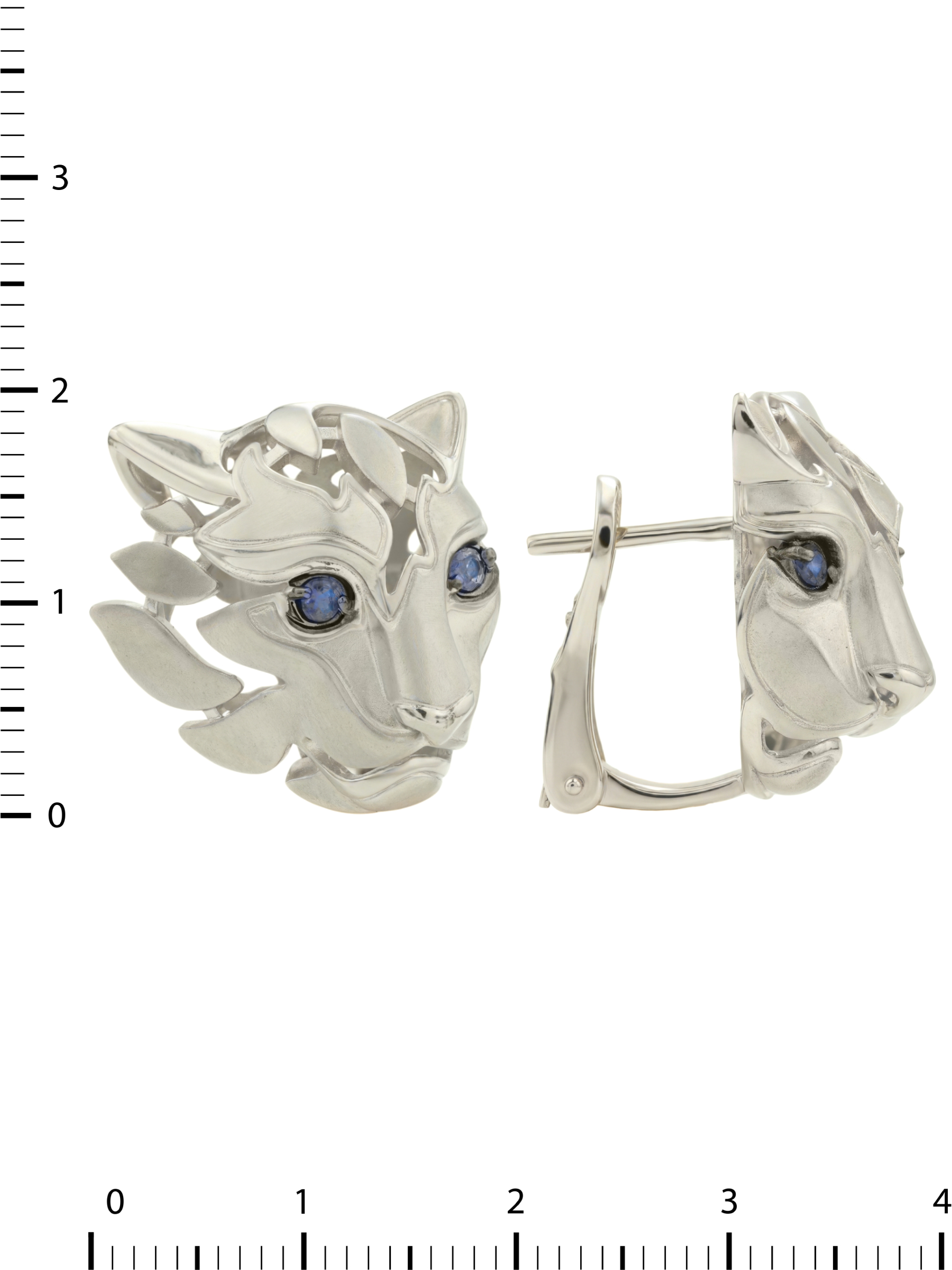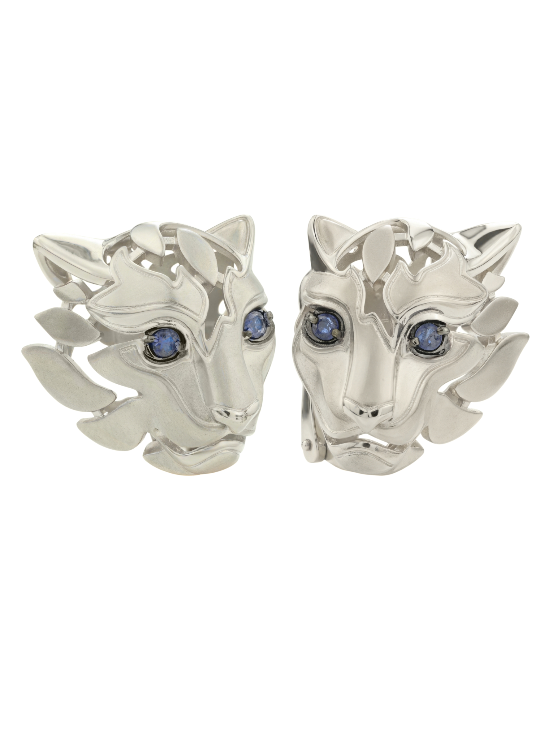 Ключевым акцентом украшения стали 4 вставки из сапфиров насыщенного синего цвета. Круглая форма камней, играющих роль пронзительных глаз хищника, гармонично дополняет сложную художественную фактуру золота. Детализированная проработка форм превращает эти серьги в настоящий арт-объект, который приковывает к себе восхищенные взгляды.