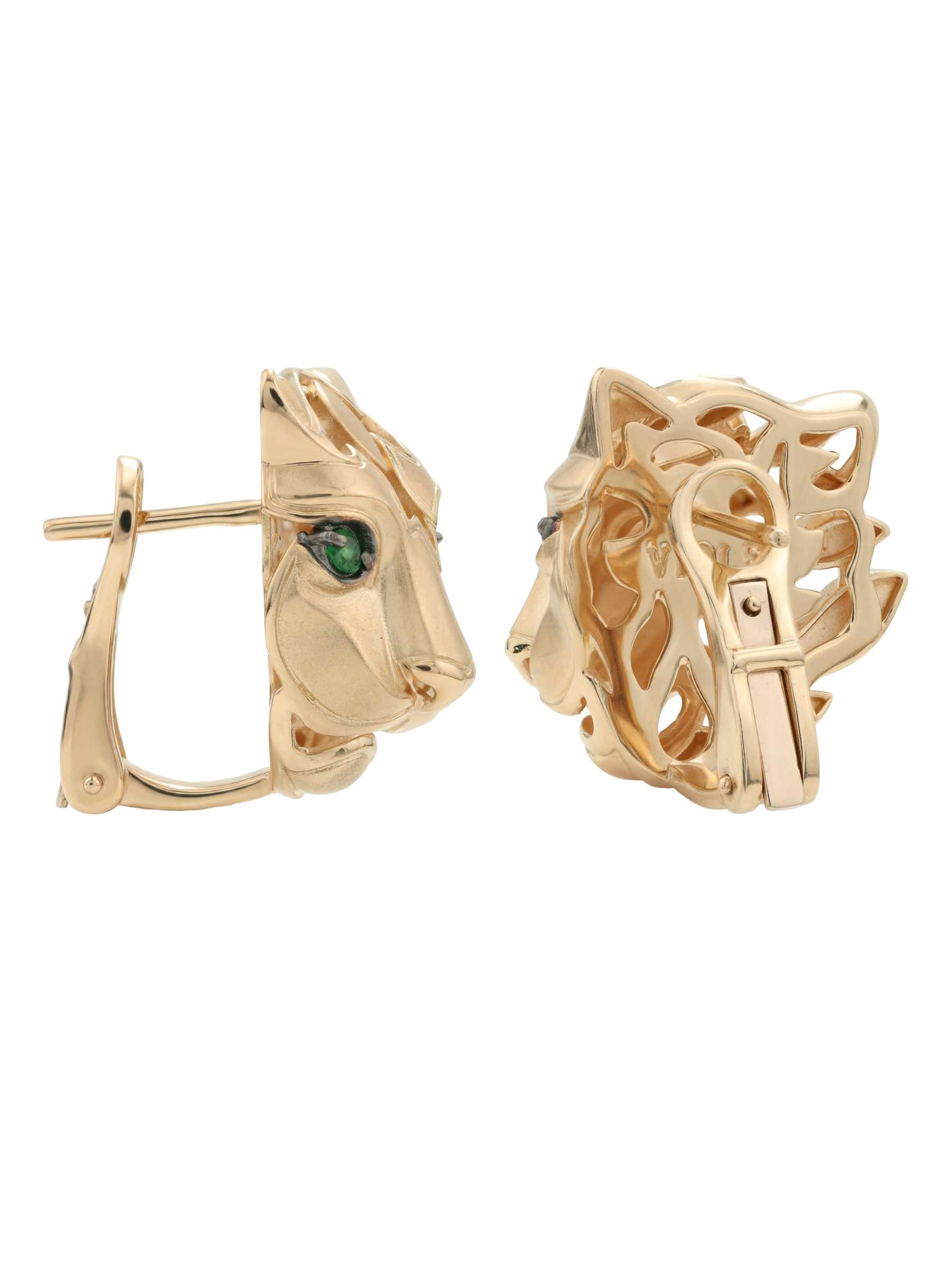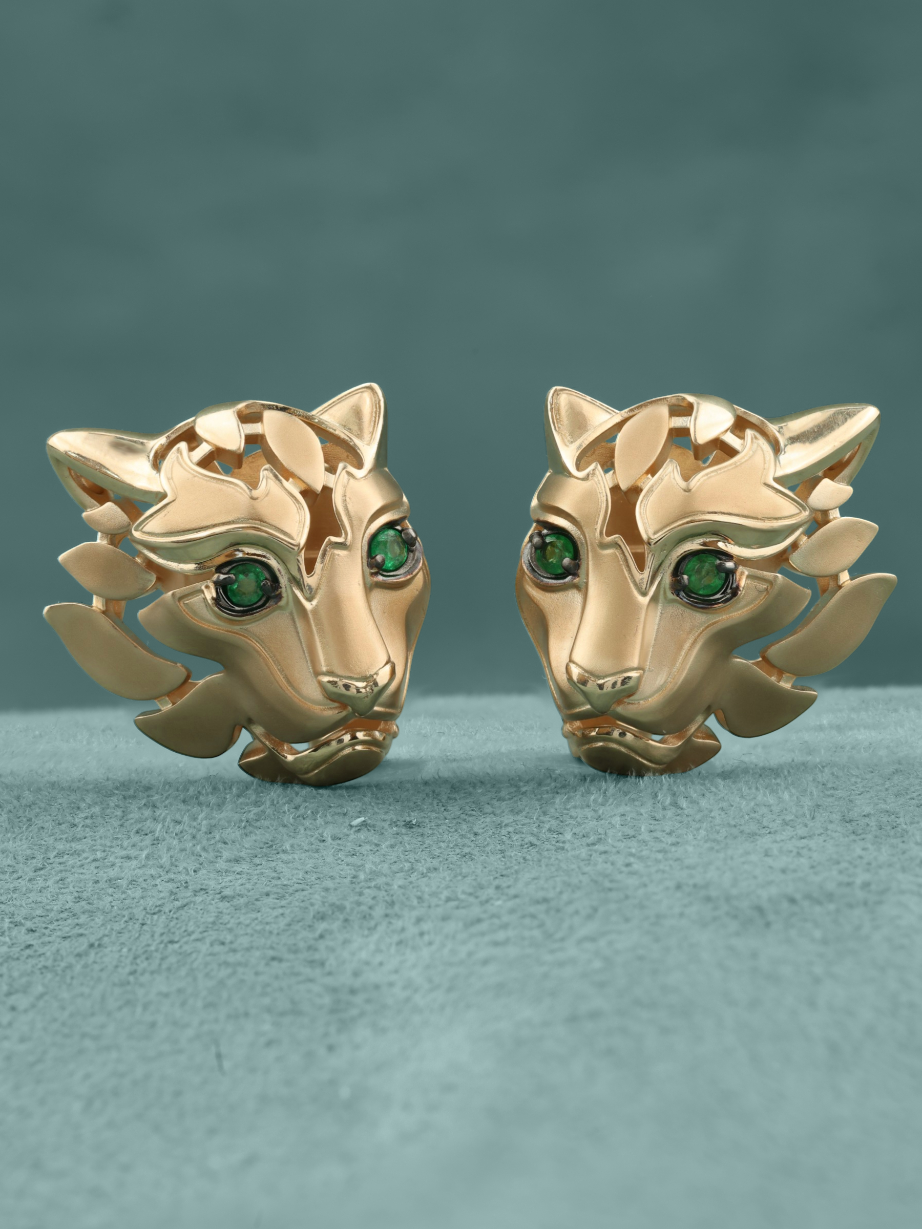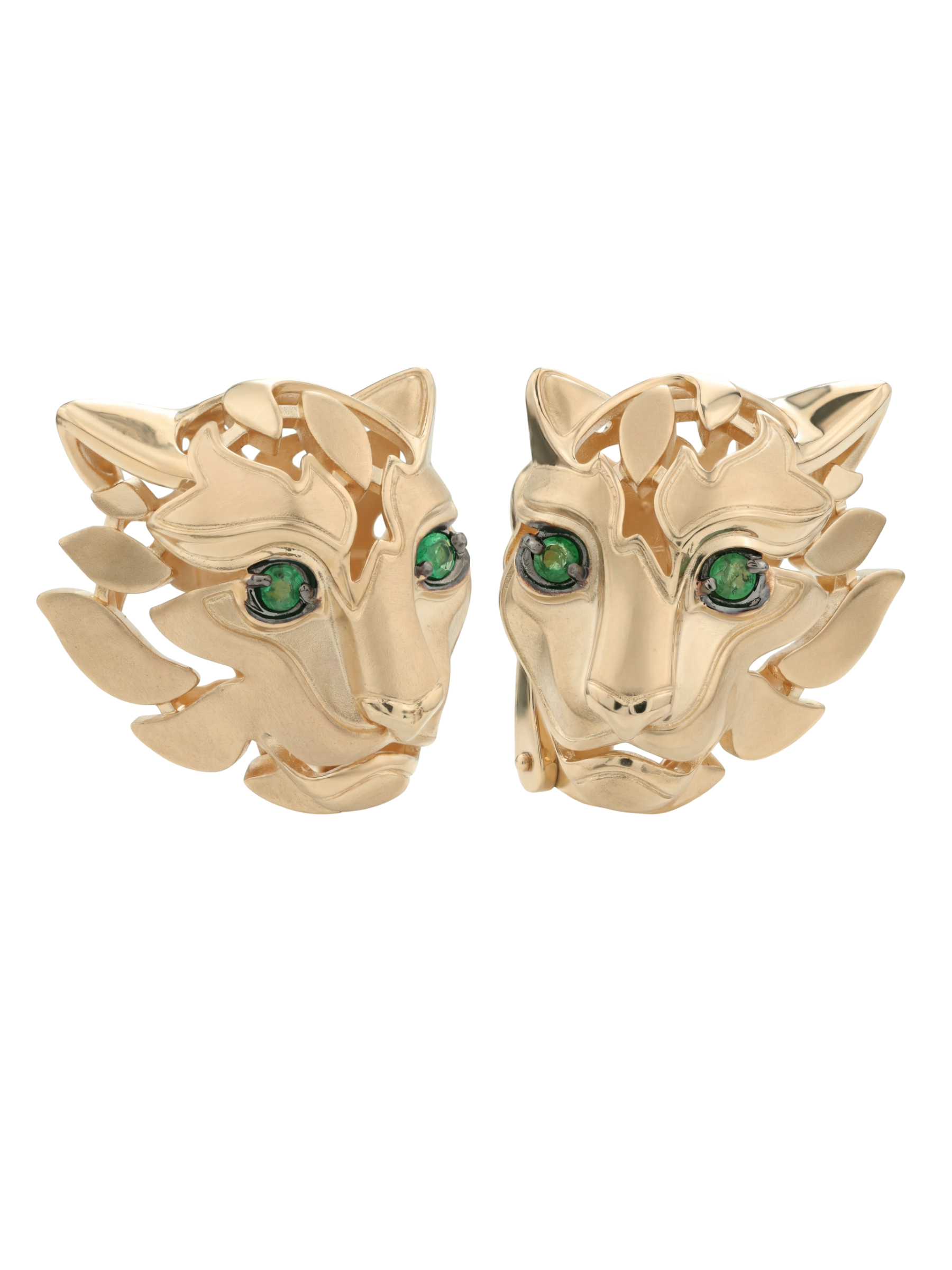 Серьги из красного золота 585 пробы из коллекции Vioretty — TIGRE представляют собой смелое сочетание ювелирного мастерства и анималистического дизайна. В центре композиции — искусная стилизация головы тигра, выполненная в теплом оттенке красного металла. Глубокий, насыщенный зеленый цвет вставок-изумрудов, имеющих безупречную форму круга, придает изделию выразительный и притягательный акцент. Всего в паре серег использовано 4 камня, которые подчеркивают хищную грацию украшения.