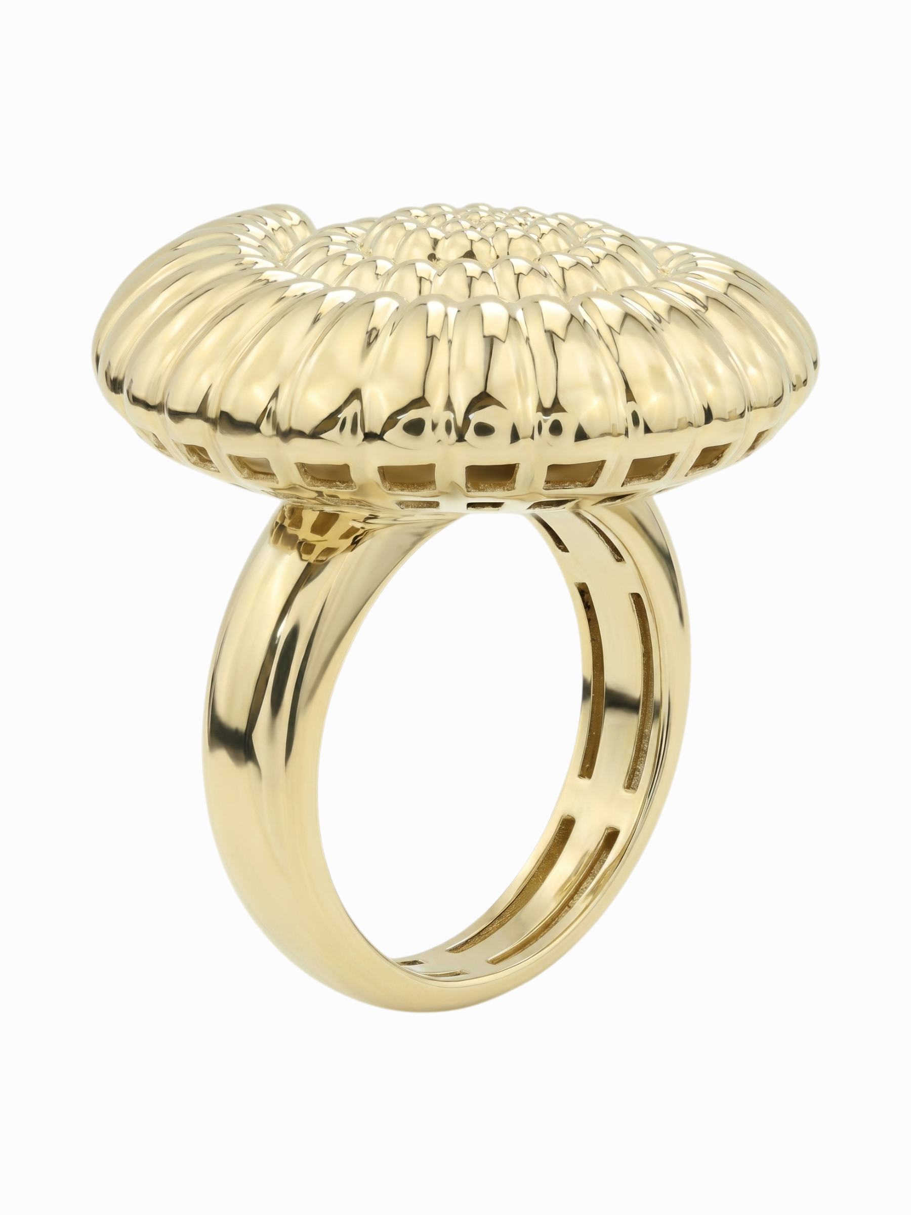 Кольцо из лимонного золота с рубином из коллекции Vioretty — Oceano — это ювелирный шедевр, вдохновленный совершенством природных форм. Дизайн украшения, напоминающий морскую раковину, притягивает взгляд своей плавностью и художественной выразительностью. Глянцевая поверхность лимонного золота 585 пробы эффектно играет светом, создавая объемный и динамичный образ. Центральным акцентом композиции выступает рубин насыщенного красного цвета, ограненный в форме идеального круга, который вносит ноту роскоши и благородства в общую эстетику изделия.