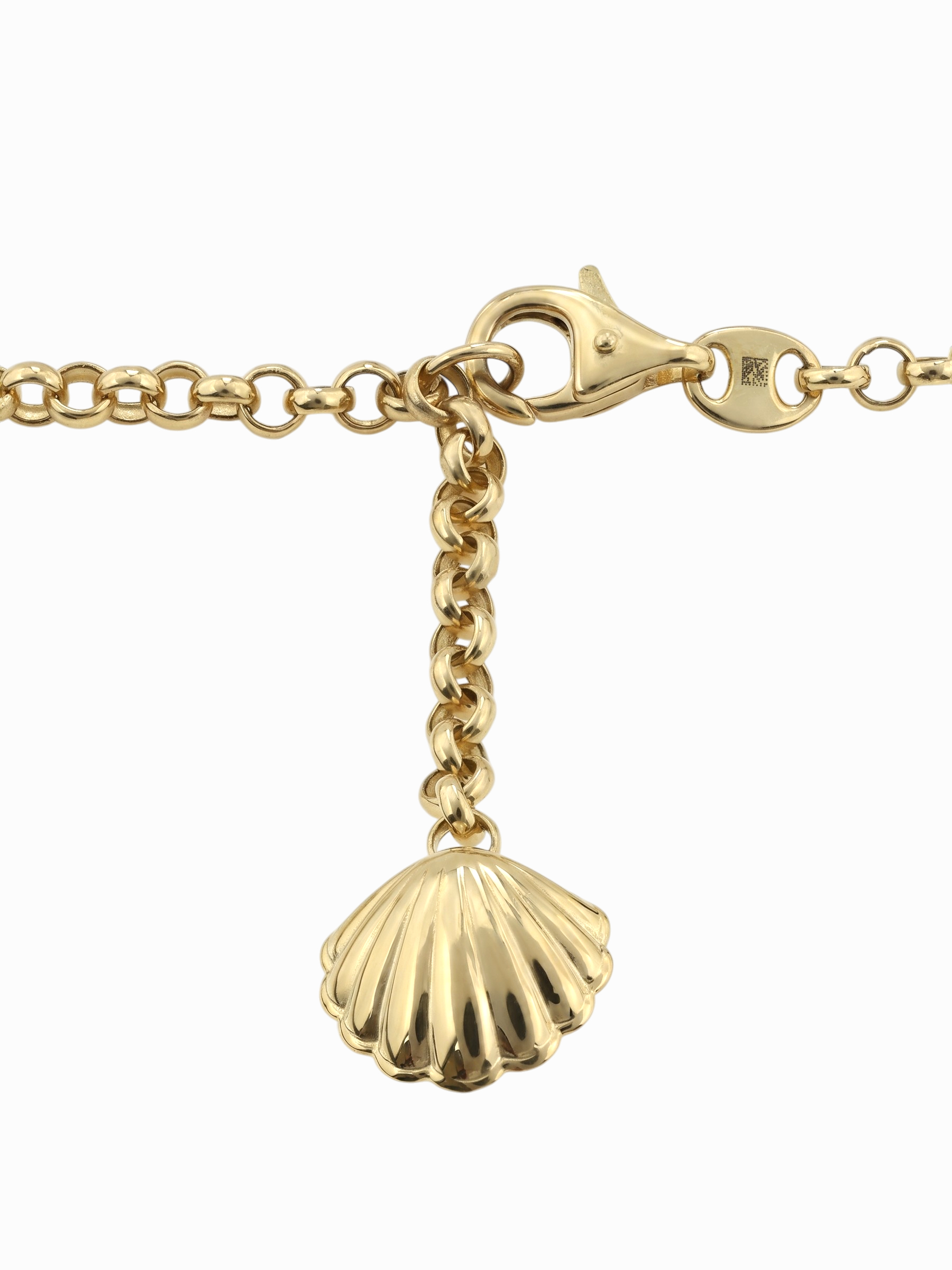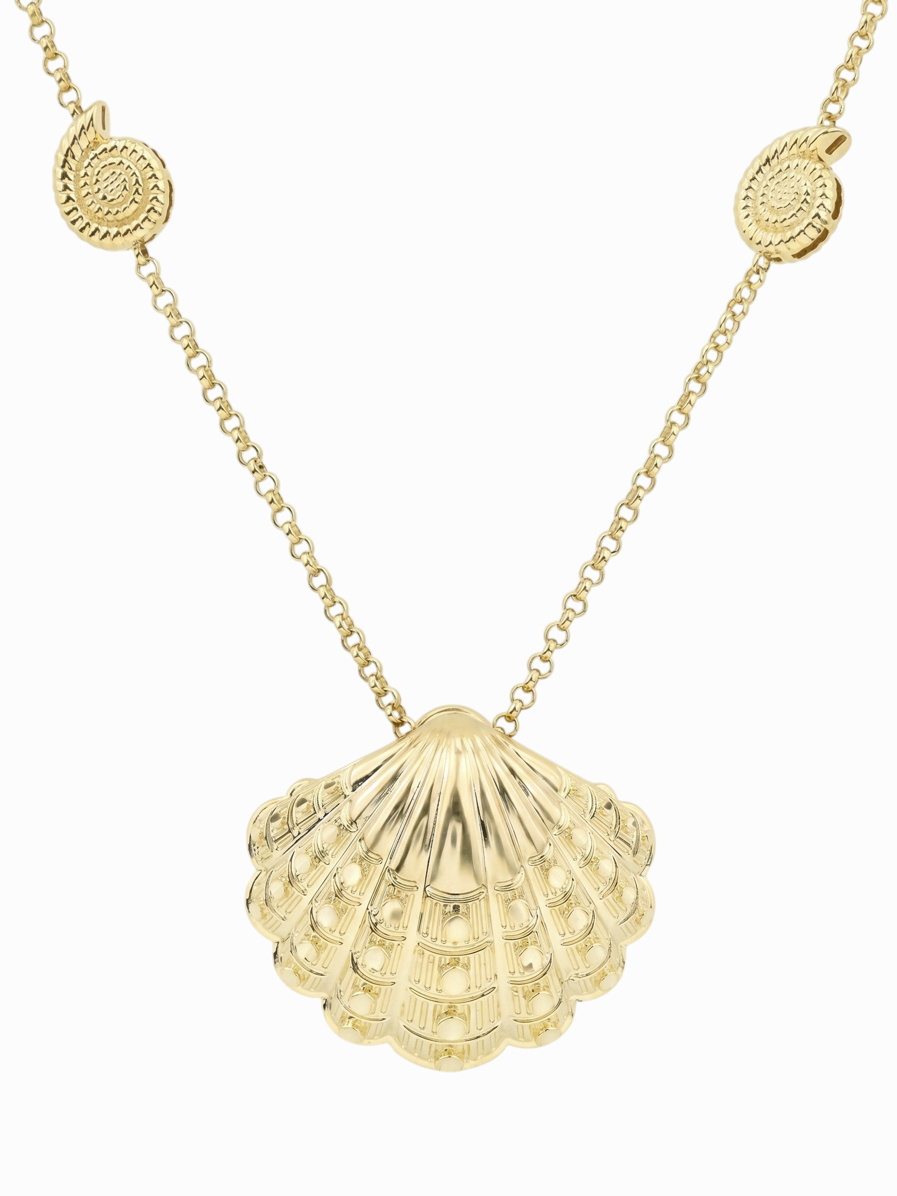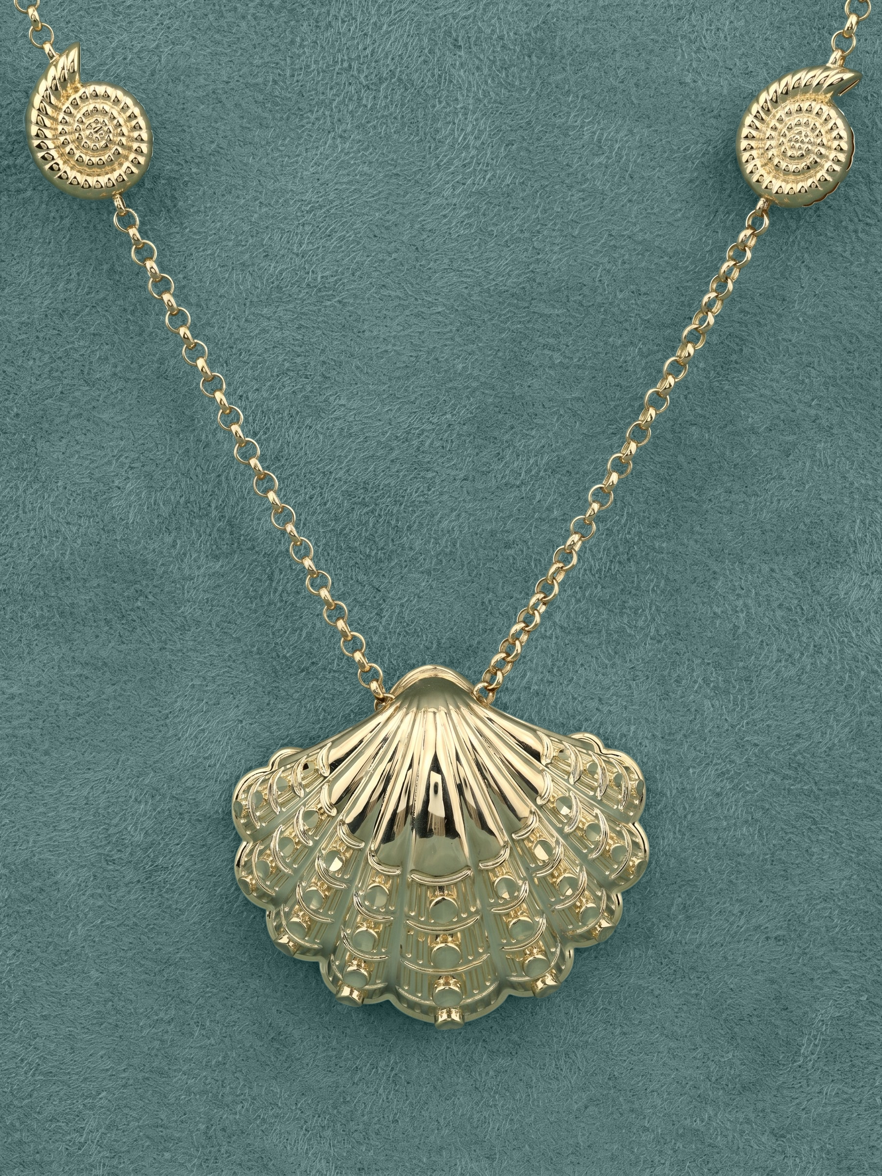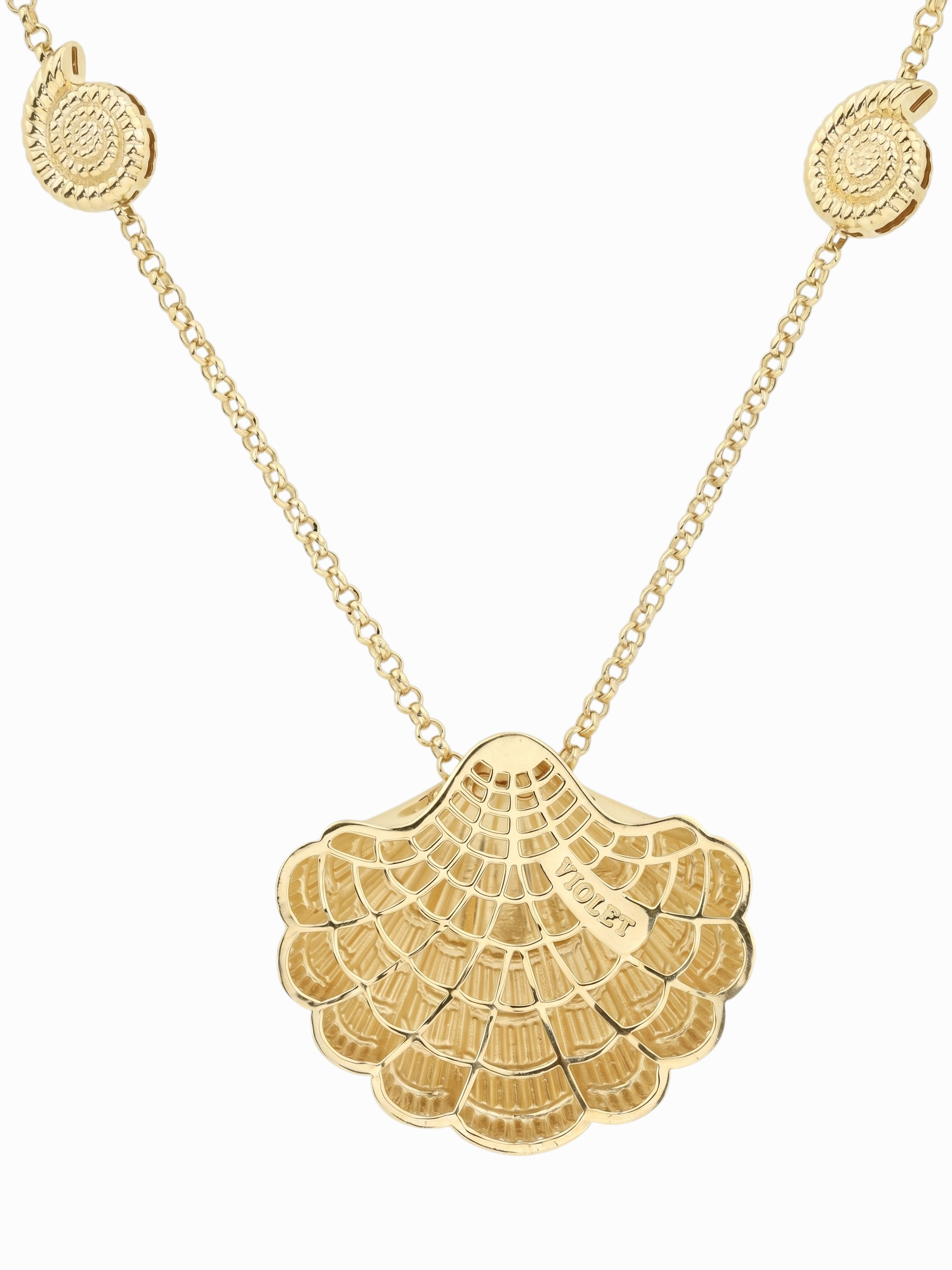 Изысканное колье из лимонного золота 585 пробы — это воплощение морской грации в драгоценном металле. Центральным элементом украшения выступает изящная подвеска в форме морской раковины, дополненная лаконичными декоративными элементами в виде спиралевидных ракушек, гармонично расположенных на цепи. Необычный оттенок лимонного золота придает изделию благородный блеск, подчеркивая мастерство исполнения и внимание к деталям.