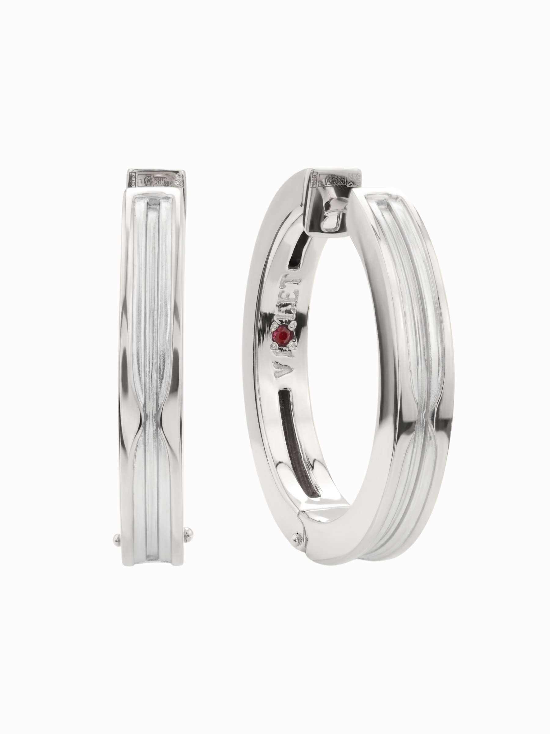 Особую выразительность дизайну придает скрытая деталь: внутри каждого изделия расположена вставка из драгоценного рубина. Камень круглой формы обладает насыщенным красным цветом, создавая изысканный контраст со строгим белым золотом. Использование двух рубинов в комплекте добавляет изделию таинственности и делает его отличным выбором для тех, кто ценит эстетику минимализма с акцентом на детали.