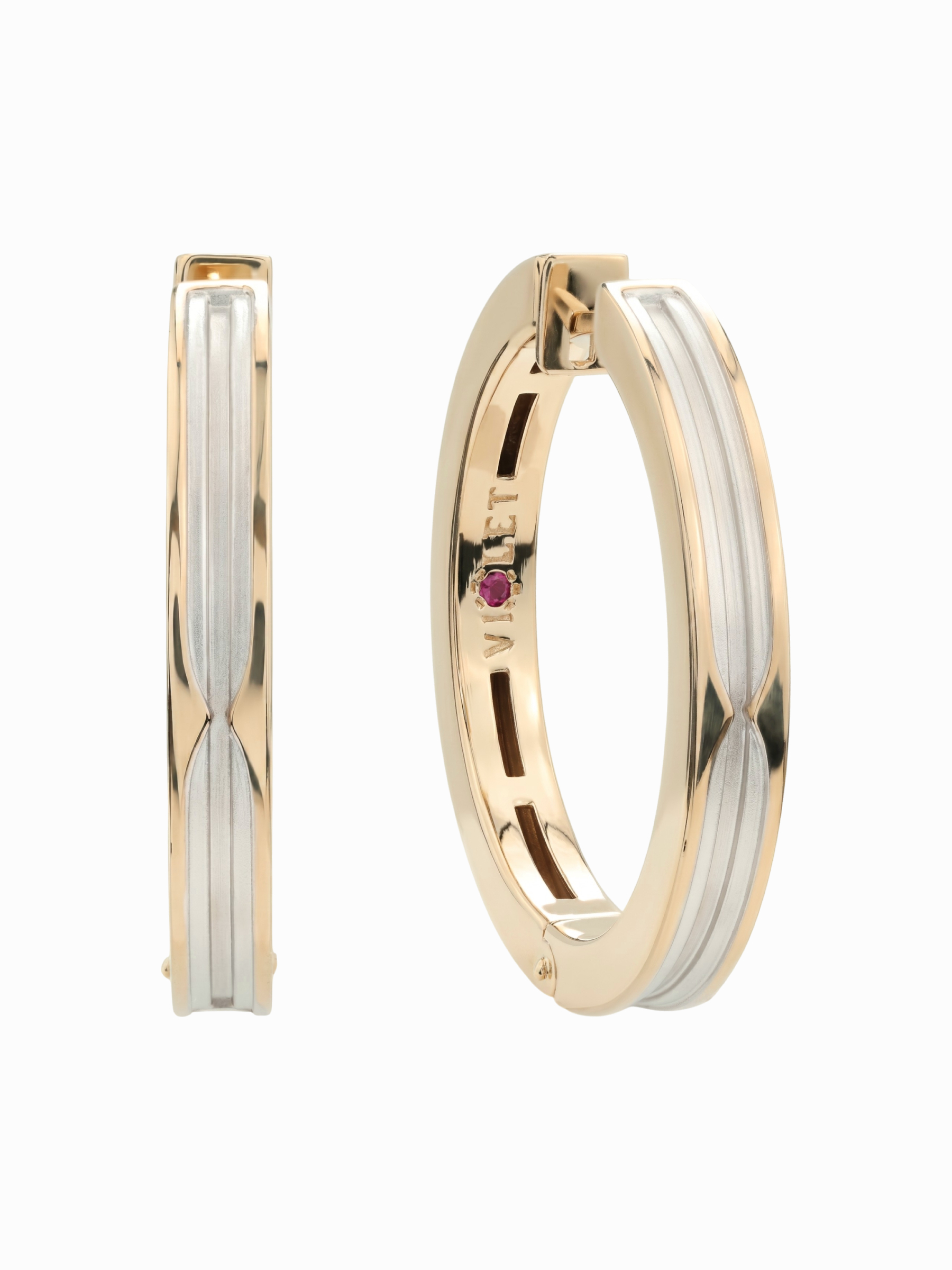 Особую выразительность украшению придает вставка: каждый аксессуар дополнен рубином насыщенного красного цвета. Форма вставок — круг, что идеально гармонирует с мягкими линиями самих серег. Всего в изделии использовано 2 вставки, которые деликатно вписаны в конструкцию, создавая акцент, заметный лишь при близком рассмотрении. Это делает украшение не только статусным, но и интригующим.