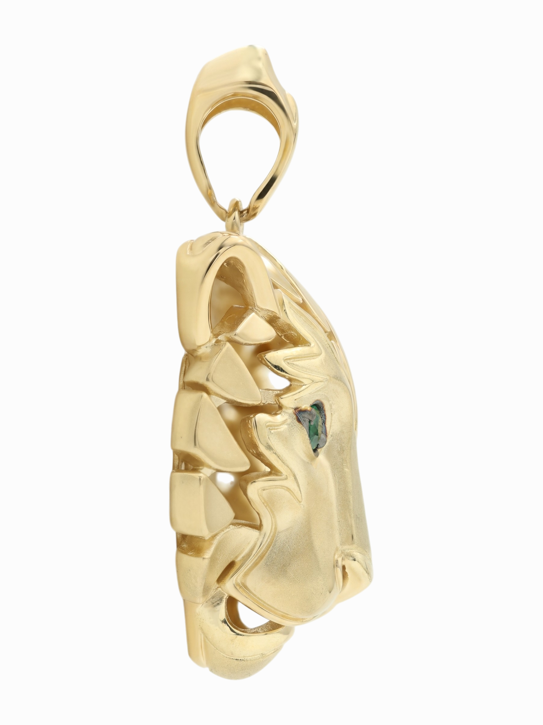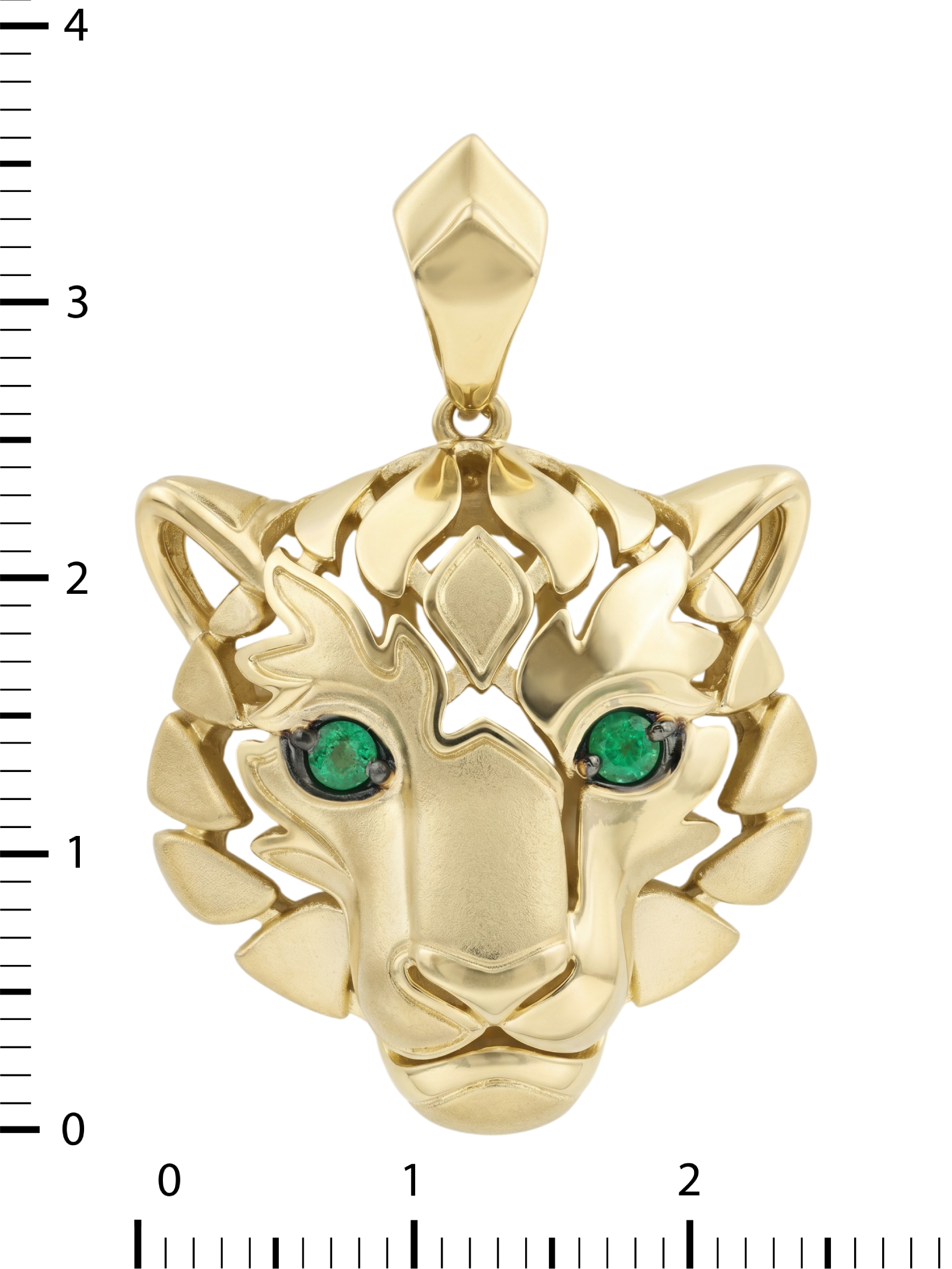 Центральным элементом композиции стали глаза хищника, инкрустированные двумя изумрудами круглой формы. Насыщенный зелёный цвет вставок в сочетании с теплым оттенком драгоценного металла придает изделию особое очарование и глубину. Гармоничные линии и проработанные детали позволяют подвеске выглядеть объемно и эффектно на любом типе цепи.