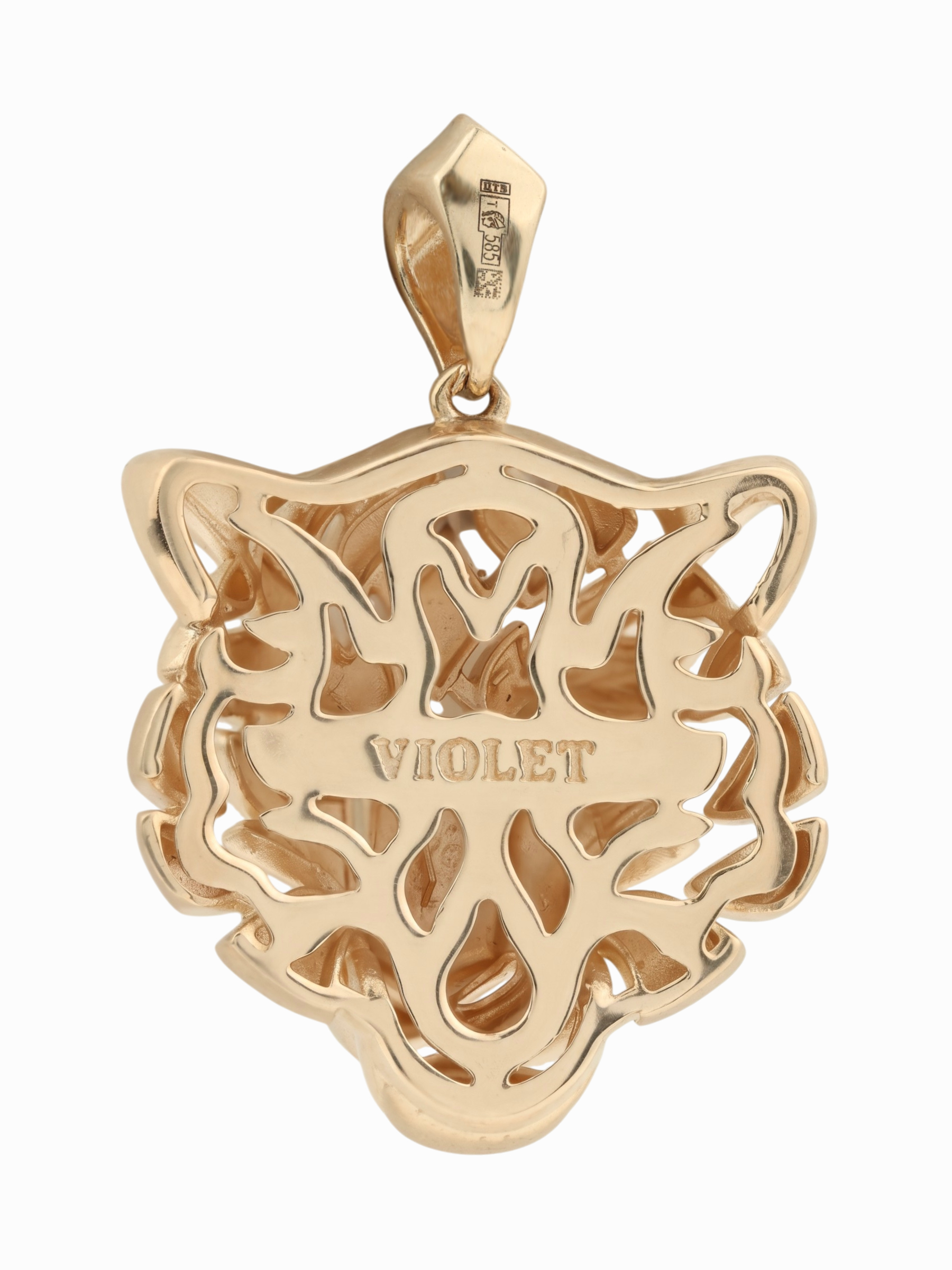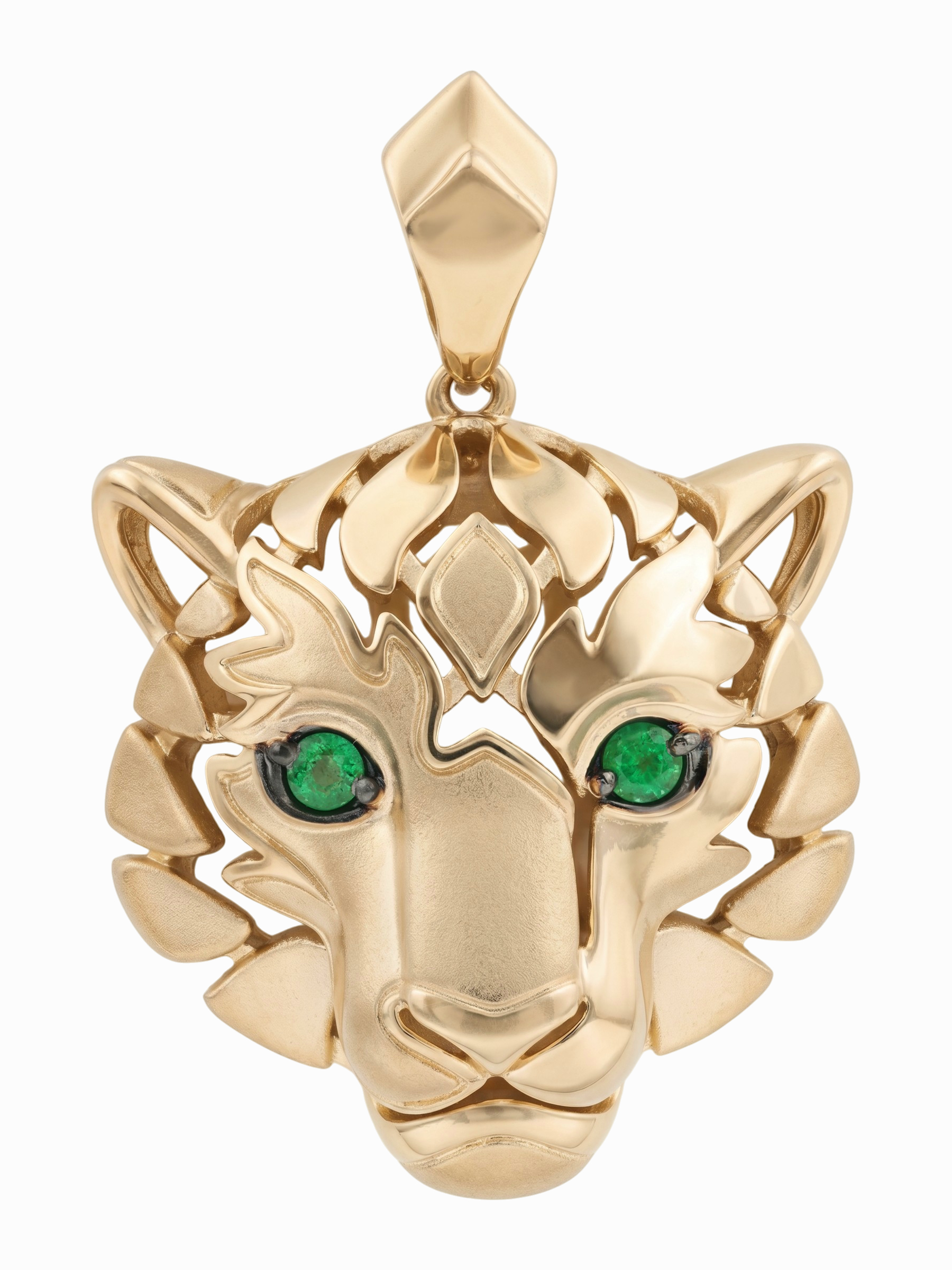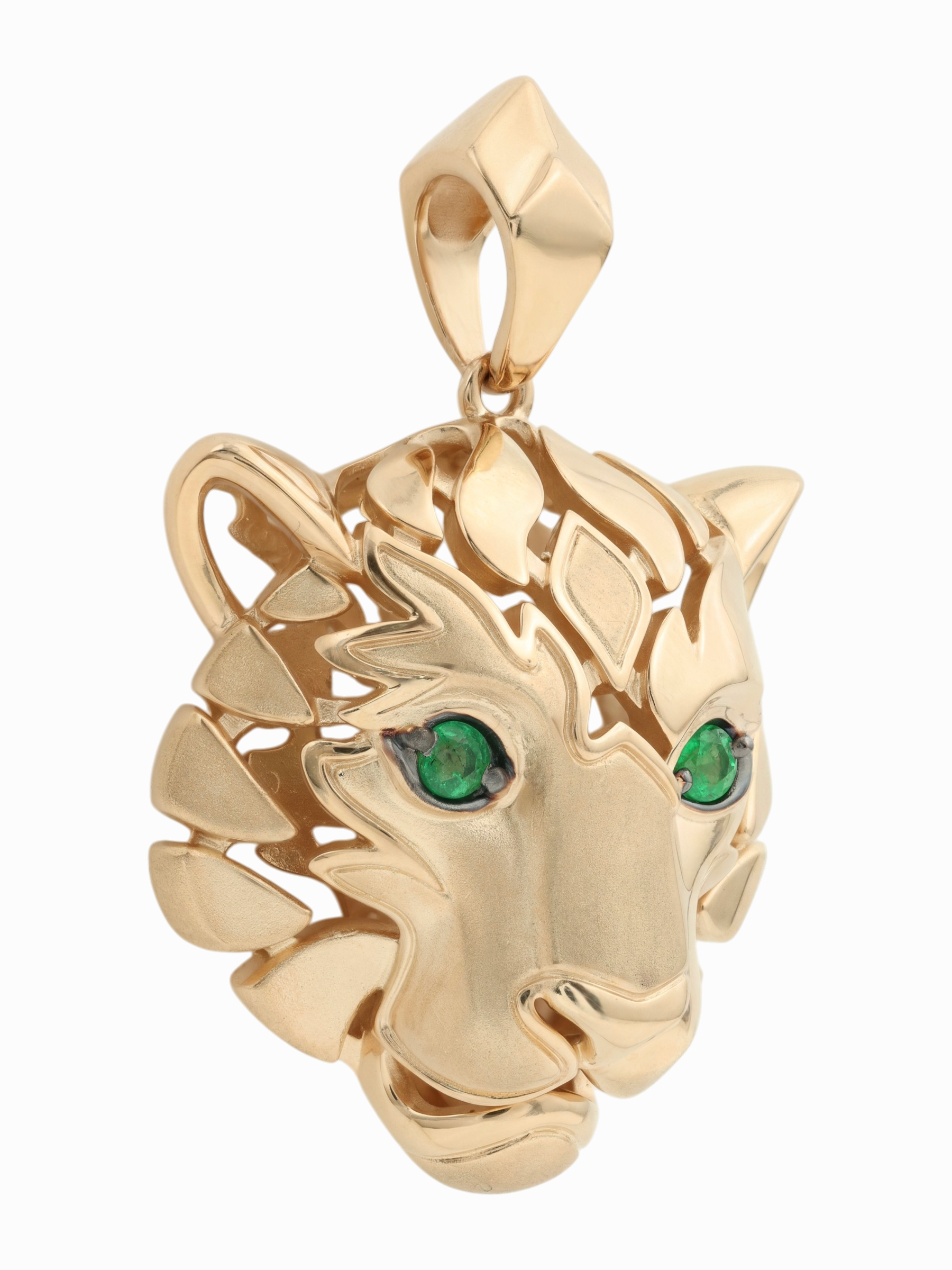 Взгляд хищника притягивает внимание благодаря двум глубоким изумрудам зеленого цвета круглой формы. Контраст между насыщенным цветом камней и сиянием красного металла делает этот аксессуар по-настоящему притягательным. Эта подвеска гармонично дополнит как повседневный, так и вечерний стиль, подчеркивая индивидуальность владельца.