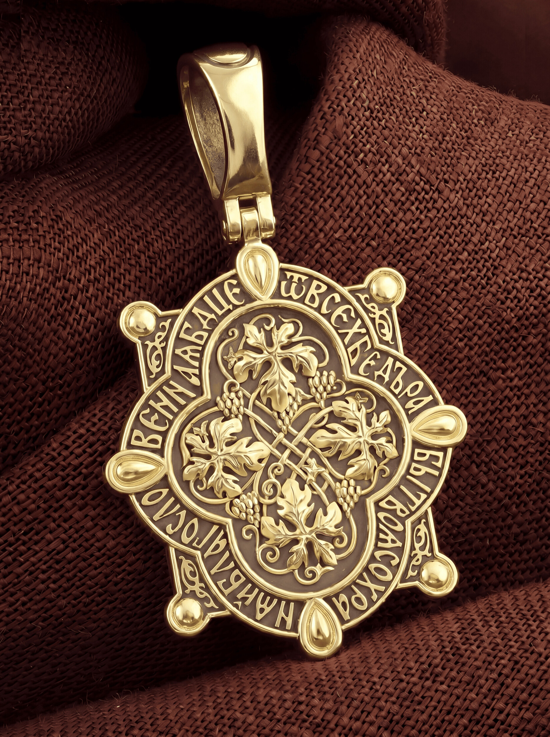 На оборотной стороне изображена виноградная лоза — символы церкви и евхаристии. «Я есмь лоза, — говорил Иисус Христос Своим ученикам, — а вы ветви; кто пребывает во Мне, и Я в нем, тот приносит много плода» (Ин. 15, 5), «Я есмь истинная виноградная лоза, а Отец Мой — виноградарь». Вокруг образка написаны слова моления к Пресвятой Богородице: «От всех бед рабы Твоя сохраняй, Благословенная Богородице!»