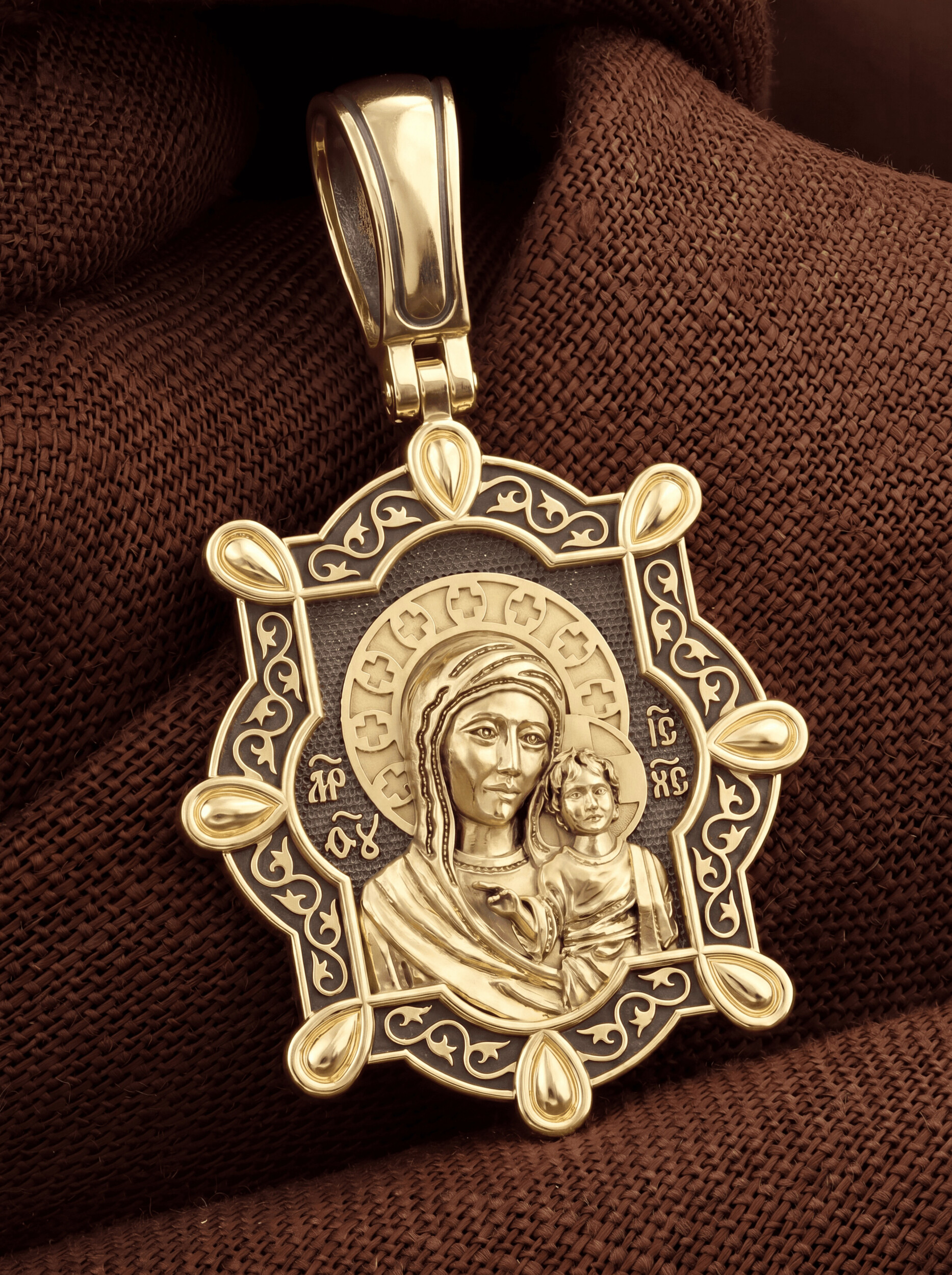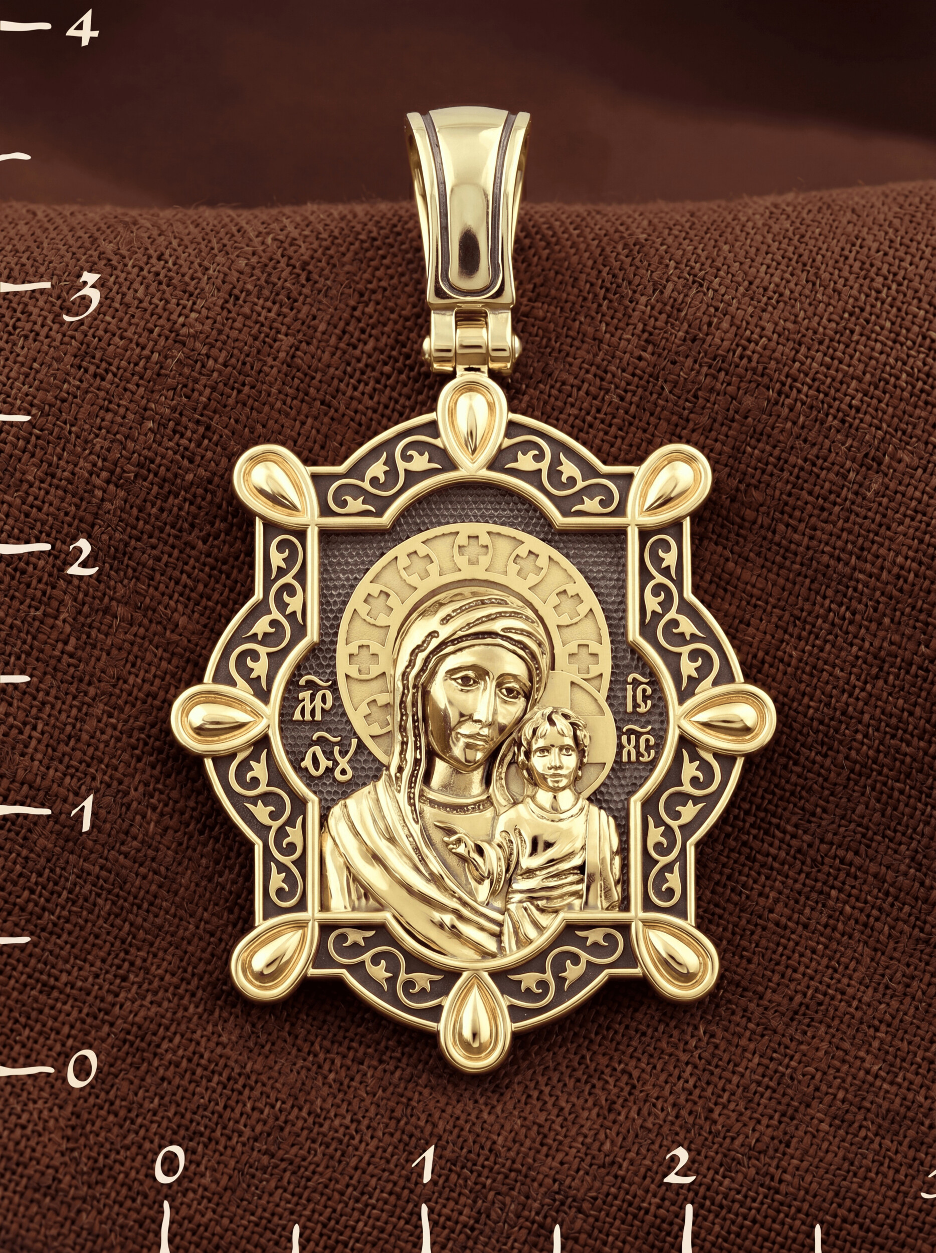 На лицевой части образка изображена Казанская икона Пресвятой Богородицы — одна из самых почитаемых в России чудотворных икон Богородицы. Богословское значение Казанской иконы — указать верующим истинный Путь к спасению, который лежит через Христа. Только Божия Матерь имеет настолько сильное дерзновение к Спасителю, что может ходатайствовать перед Ним за всех верных. Именно этот образ дарится новой повенчанной паре, как хранитель очага и семейная реликвия. Молитва перед Казанской иконой Божьей Матери помогает во всех сложных случаях жизни, в болезнях, во всех печалях, невзгодах, скорбях. Уникальная история появления, чудеса, случившиеся по молитвам православных людей возле образа — все это делает Казанскую Богородицу особенной, среди тысяч других икон.