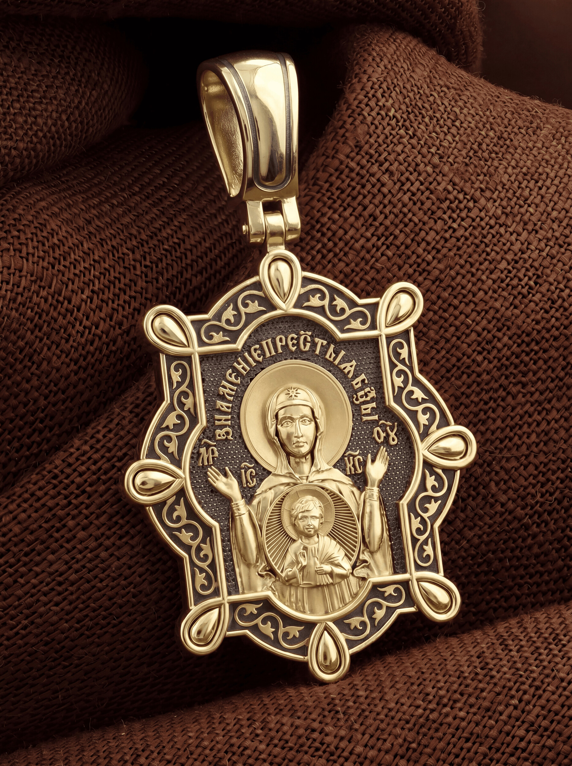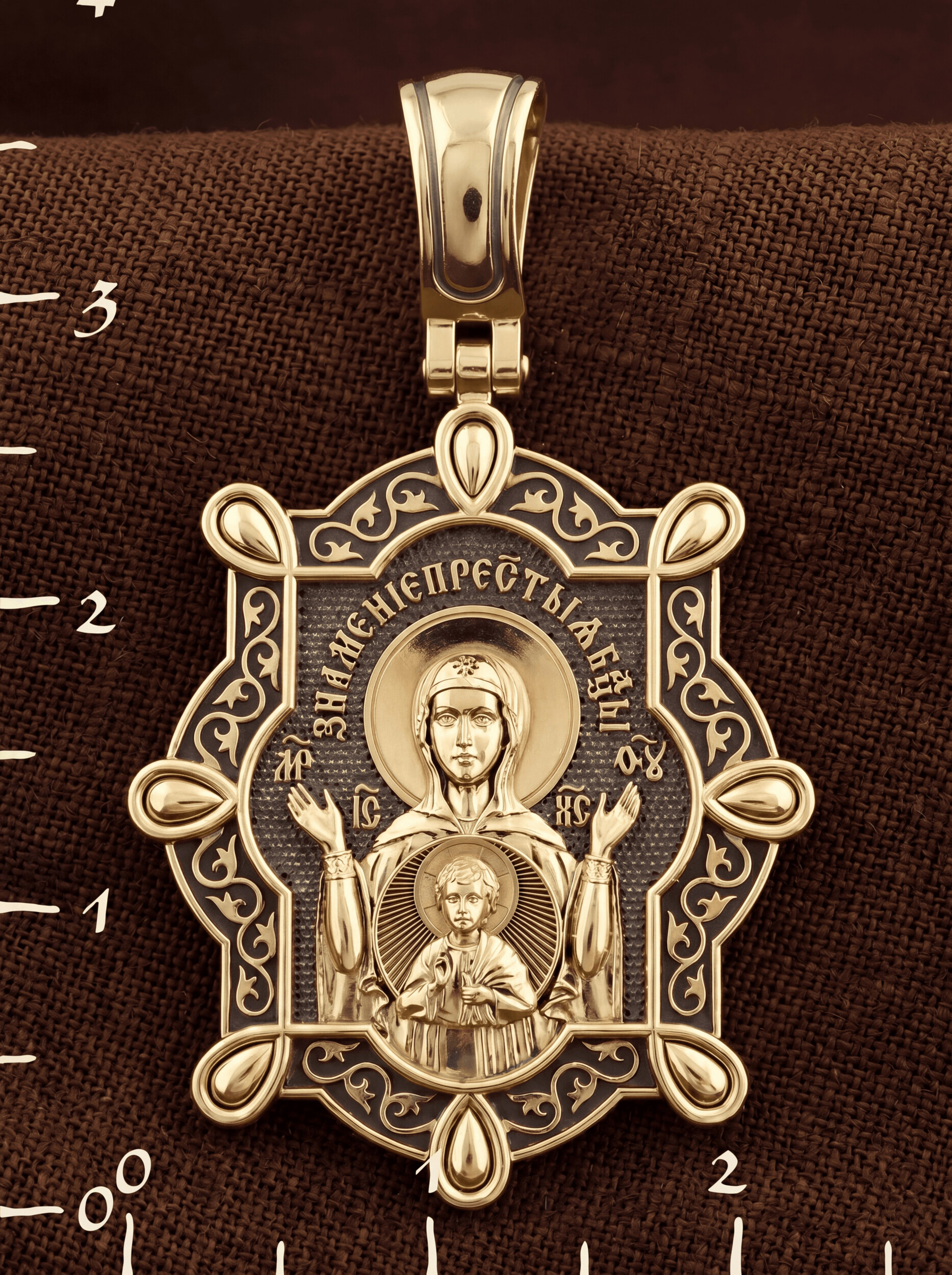 В центр образка помещен образ Божией Матери «Знамение», прославившийся многими чудесами в Новгороде в XII веке. Икона эта чтится как одна из самых великих святынь Русской земли. Молитвенно воздетые руки Богородицы означают заступничество за людей пред Богом. Рядом с Ней, на фоне круглого щита, — благословляющий Божественный Младенец — Спас-Эммануил.
