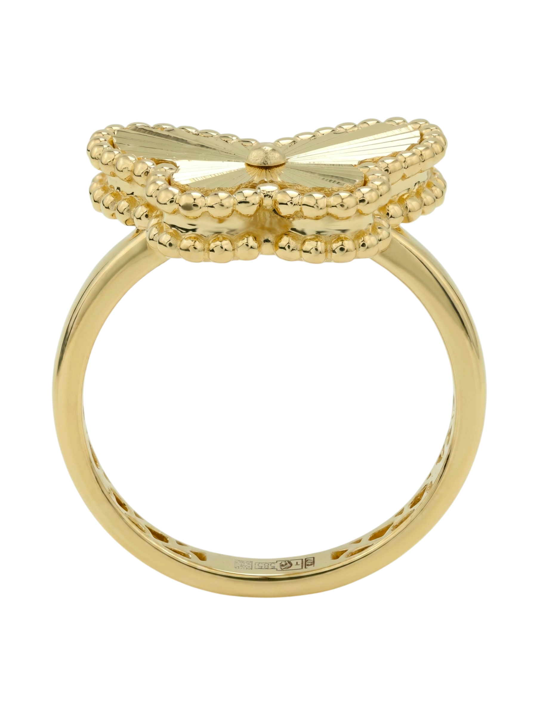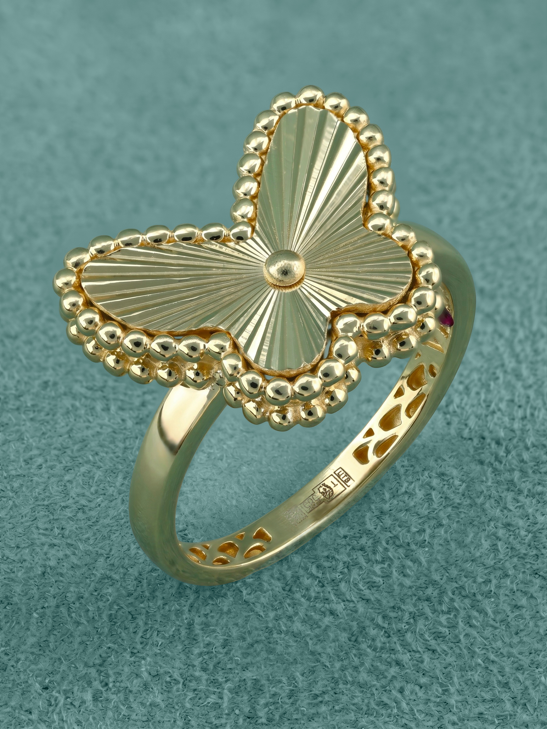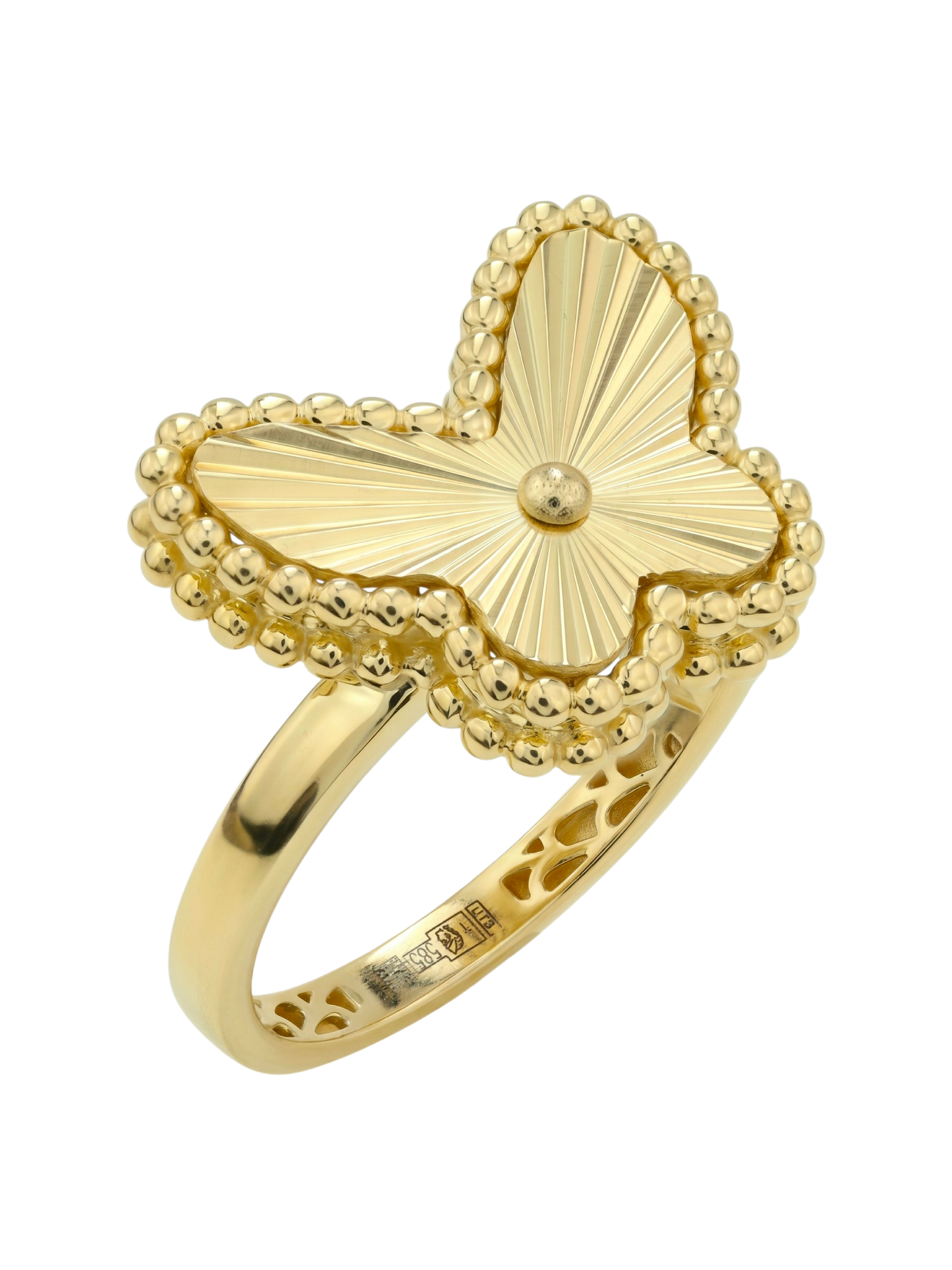 Элегантное кольцо из лимонного золота 585 пробы из коллекции Vioretty — Farfalla станет изысканным акцентом вашего образа. Дизайн украшения воплощает легкость и грацию, напоминая о природной красоте, где центральным элементом выступает декоративная бабочка, выполненная из сияющего лимонного металла. Детали изделия подчеркнуты изящной зернистой фактурой по контуру, что придает украшению объем и выразительность.