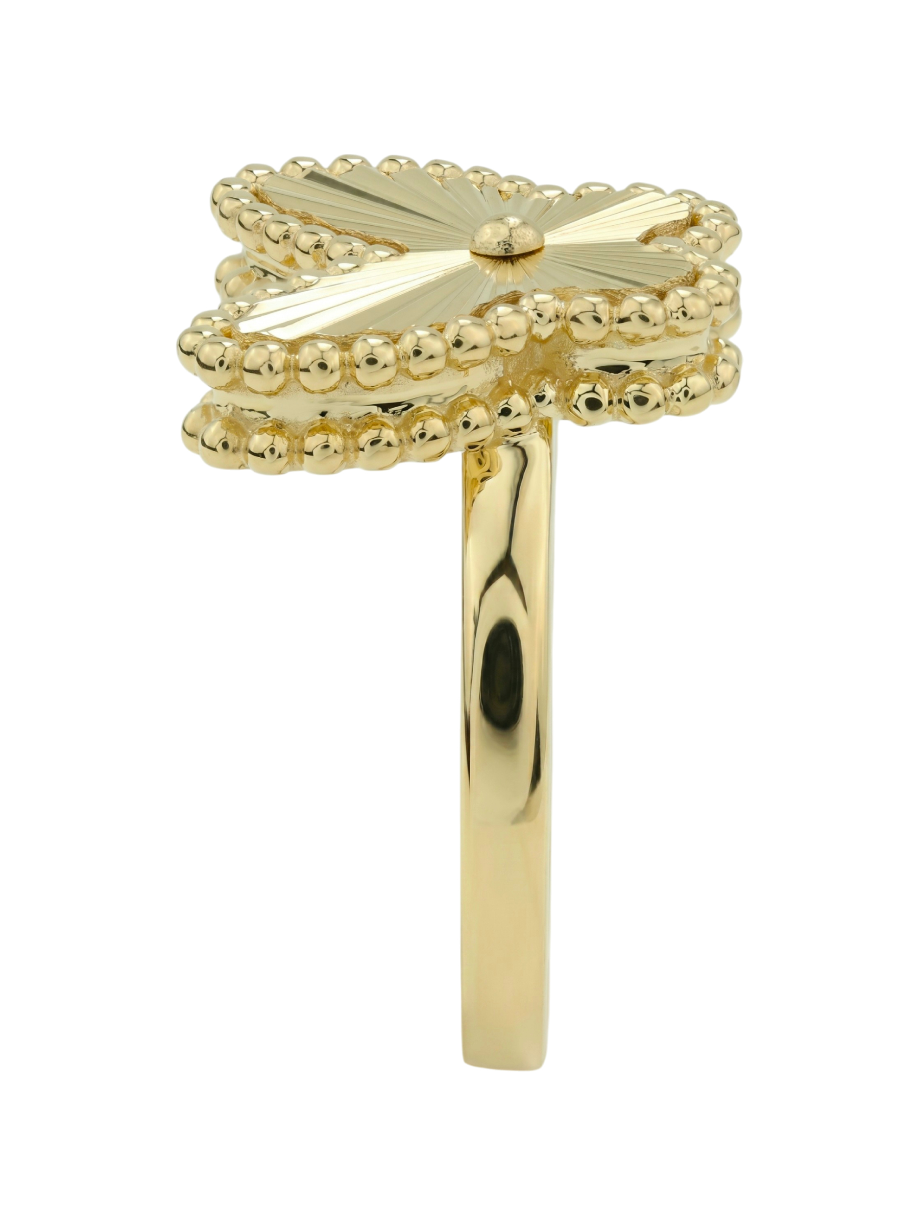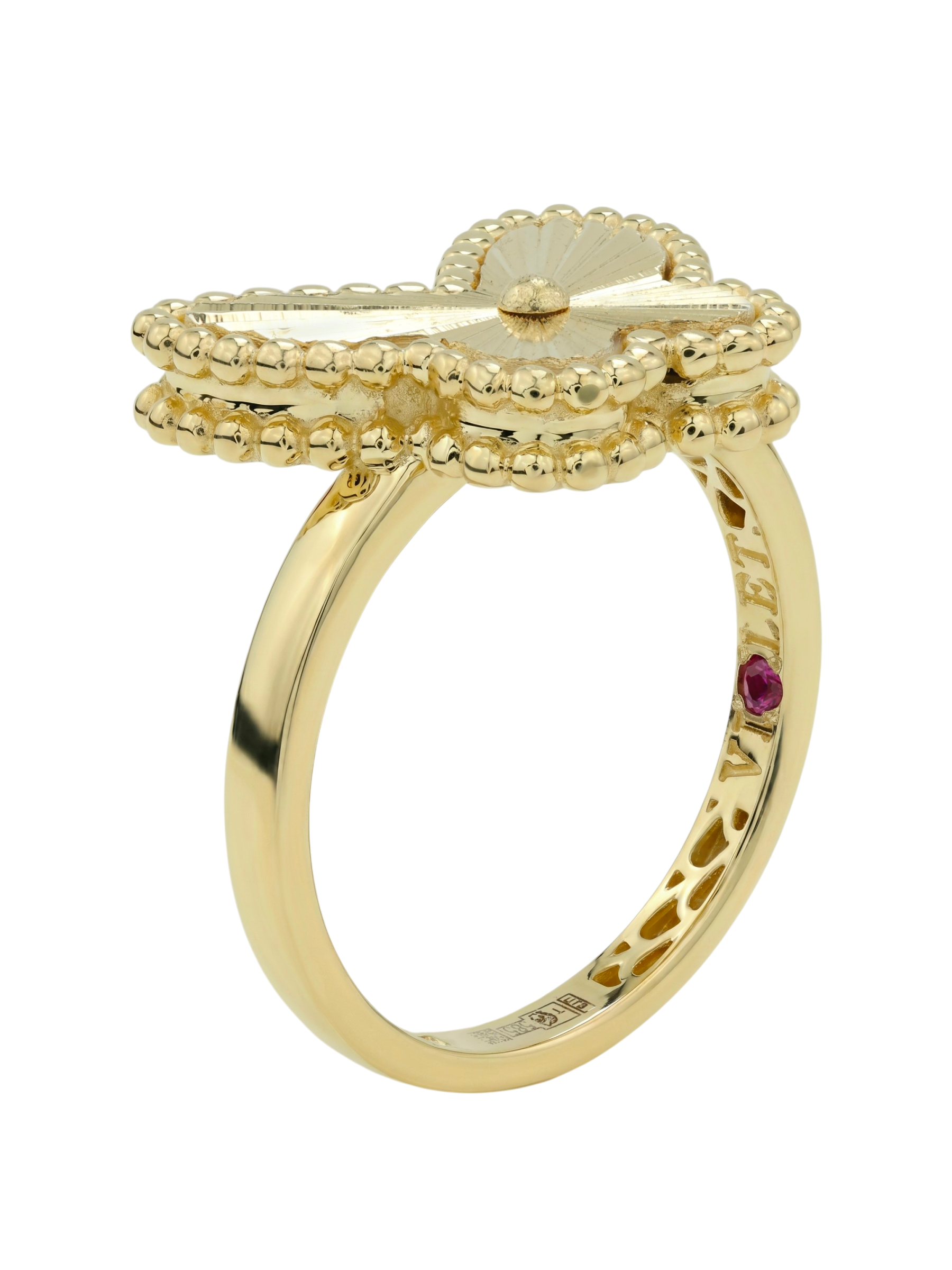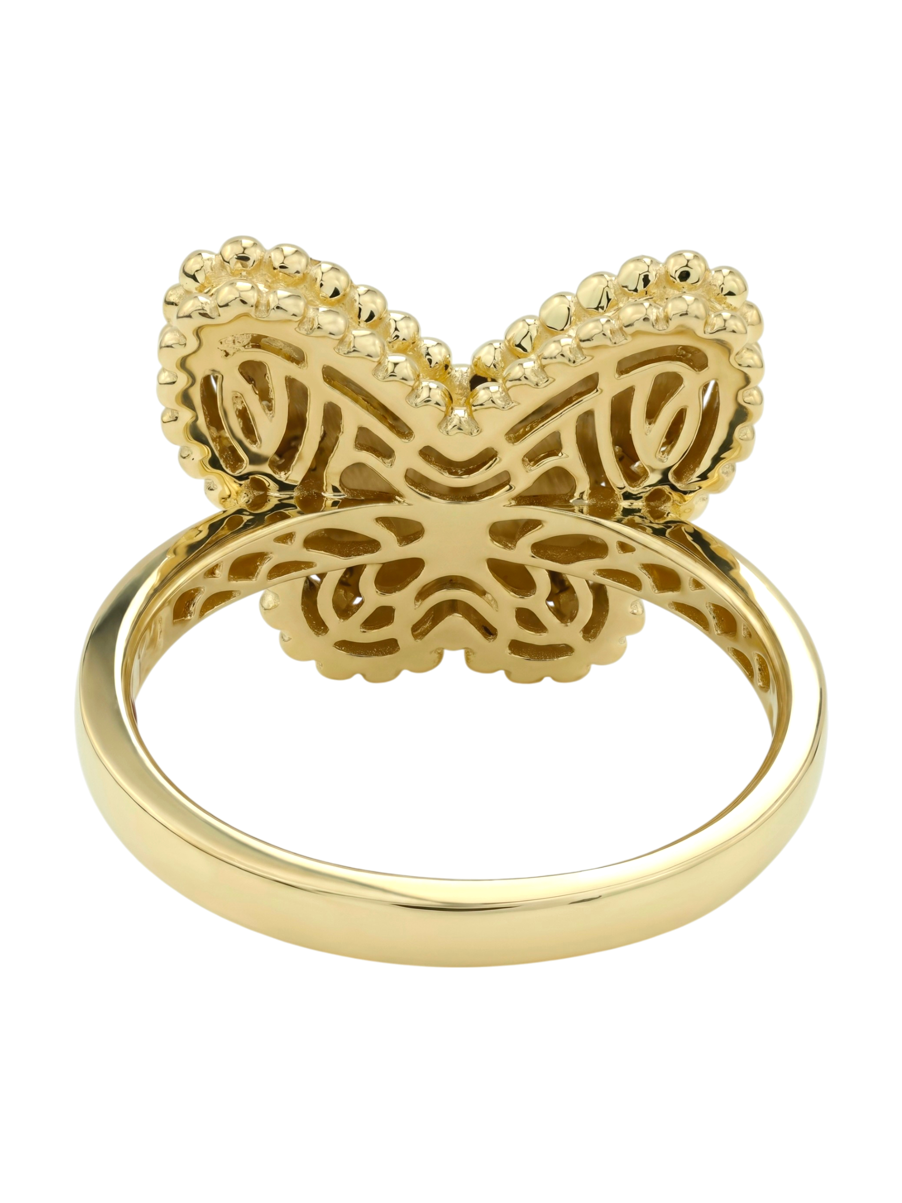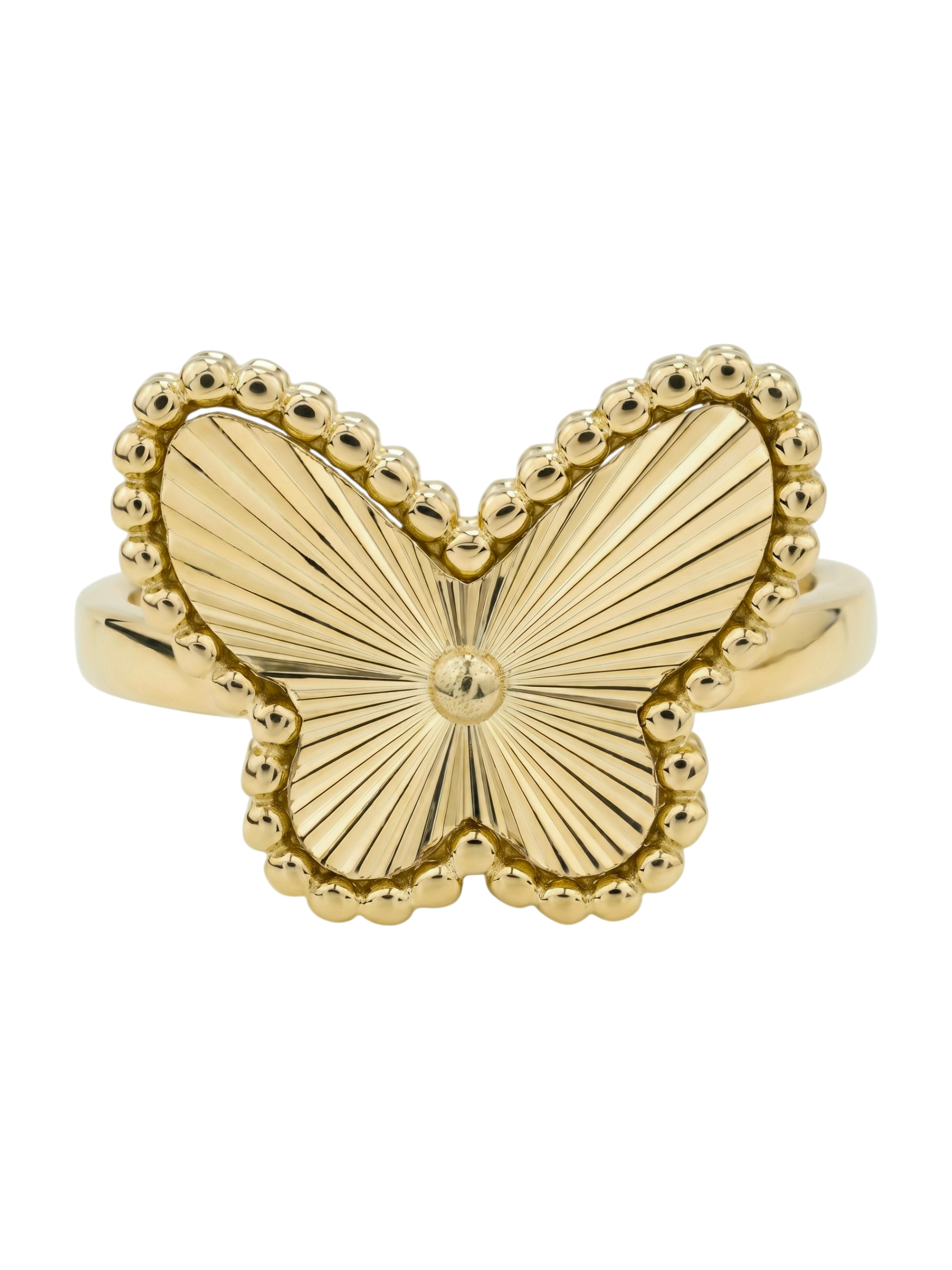 Элегантное кольцо из лимонного золота 585 пробы из коллекции Vioretty — Farfalla станет изысканным акцентом вашего образа. Дизайн украшения воплощает легкость и грацию, напоминая о природной красоте, где центральным элементом выступает декоративная бабочка, выполненная из сияющего лимонного металла. Детали изделия подчеркнуты изящной зернистой фактурой по контуру, что придает украшению объем и выразительность.