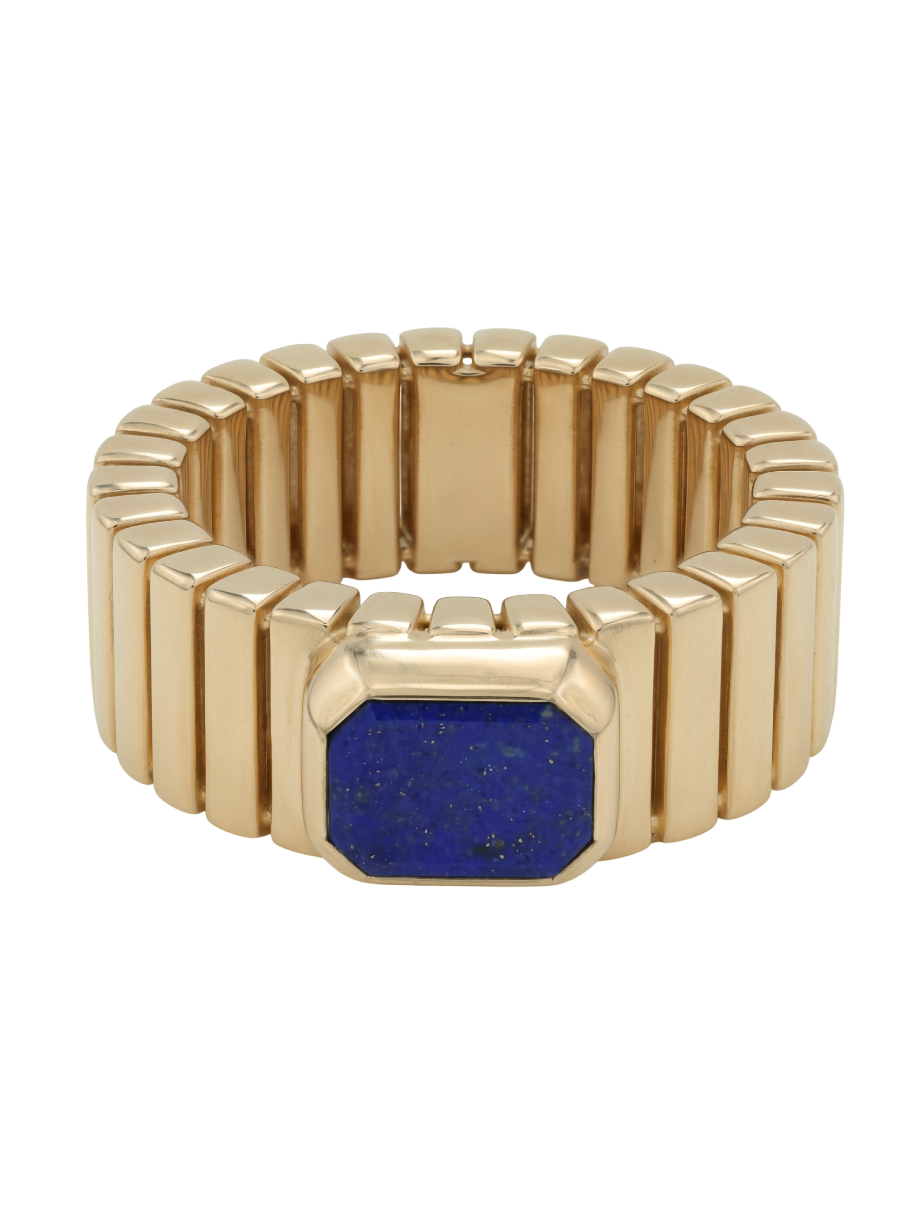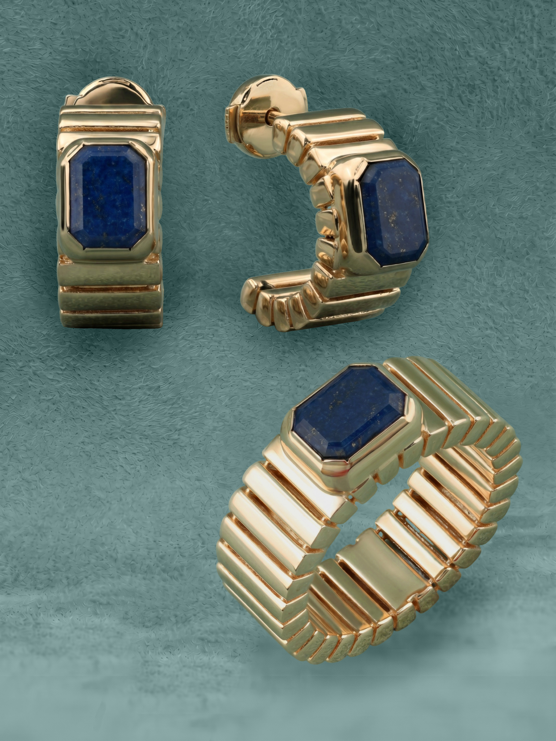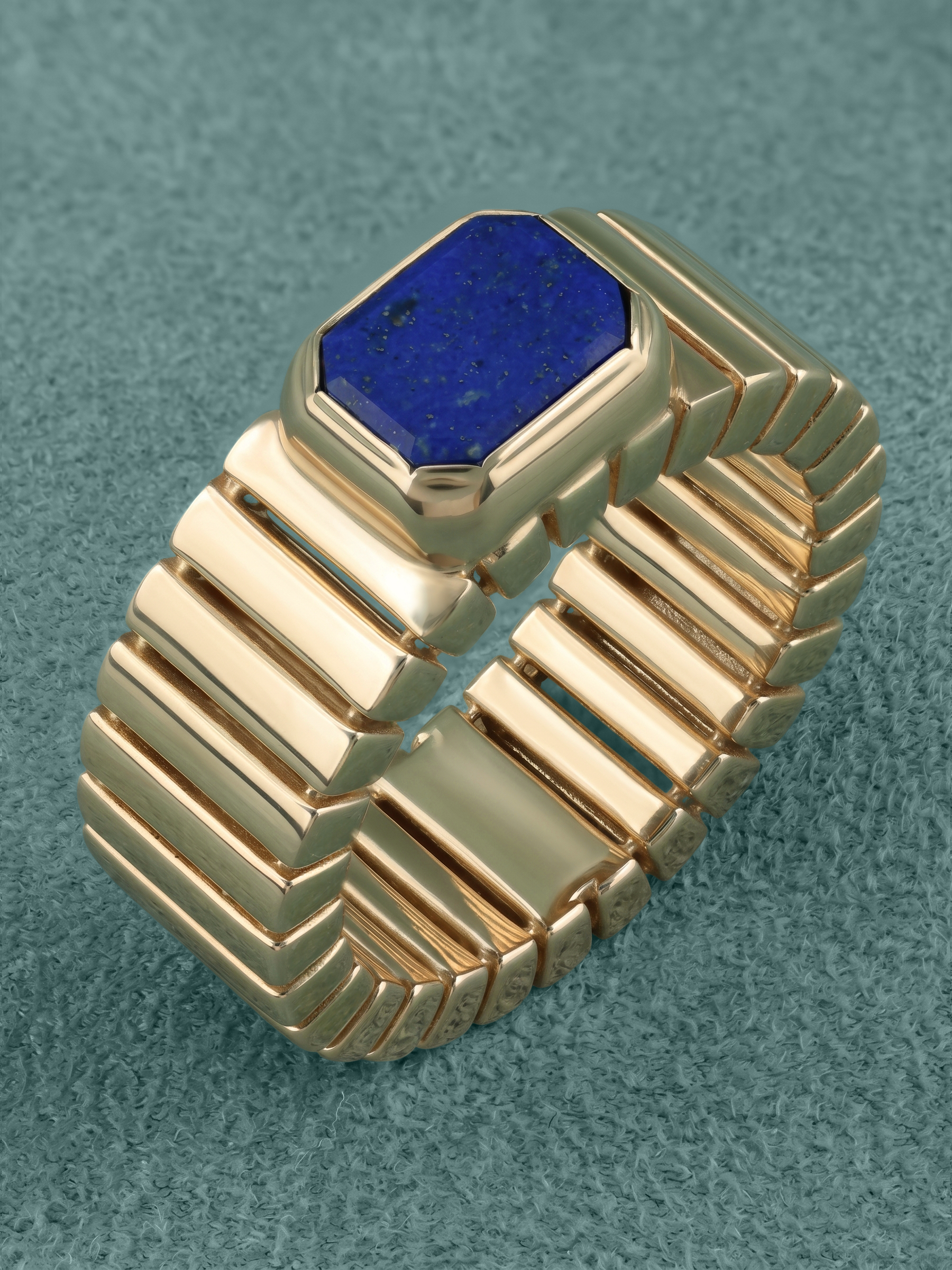 В центре композиции расположена крупная вставка из натурального лазурита глубокого синего цвета. Камень огранен в форму октагон, что придает изделию строгость и особый шарм. Яркий контраст между насыщенным оттенком лазурита и теплым блеском красного золота делает это кольцо универсальным аксессуаром, способным дополнить как деловой костюм, так и вечерний наряд. В изделии используется одна вставка, закрепленная надежно и эстетично.