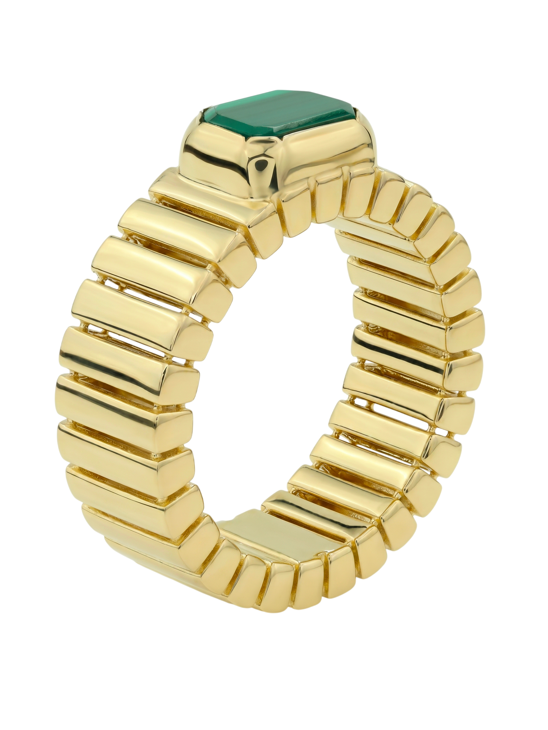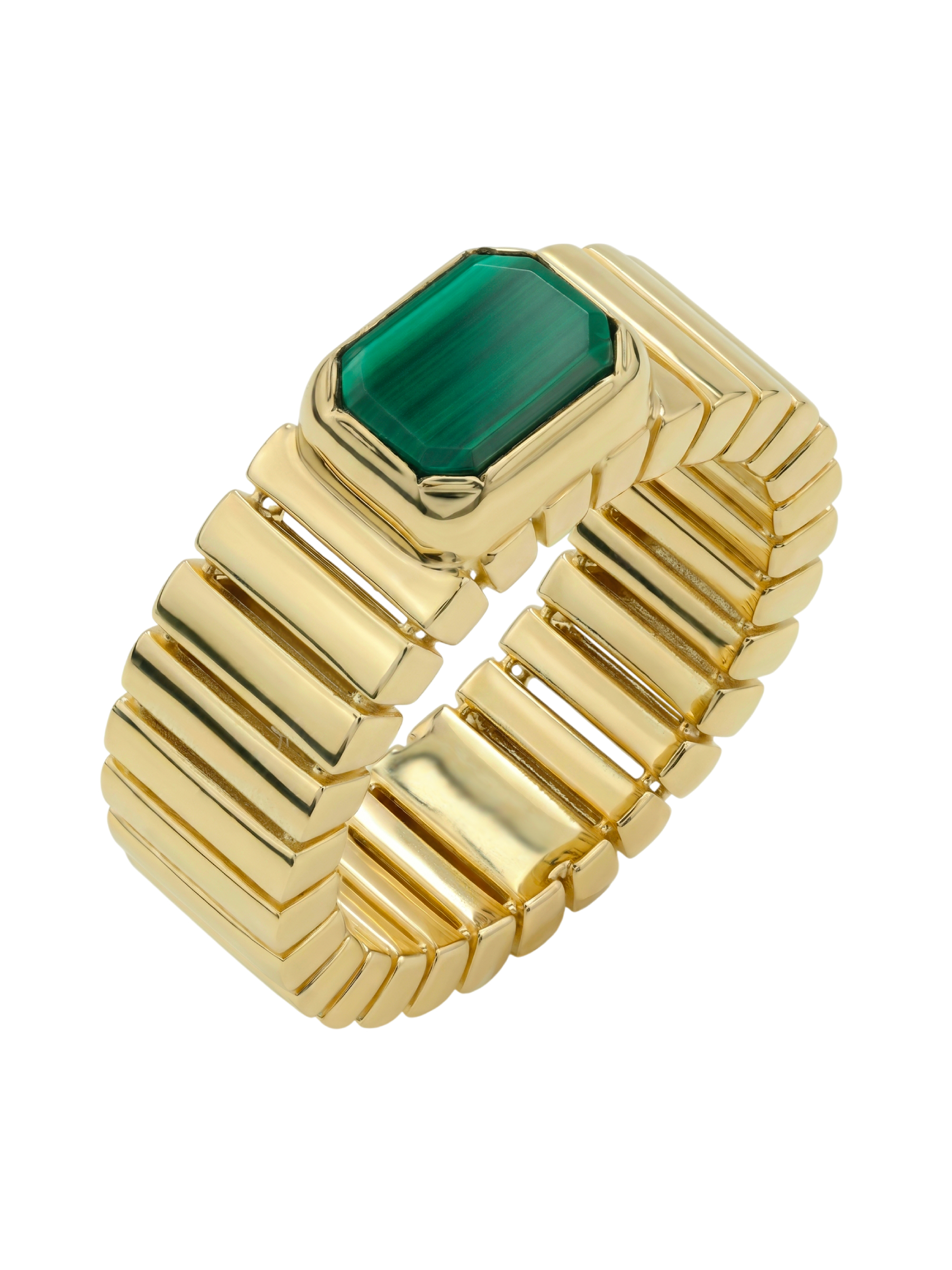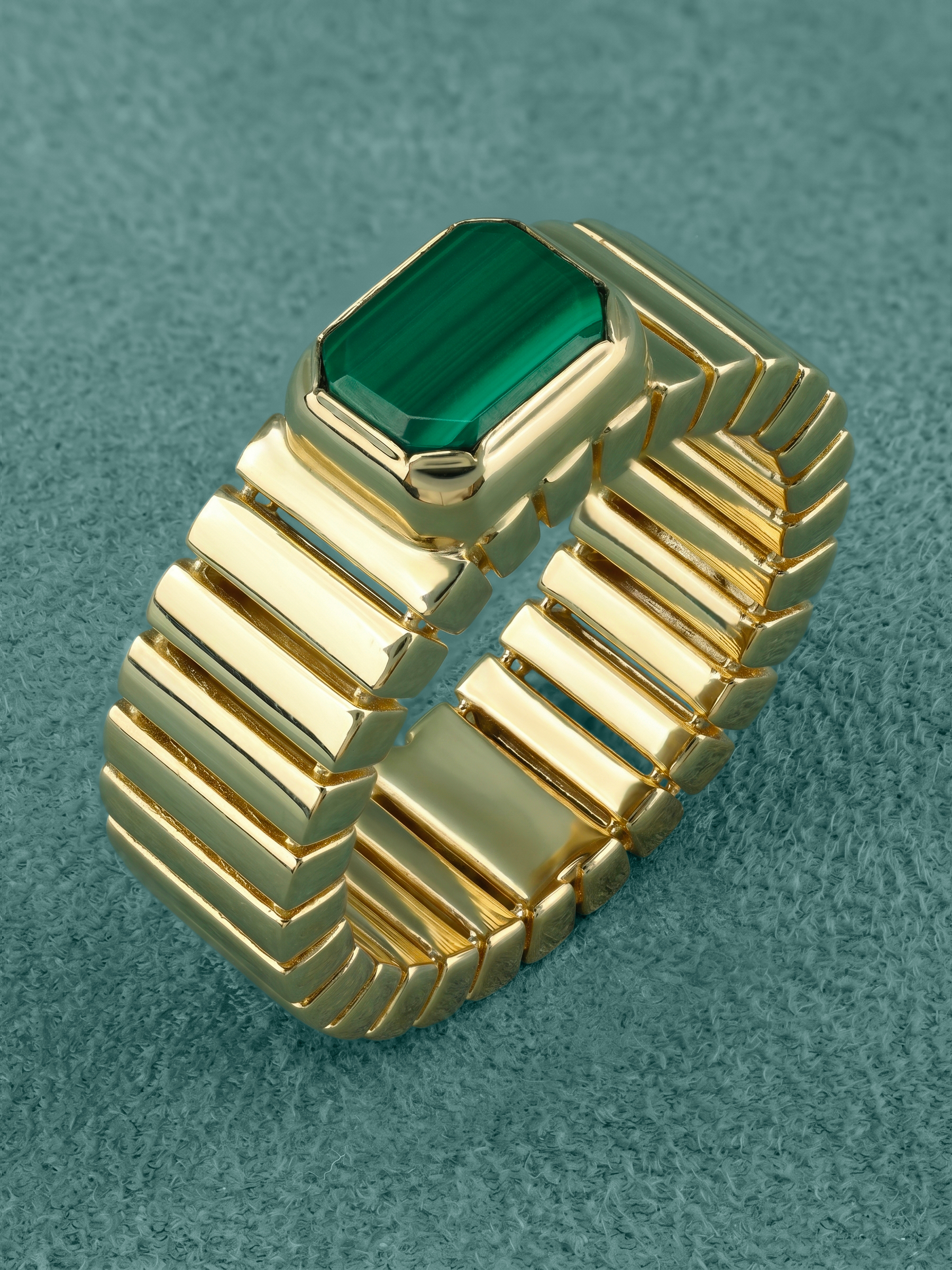 Массивный дизайн шинки, выполненный в геометрическом стиле, подчеркивает статусность и уверенный характер изделия. Это кольцо гармонично дополняет как женский, так и мужской гардероб, предлагая универсальное решение для тех, кто ценит лаконичность и архитектурные формы в ювелирном искусстве. Единственная вставка из малахита акцентирует внимание на безупречной работе мастеров и качестве используемых материалов.