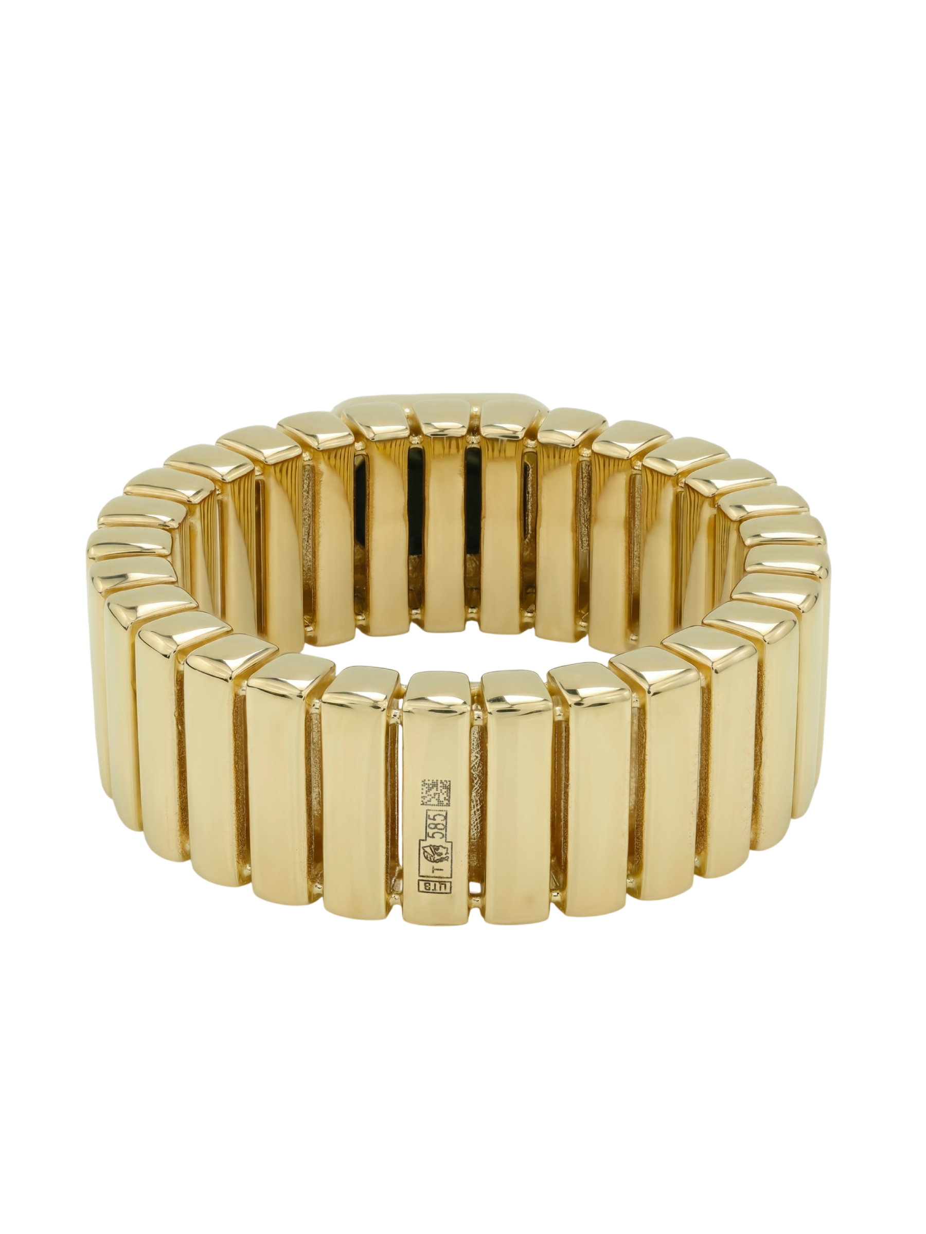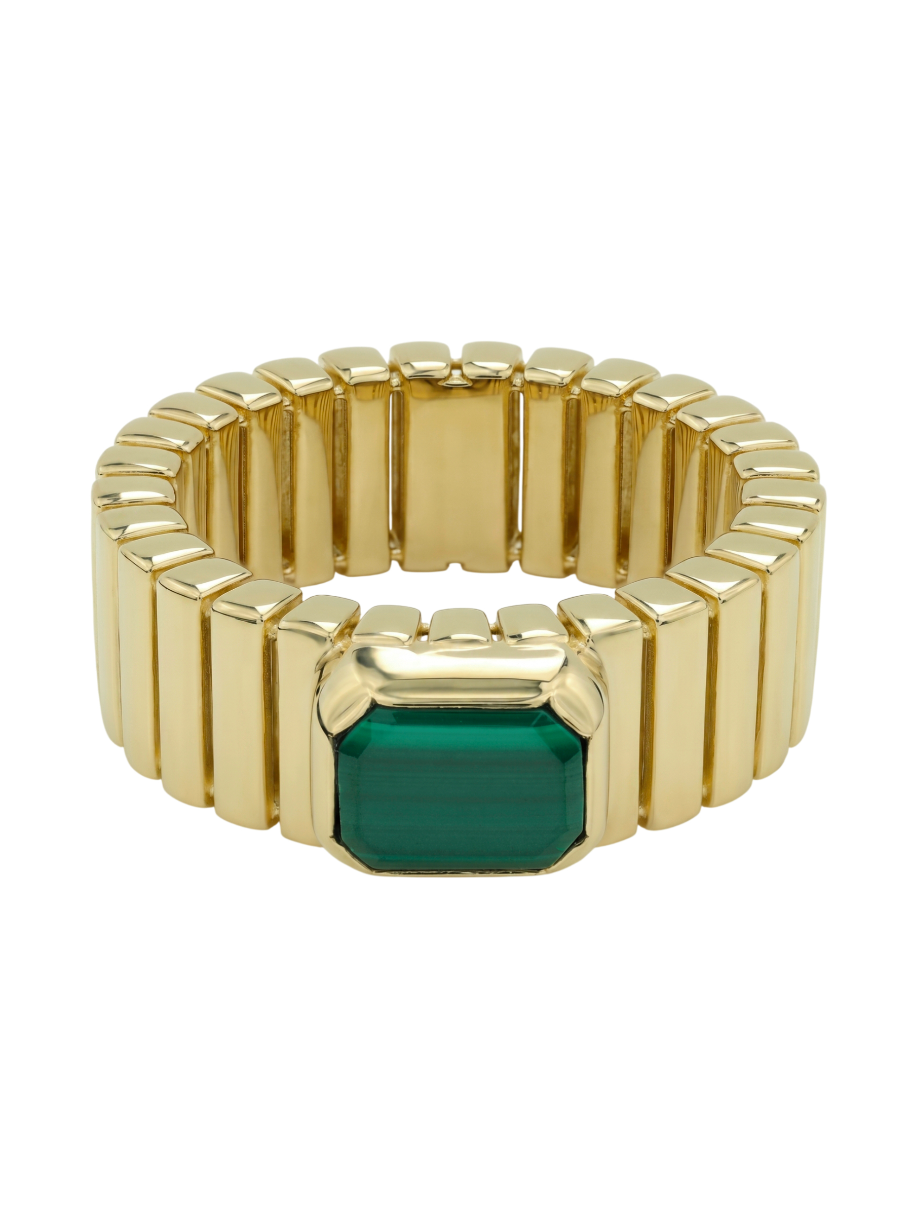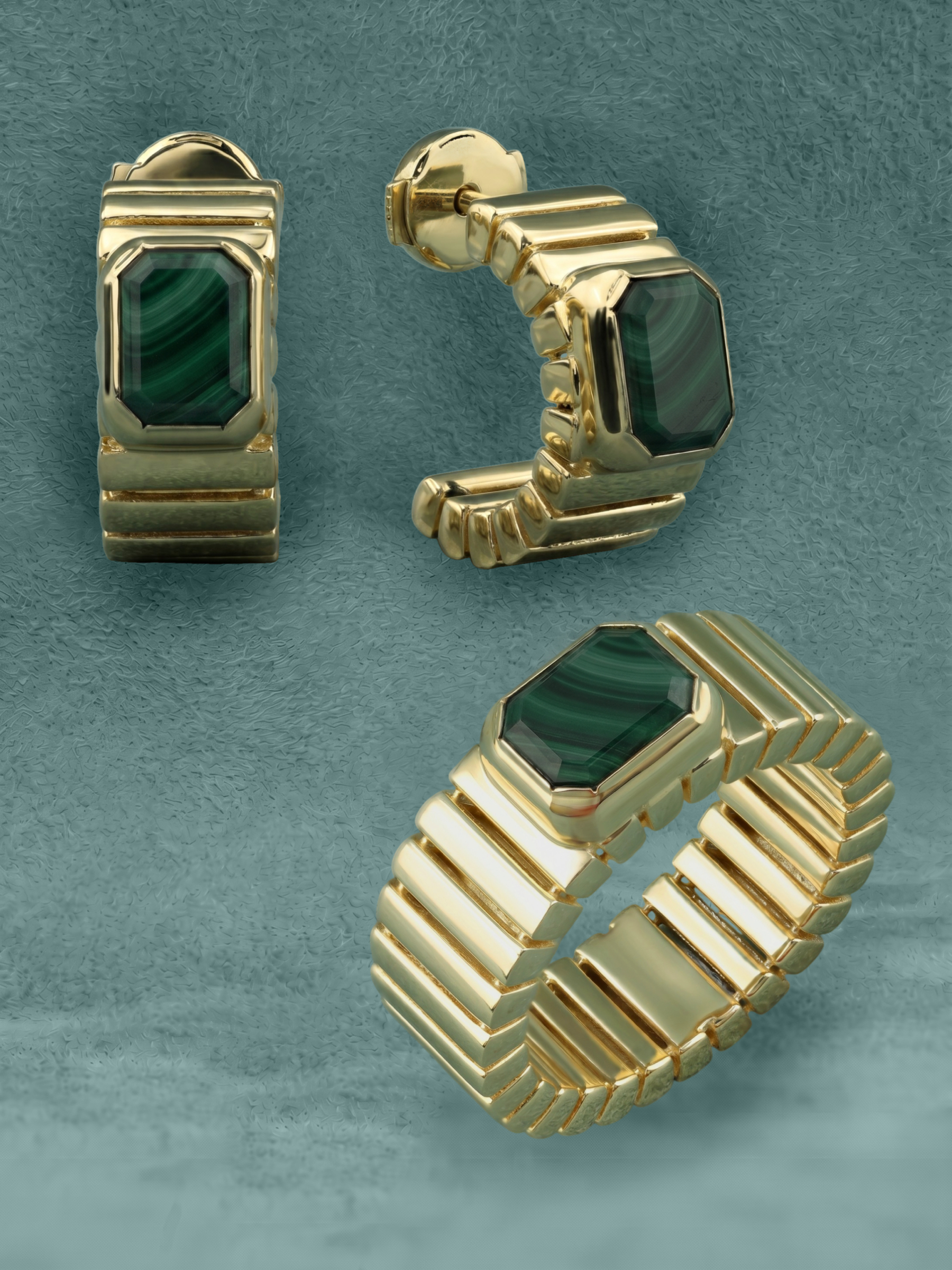 Массивный дизайн шинки, выполненный в геометрическом стиле, подчеркивает статусность и уверенный характер изделия. Это кольцо гармонично дополняет как женский, так и мужской гардероб, предлагая универсальное решение для тех, кто ценит лаконичность и архитектурные формы в ювелирном искусстве. Единственная вставка из малахита акцентирует внимание на безупречной работе мастеров и качестве используемых материалов.