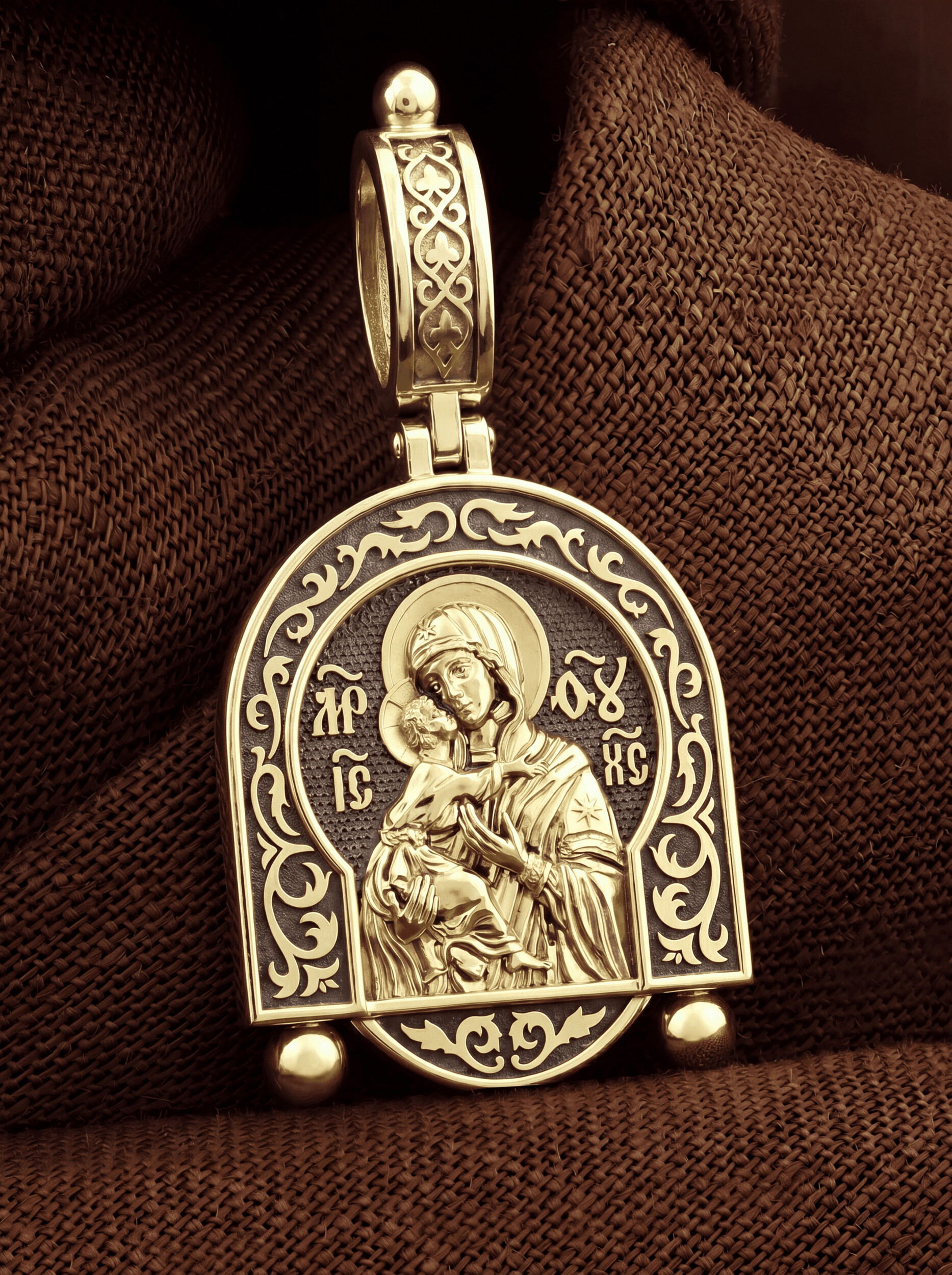 Лицевую сторону возглавляет Владимирская икона Божией Матери — самая Великая русская Святыня, многие века бывшая олицетворением нашей земли. Перед ней венчались на царство государи, избирались патриархи. Пречистой Богородице Владимирской клялись в верности Отечеству солдаты и за нее умирали на поле брани. Именно на ее защиту более всего уповала Россия в самые страшные периоды своей истории. Владимирская икона Божией Матери, по преданию, была написана на доске трапезного стола из дома Иисуса Христа. На Русь она была привезена в начале XII века и с тех пор почитается как главная святыня нашего Отечества. Перед ней молитвенно просят Богородицу об исцелении от телесных недугов, в частности, заболеваний сердца и сердечнососудистой системы. За помощью к ней обращаются во время бедствий, когда нуждаются в защите от врагов.