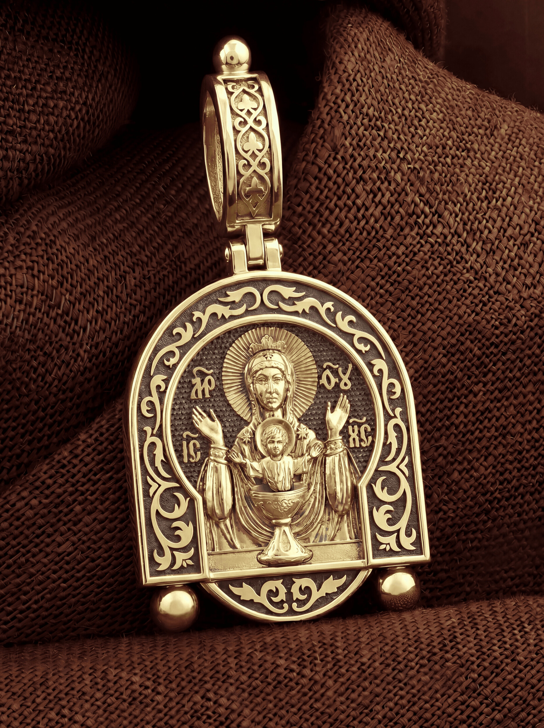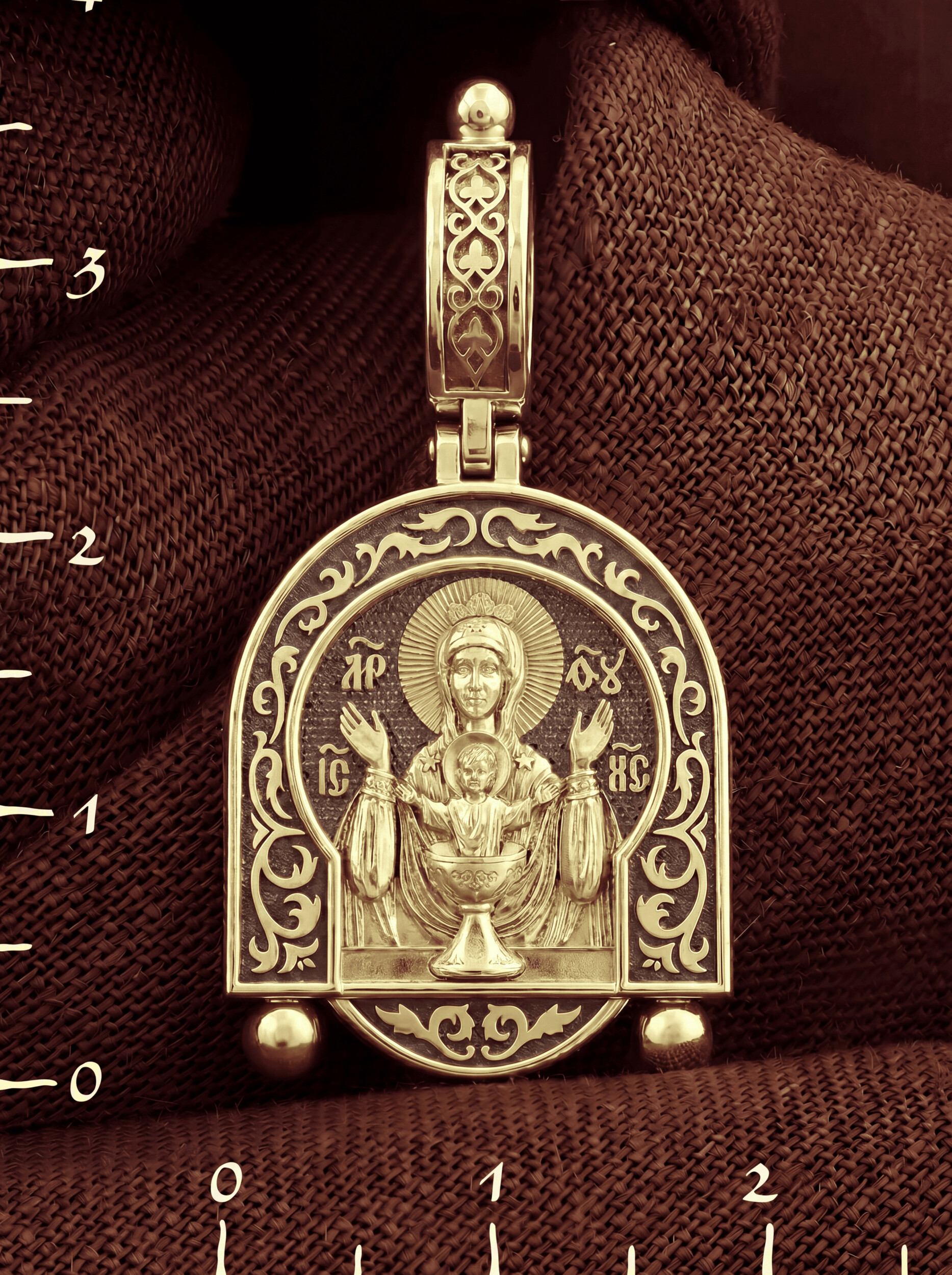 На лицевой части образка изображена икона Божией Матери «Неупиваемая чаша». Икона славится помощью в исцелении зависимостей, помогает людям обрести свободу от греховных страстей.