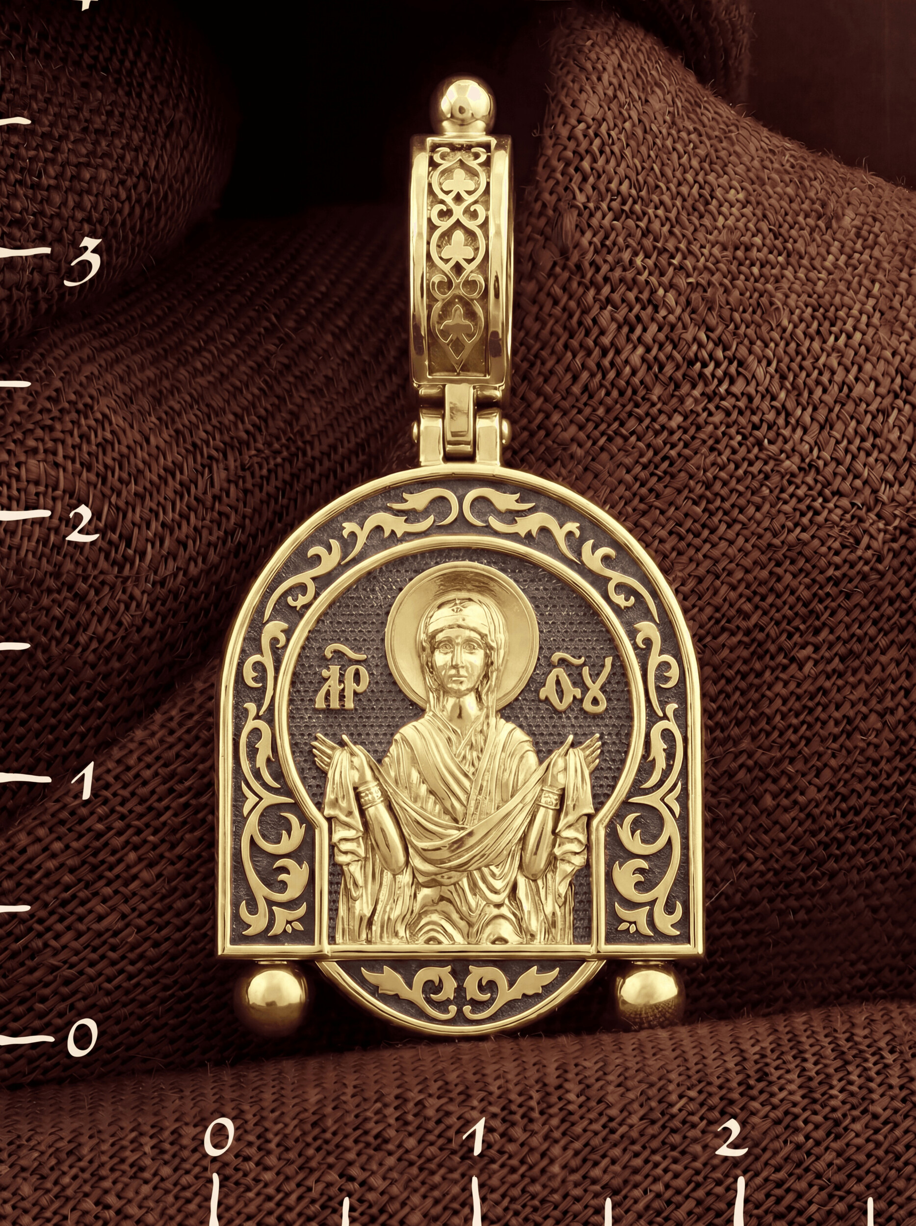 На лицевой части образка изображена икона Покров Пресвятой Богородицы. Праздник Покрова Божией Матери является воспоминанием чуда, которое произошло во Влахнернской церкви 1 (14) октября 910 года: Пресвятая Богородица явилась верующим над алтарем храма и распростерла над ними Свое покрывало. В этот день Божья Матерь открыла людям, что Она является Ходатаицей за них перед Богом. Богородица простирает Свой молитвенный покров над всеми православными христианами и умоляет Сына Своего о даровании вечного спасения каждому человеку.