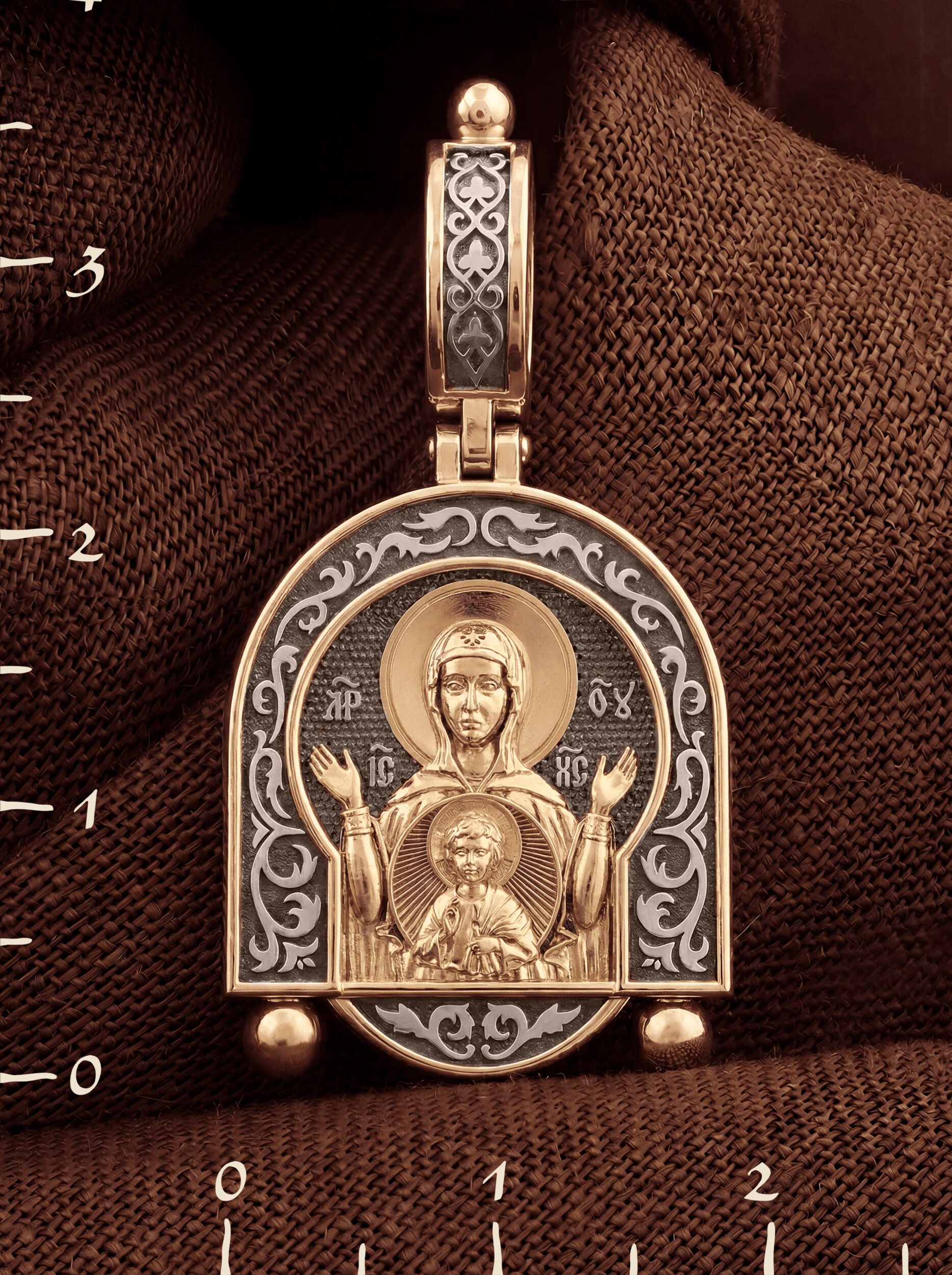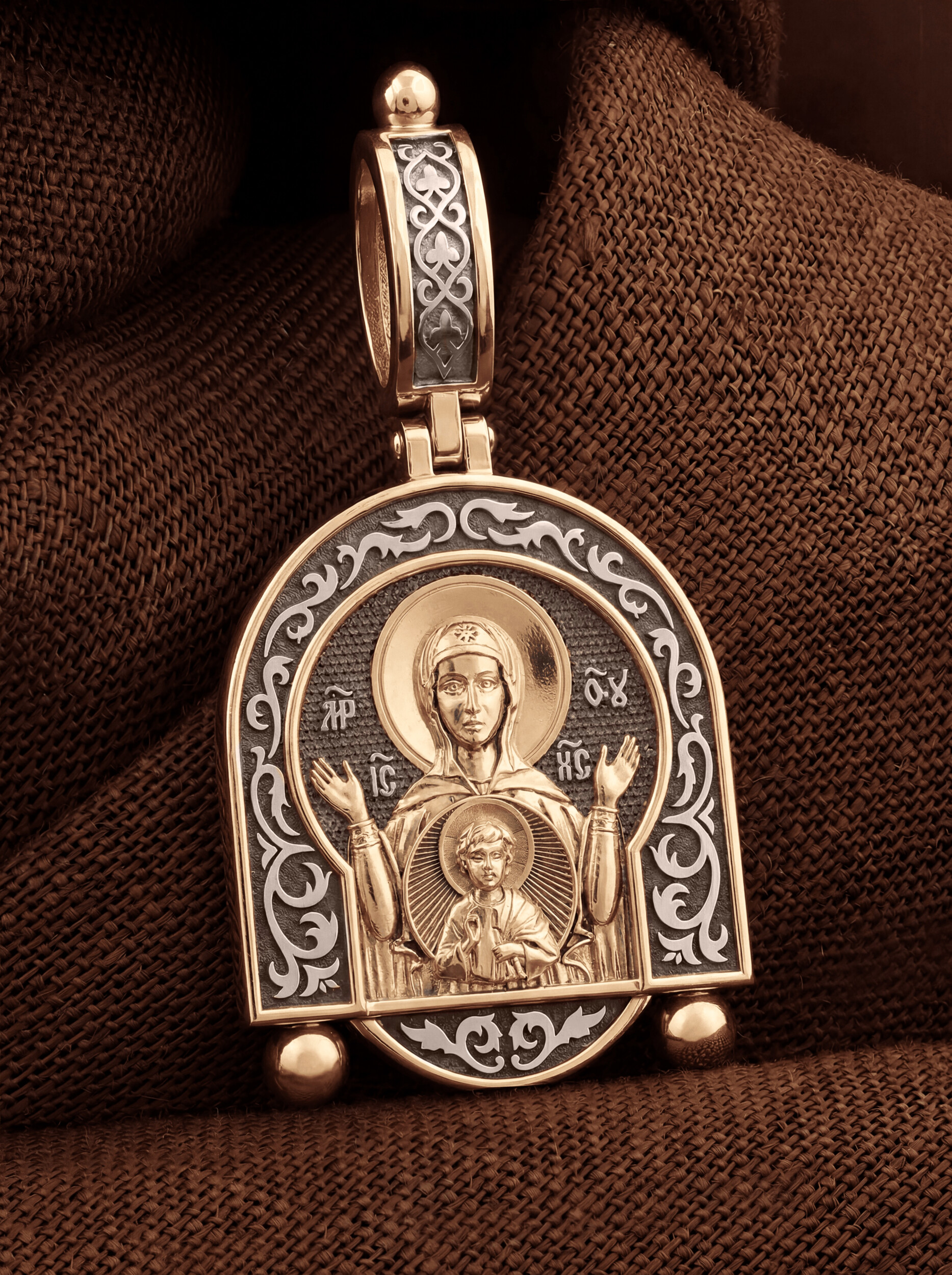 В центр образка помещен образ Божией Матери «Знамение», прославившийся многими чудесами в Новгороде в XII веке. Икона эта чтится как одна из самых великих святынь Русской земли. Молитвенно воздетые руки Богородицы означают заступничество за людей пред Богом. Рядом с Ней, на фоне круглого щита, — благословляющий Божественный Младенец — Спас-Эммануил.
